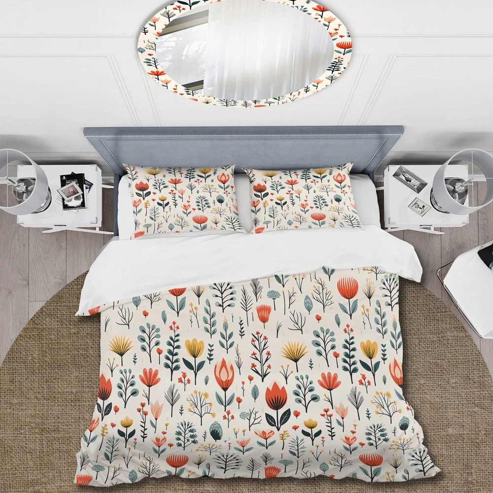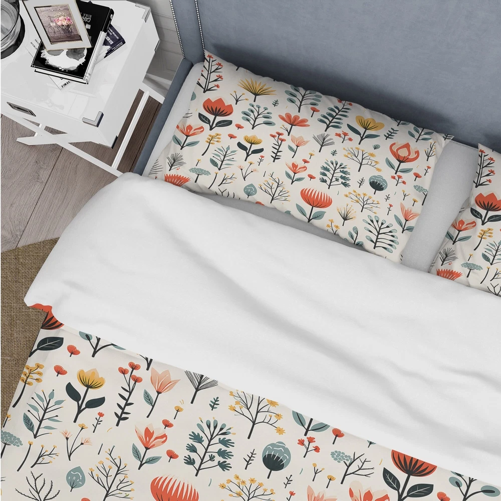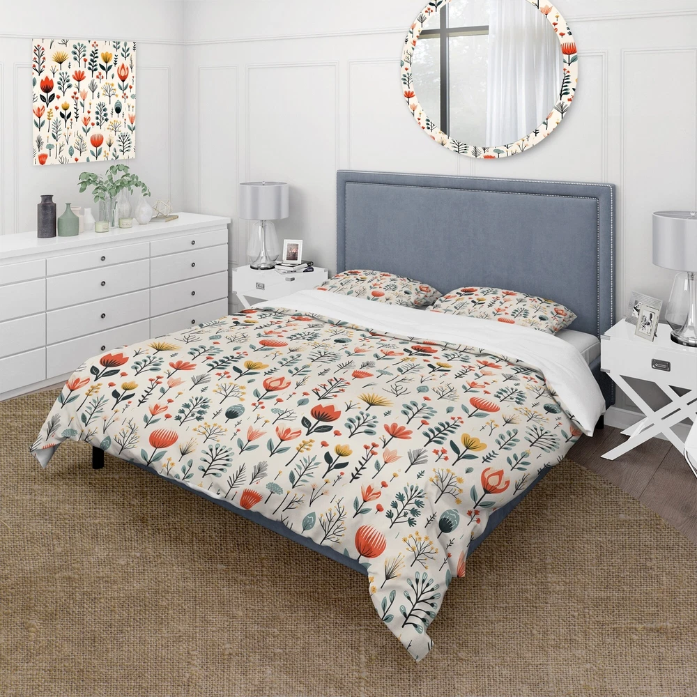 There is just nothing better than a beautiful, inviting comfortable bed after a long day. This Floral bed set is created using the richest colors stemming from high density Italian ink and the softest fabrics making it the perfect way to spruce up your bedroom, while keeping it ultra-comfortable. This luxurious Simplicity Nordic Red Floral Dreams II bed design is made with 100% microfiber polyester, making it ultra-soft to ensure you sleep comfortably all night long. This Cottage set includes 1 Bed Cover and 2 Shams and is available in twin, queen and king sizes.This Bedding Set is easily integrated into your already decorated space.What's Included? - Duvet Cover - Shams - Pillow Cases not included but can be buy separately - Comforter Insert NOT INCLUDEDFeatures - Free Shipping Over $49.99* Details Designart "Simplicity Nordic Red Floral Dreams II" Teal Cottage Bed Cover Set Product Description: There is just nothing better than a beautiful, inviting comfortable bed after a long day. This Floral bed set is created using the richest colors stemming from high density Italian ink and the softest fabrics making it the perfect way to spruce up your bedroom, while keeping it ultra-comfortable. This luxurious Simplicity Nordic Red Floral Dreams II bed design is made with 100% microfiber polyester, making it ultra-soft to ensure you sleep comfortably all night long. This Cottage set includes 1 Bed Cover and 2 Shams and is available in twin, queen and king sizes. This Bedding Set is easily integrated into your already decorated space. What's Included? - Duvet Cover - Shams - Pillow Cases not included but can be buy separately - Comforter Insert NOT INCLUDED Features - Printed using High Density Italian Ink making the colors extra vibrant. - Made from ultra-soft, lightweight 100% microfiber polyester. Wrinkle resistant fabric. Down-like comfort, odorless. - The Cottage bed set includes one bed cover and two standard pillow shams to create a complete and stylish look. - The elegant and soft colors are both trendy and fun to brighten and update your bedroom. - Made in Canada - Decorative Wall Art and throw pillows to match this set are available but sold separately. - Actual comforter inserts and pillow inserts are not included. This set includes the two pillow shams and comforter cover only. King Dimensions: - 1 Duvet Cover104 inches wide x 88 inches long - 2 King Shams20 inches wide x 36 inches long Queen Dimensions: - 1 Duvet Cover88 inches wide x 88 inches long - 2 Standard Shams16 inches wide x 26 inches long Twin Dimensions: - 1 Duvet Cover68 inches wide x 88 inches long - 1 Standard Sham16 inches wide x 26 inches long Product Details - MaterialPolyester. - PatternFloral - ColorRed; Teal - StyleCottage; traditional - ReversibleNo Directions: Fabric Care InstructionsMachine wash on cold gentle cycle. Wash separately on first wash. Use only non- chlorine bleach when needed. Tumble dry low. Remove promptly.