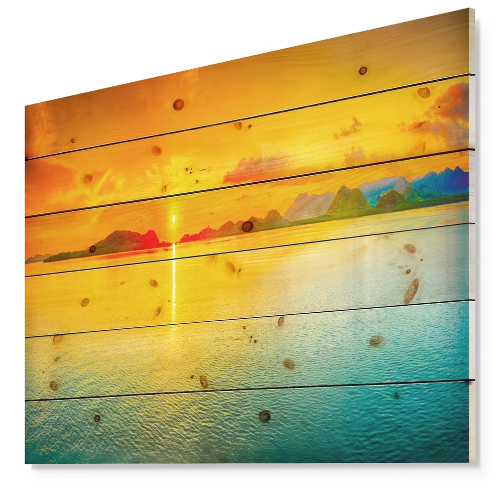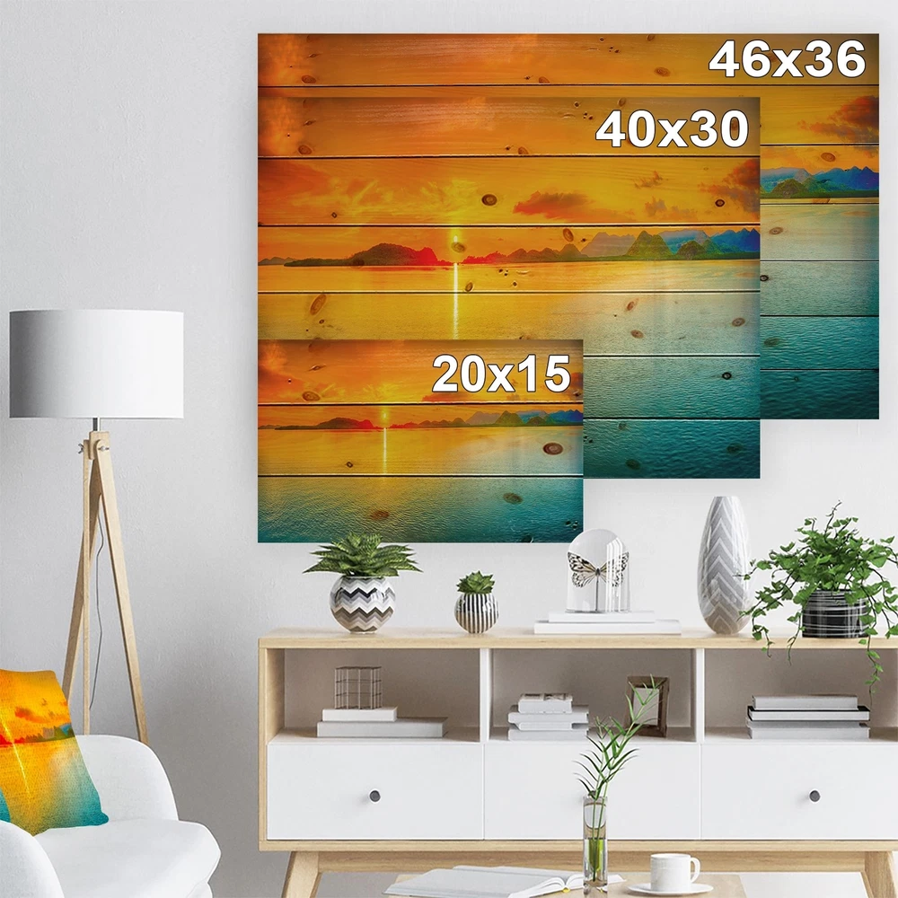 Alas, a modern take on wood wall art. Once typically a wall art piece found only in rustic or farmhouse style decor settings, this Sea & Shore wood wall art will easily fit into even the most contemporary of designs.Using the highest quality 6 Color Canon UV Ink, this Nautical & Coastal wood wall art incorporates several aspects of fine design into one stunning piece. With its slightly visible wood grain appearing through the colors and sleekly finished edges, it is a wonderful choice for any room in your home or office, being it a traditional or modern space. As each piece of wood has natural grain differences from the next, each of these wood wall arts is a truly unique addition to your space.Each Wood wall art is 100% handmade in Canada on Natural pine wood, using the highest quality Free Shipping Over $49.99* Details Designart 'Sunset Over Sea Panorama' Seascape Photography Print on Natural Pine Product Description: Alas, a modern take on wood wall art. Once typically a wall art piece found only in rustic or farmhouse style decor settings, this Sea & Shore wood wall art will easily fit into even the most contemporary of designs. Using the highest quality 6 Color Canon UV Ink, this Nautical & Coastal wood wall art incorporates several aspects of fine design into one stunning piece. With its slightly visible wood grain appearing through the colors and sleekly finished edges, it is a wonderful choice for any room in your home or office, being it a traditional or modern space. As each piece of wood has natural grain differences from the next, each of these wood wall arts is a truly unique addition to your space. Each Wood wall art is 100% handmade in Canada on Natural pine wood, using the highest quality ink which will not fade over time. Available in 3 Differents sizes 20x15, 40x30, 46x36 - OrientationHorizontal - SubjectSea & Shore TypeWood Wall Art, Fine Art, Wood Fine Art, Print on Plaque - Arrives ready to hang on the wall with hanging kit included - MaterialMade with 100% natural pine wood - StyleNautical & Coastal- Number of Pieces1 - SizeMedium, Large, Small - ColorOrange