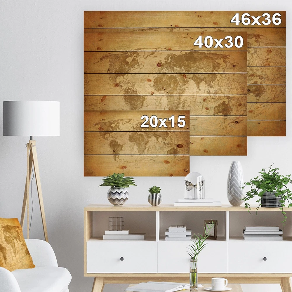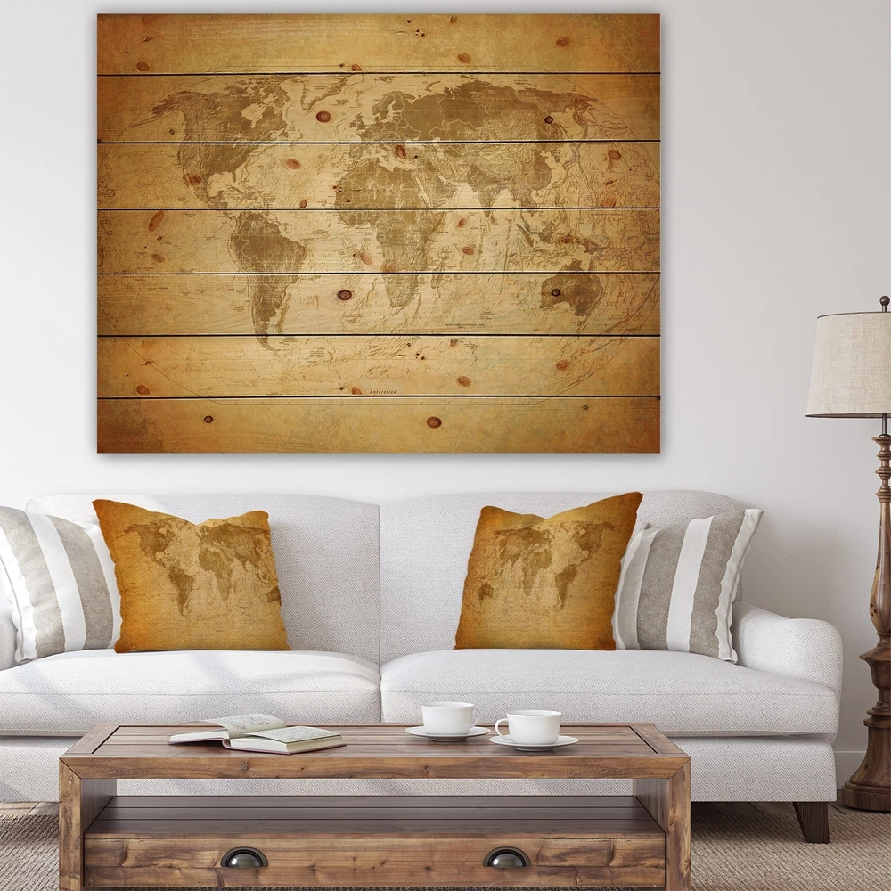 Accessorize global-inspired decor with this wall art print depicting a map of the world. Slatted pinewood takes the place of a traditional canvas to add an inventive note to your decor, while non-fading ink ensures lasting clarity. This artwork comes with hanging hardware for convenient installation. Free Shipping Over $49.99* Details Designart 'Vintage Classic Map' Contemporary Print on Natural Pine Wood - beige Product Description: Accessorize global-inspired decor with this wall art print depicting a map of the world. Slatted pinewood takes the place of a traditional canvas to add an inventive note to your decor, while non-fading ink ensures lasting clarity. This artwork comes with hanging hardware for convenient installation.