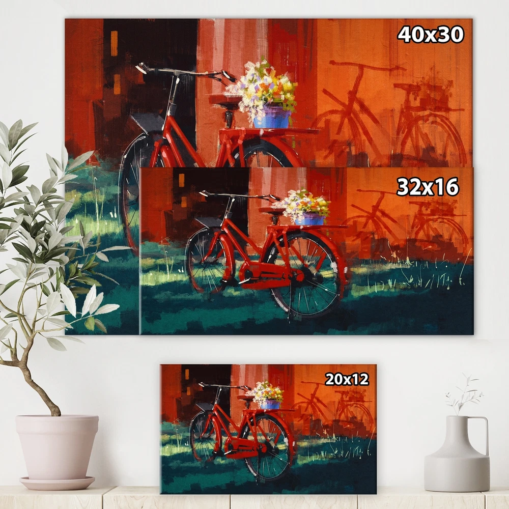 This beautiful Cottage Canvas Art is printed using the highest quality fade resistant ink on canvas. Every one of our fine art giclee canvas prints is printed on premium quality cotton canvas, using the finest quality inks which will not fade over time. Each giclee print is stretched tightly over a 1 inch wood sub frame for small size prints or a 1.5 inch wood sub frame for large size prints (40x30 60x28 ...) ensuring the canvas is taught and does not buckle. This canvas art print is gallery-wrapped (the design continues on the sides) , giving it a real art gallery feel. All of our canvas prints are carefully packaged with plastic protection, fragile labeling and sturdy boxes to ensure a safe delivery. Every canvas print arrives ready to hang on the wall, with the hanging kits included.- Free Shipping Over $49.99* Details Designart "Vintage bicycle with bucket" Cottage Canvas Wall Art Product Description: This beautiful Cottage Canvas Art is printed using the highest quality fade resistant ink on canvas. Every one of our fine art giclee canvas prints is printed on premium quality cotton canvas, using the finest quality inks which will not fade over time. Each giclee print is stretched tightly over a 1 inch wood sub frame for small size prints or a 1.5 inch wood sub frame for large size prints (40x30 60x28 ...) ensuring the canvas is taught and does not buckle. This canvas art print is gallery-wrapped (the design continues on the sides) , giving it a real art gallery feel. All of our canvas prints are carefully packaged with plastic protection, fragile labeling and sturdy boxes to ensure a safe delivery. Every canvas print arrives ready to hang on the wall, with the hanging kits included. - Style French Country - Subject Transportation, Transportation - Color Red - This canvas giclee print is gallery-wrapped (the design continues on the sides) , giving it a real art gallery feel. - Premium quality cotton canvas. - Arrives ready to hang on the wall - Easy to Hang