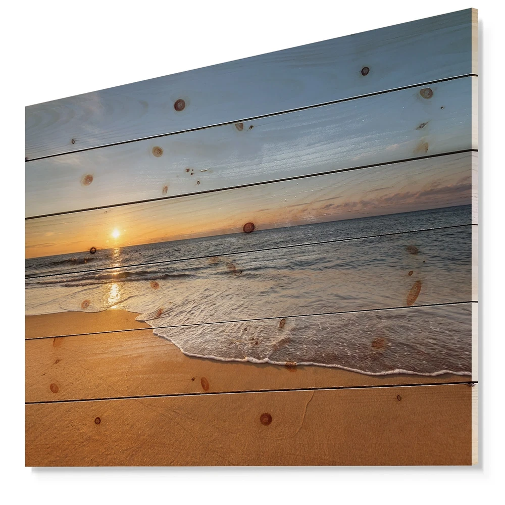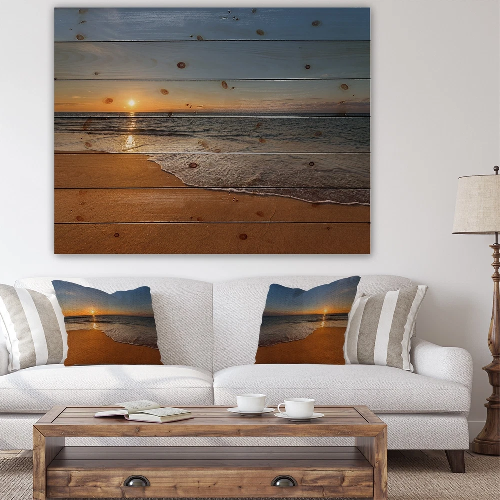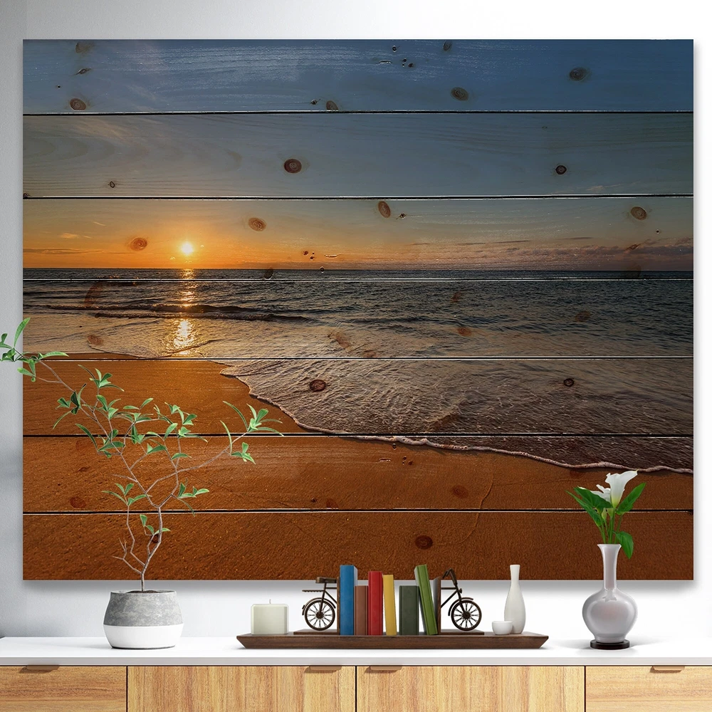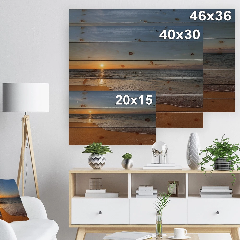 Alas, a modern take on wood wall art. Once typically a wall art piece found only in rustic or farmhouse style decor settings, this Sea & Shore wood wall art will easily fit into even the most contemporary of designs.Using the highest quality 6 Color Canon UV Ink, this Nautical & Coastal wood wall art incorporates several aspects of fine design into one stunning piece. With its slightly visible wood grain appearing through the colors and sleekly finished edges, it is a wonderful choice for any room in your home or office, being it a traditional or modern space. As each piece of wood has natural grain differences from the next, each of these wood wall arts is a truly unique addition to your space.Each Wood wall art is 100% handmade in Canada on Natural pine wood, using the highest quality Free Shipping Over $49.99* Details Designart 'West Cost Sunset Over the Sea' Landscapes Sea & Shore Print on Product Description: Alas, a modern take on wood wall art. Once typically a wall art piece found only in rustic or farmhouse style decor settings, this Sea & Shore wood wall art will easily fit into even the most contemporary of designs. Using the highest quality 6 Color Canon UV Ink, this Nautical & Coastal wood wall art incorporates several aspects of fine design into one stunning piece. With its slightly visible wood grain appearing through the colors and sleekly finished edges, it is a wonderful choice for any room in your home or office, being it a traditional or modern space. As each piece of wood has natural grain differences from the next, each of these wood wall arts is a truly unique addition to your space. Each Wood wall art is 100% handmade in Canada on Natural pine wood, using the highest quality ink which will not fade over time. Available in 3 Differents sizes 20x15, 40x30, 46x36 - OrientationHorizontal - SubjectSea & Shore TypeWood Wall Art, Fine Art, Wood Fine Art, Print on Plaque - Arrives ready to hang on the wall with hanging kit included - MaterialMade with 100% natural pine wood - StyleNautical & Coastal- Number of Pieces1 - SizeMedium, Large, Small - ColorBrown