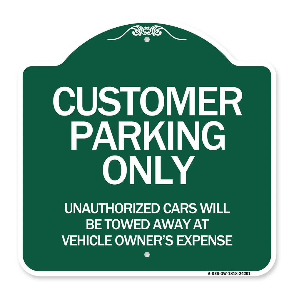 Weight: 1.31 Pounds UPC: 785590055554 ISBN: 0785590055554 Color: Customer Parking Unauthorized Cars Will Package Dimensions LxWxH: 17.99x17.99x0.98 Inches EAN: 0785590055554 gtin13: 0785590055554 Size: 18" x 18" Designer Aluminum Sign Brand: SignMission Type: Does not apply