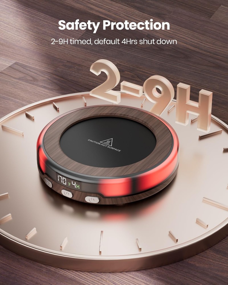 Coffee Mug Warmer for Desk with Colorful Atmosphere lights No more cold coffee in winter with the coffee warmer for desk, you can enjoy the warm coffee or milk in office or home in cold winter Weight: 0.81 LB Parameter: 120V; 30W Cord Length: 4.9 Feet 3 Temperature Setting: 170°F/150°F/130°F Safety Features: Default 4 Hrs shutdown 2-9 Hrs Timed Setting: 2, 3, 4, 6, 8, 9 Hrs timed options Colorful LED Lights: Purple, green, blue, white, red 3 Atmosphere Lights Modes: Multi color breath gradient light, monochrome breath light, monochrome constant light Easy to Clean: Metal waterproof panel, very easy to clean, just wipe the surface with a soft cloth Fit Most Cups: We recommend using a flat bottomed cup, ceramic cups, glass cups, stainless steel cups, feeding bottle, mugs Heat Various Beverages: keep your coffee, tea, milk, cocoa, chocolate, hot on cold winter, coffee warmer for desk, warm at office and home Best gift for friends and family: Nice chooice for coffee lovers, a must have coffee essentials, coffee gift on winter, perfect Christmas gift, New Year gift, Thanksgiving gift, birthday gift for friends, family and lover 3 Temperature Settings: The 30 W coffer cup warmer with faster heating speed, one button easy to adjust the 3 temperature, 130 ℉,150 ℉,170 ℉, keep your coffee at a constant temperature; The LED digital display show the temperature and timed Romantic Atmosphere Lights: Tea warmer with 3 lighting modes and 5 colors, multi color breath gradient light, monochrome breath light, monochrome constant light; Long press for 3 S to turn the lights, mug heater creates a romantic atmosphere in your home 2 to 9 Hrs Auto Shut Off: The coffee heater has 6 options for timed shutdown, click the timer button to set it to auto shut down after 2, 3, 4, 6, 8, 9 Hrs; The cup warmer will automatically shut down after 4 Hrs by default, very safety and convenience Suitable for Different Mugs: This tea warmer is work best for flat bottomed cups, glass cups, ceramic mugs, stainless steel cups, using the lid can maintain heat; The coffee warmer plate can also heating beverages, tea, milk, cocoa, chocolate, candle warmer Perfect Winter Gift: Our Smart Cup Warmer has a beautiful and practical appearance, warming your stomach in cold winter; Coffee accessories for coffee lovers, coffee warmer plate is a perfect gift for men, women, family, friends, on Christmas, New Year