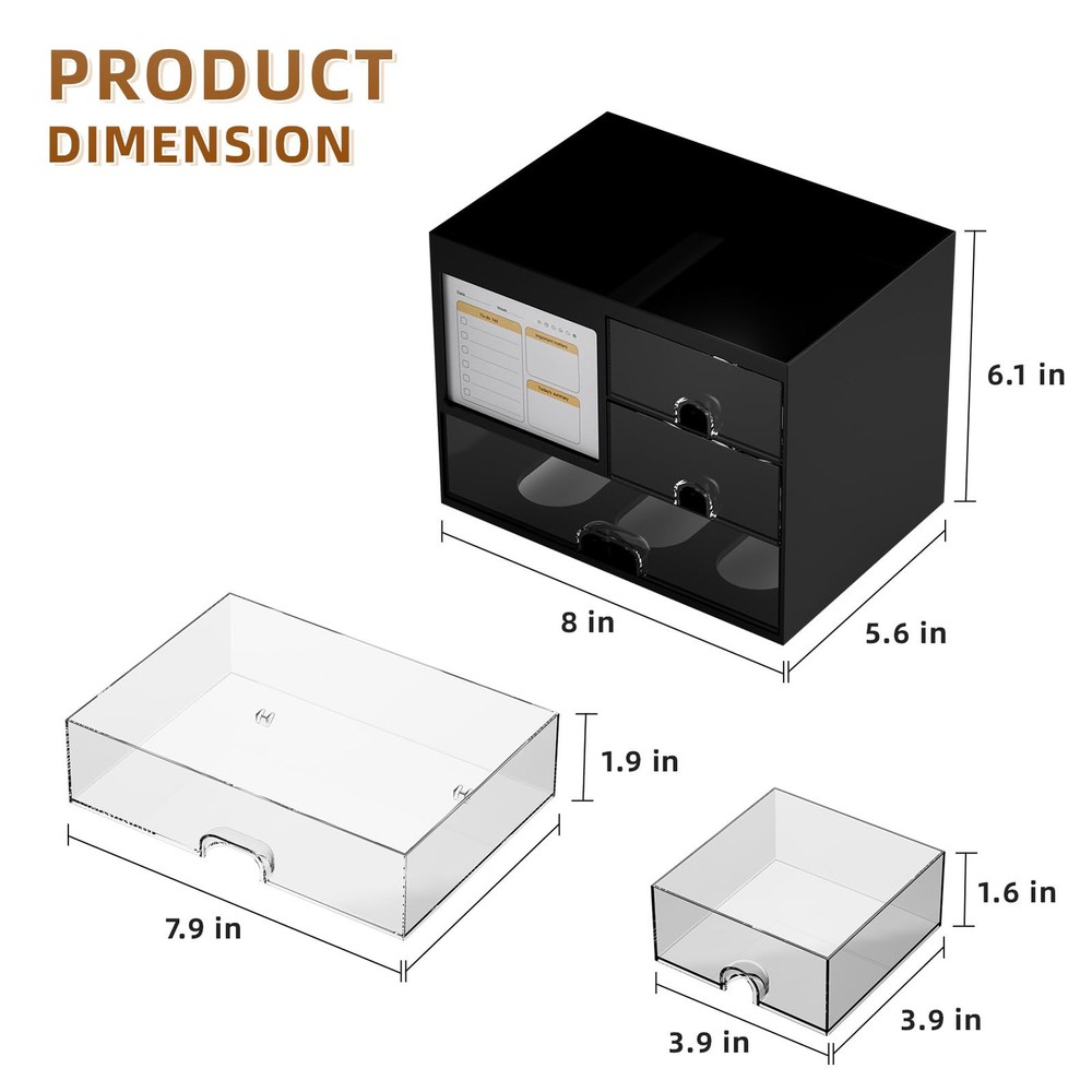 【Larger Capacity】Set of 2 compartments pen holder, 1 top tray, 1 notebook holder, and 2 drawers + 1 larger drawer organizer which has enough storage to allow for office supplies organization. Large capacity, multifunction help you arrange the desk accessories and stationaries clean and tidy.The best and safest storage option for you. Perfect Size:8*5.6* 6.1inch 【Daily Memo for Free】This humanized desktop storage box is not only perfect for storing your desktop stationery but also great for doing your daily schedule. In particular, the daily planner is placed in the most visible place on the desktop, which can serve as a more prominent reminder and help you work effectively 【Multifuction Desk Organizer】This Desk Caddy is no installation required not only perfect for storing your desktop stationery and many other desk widgets but is also great for storing your makeup brushes, nail polishes, lipsticks, and other small personal items sorted by type. The transparent drawer makes it way easier to find what you need! and You can put any other daily necessities on the organizer, It helps you keep your stuff organized 【Premium Material】This storage drawer organizer is crafted from durable ABS plastic, ensuring its strength and solidity for long-term use. The smooth operation of its drawers allows for easy opening and closing. Additionally, its waterproof design makes it effortless to clean, maintaining its pristine appearance over time 【Best Choice】The all-in-desk pen organizer be certain to bring our customers more convenience in the office and be popular in our daily life. If you have any questions, please feel free to us and we'll help to solve it in 24 hours. You take NO RISK by ordering today