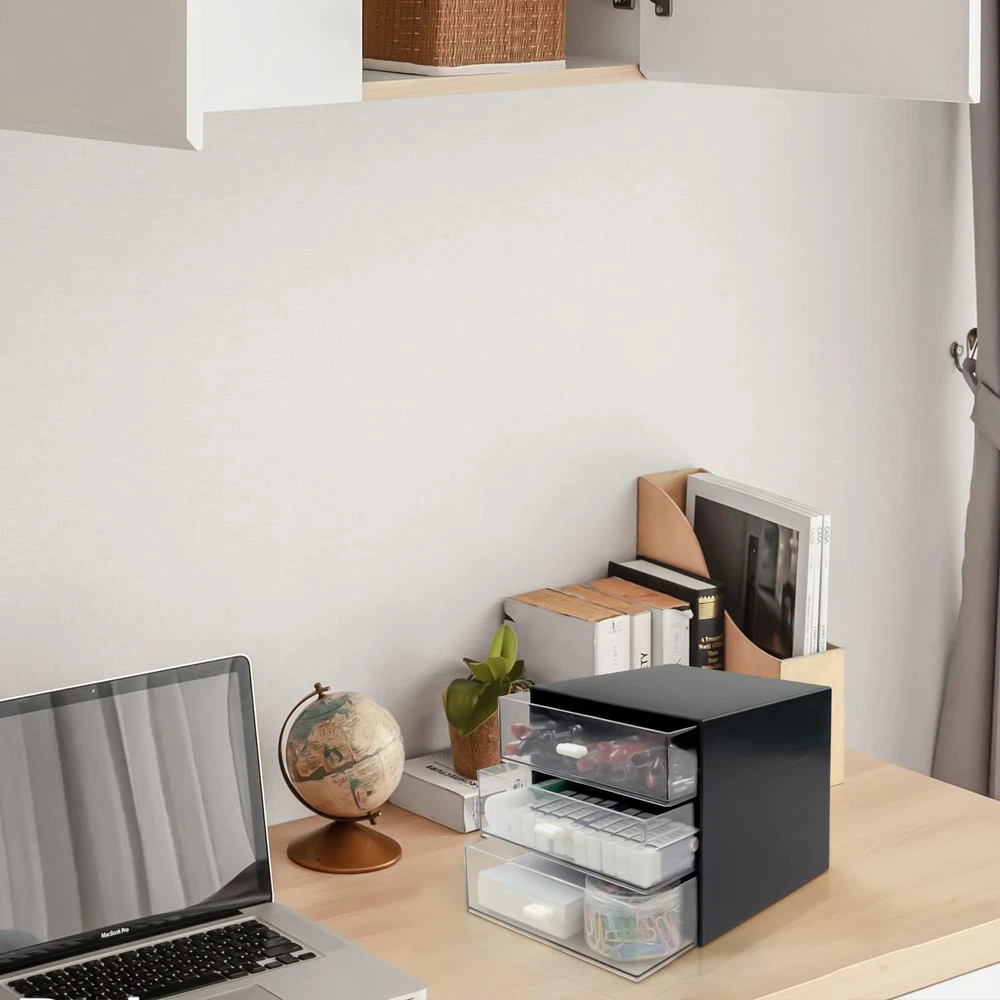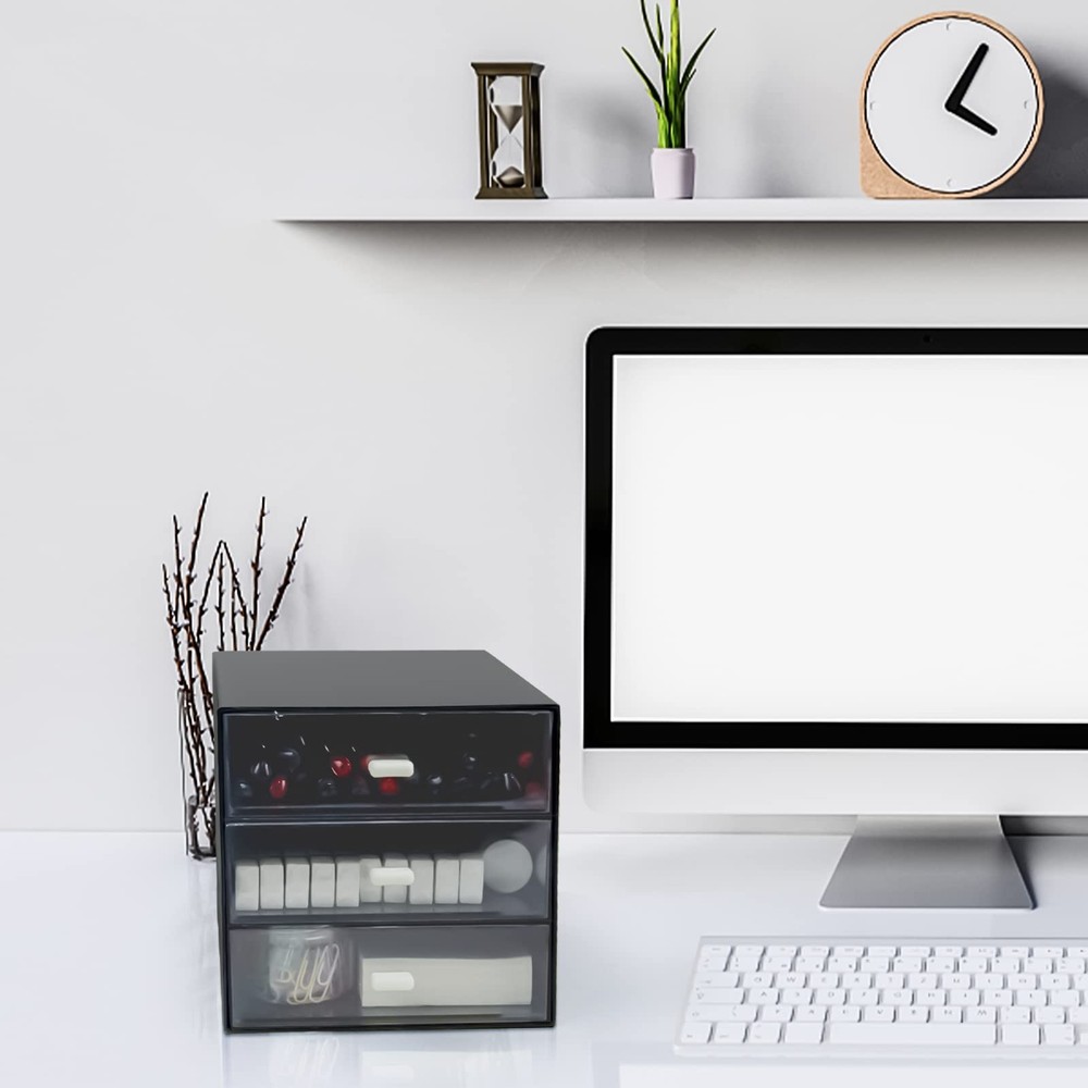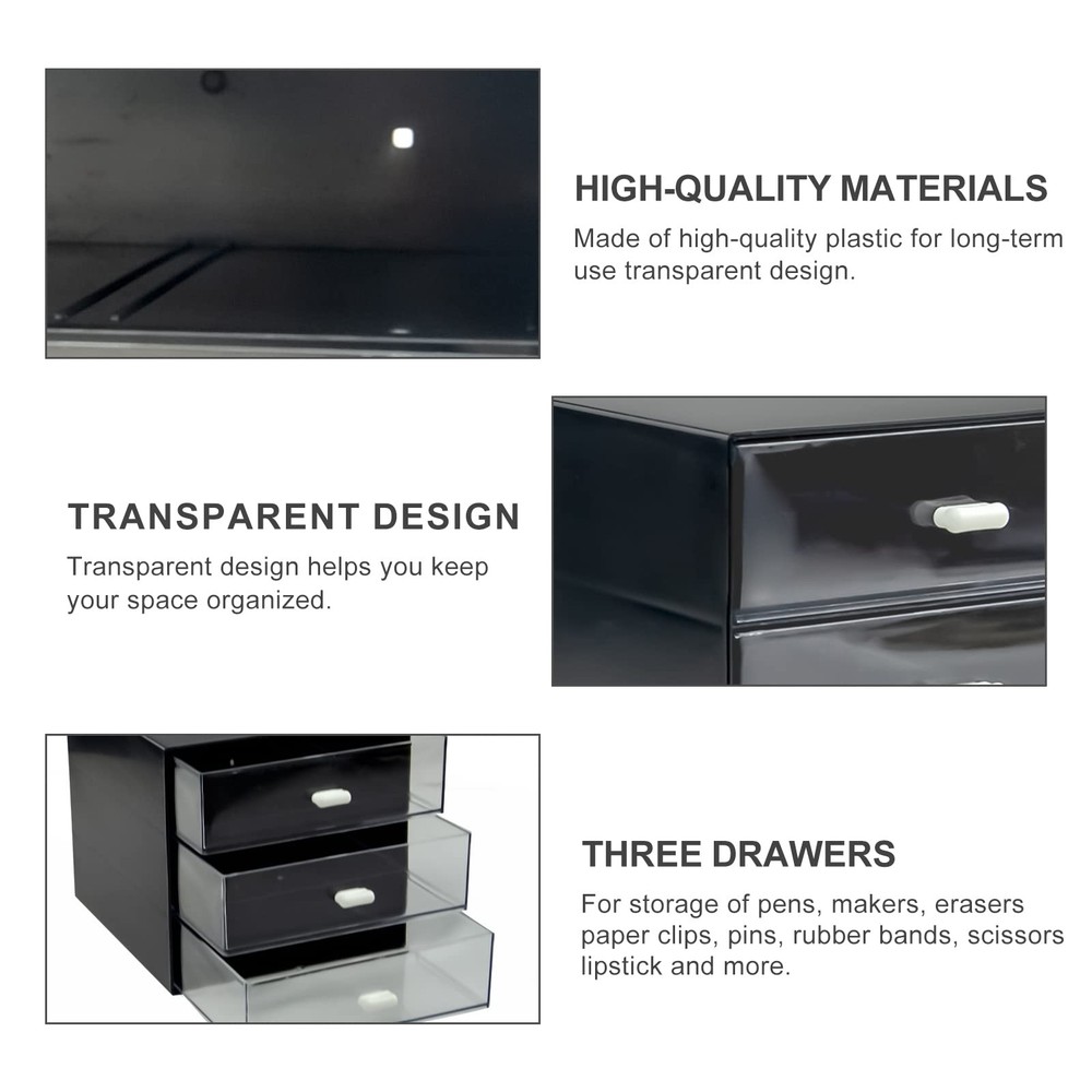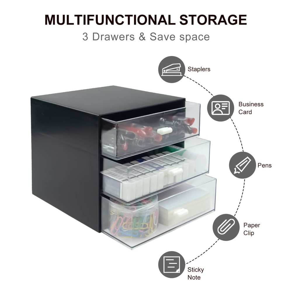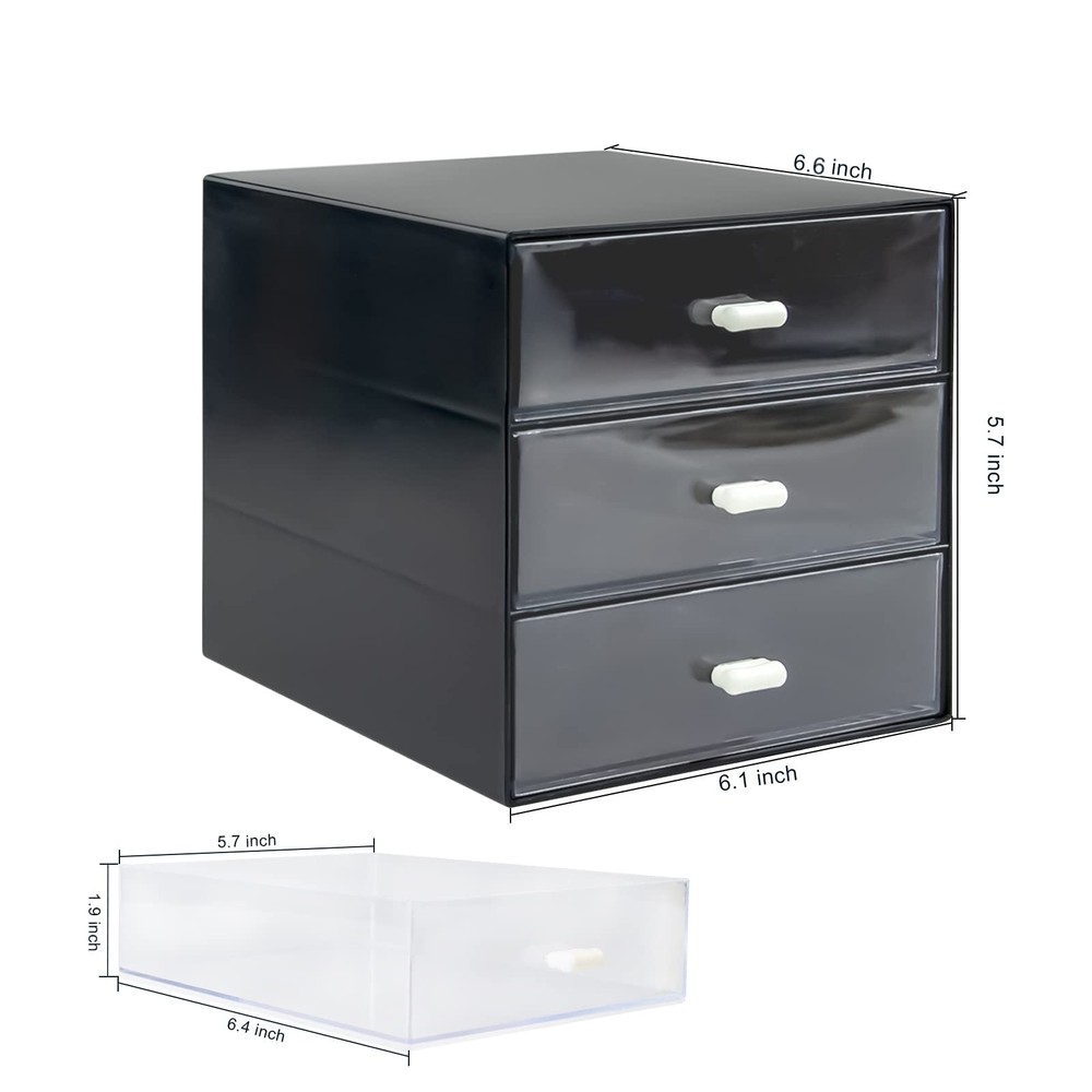 Material: ABS Weight: 610g (Single) Size: 6.1×6.6×5.7 inch You will receive: Black 3 drawer Desk Storage Box x 1 Notes: 1. Due to the difference between different monitors, the picture may not reflect the actual color of the item. 2. Please allow slight errors on size due to manual measurement. thank you. HIGH QUALITY MATERIAL - This stationery storage box is made of high quality ABS material; It is strong and solid enough for a long time use and has a small handle that makes opening and closing the drawers simple and easy MULTI-PURPOSE - Our storage box with drawer design is not only beautiful and elegant, but also can be used in various scenarios, such as office storage, dressing table storage, bathroom toiletries storage, cosmetic storage, etc GREAT DESK ORGANIZATION - This desk organiser has different sizes of drawers to fit your various items, such as notes, pens, stapler, erasers, rulers, scissors and so on