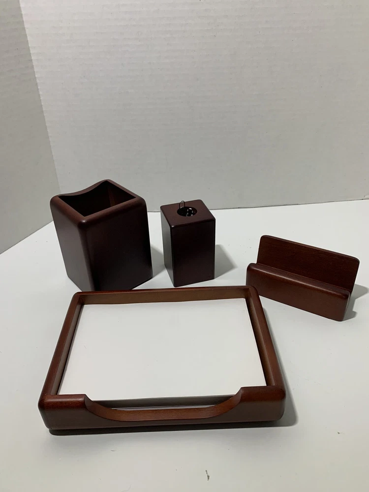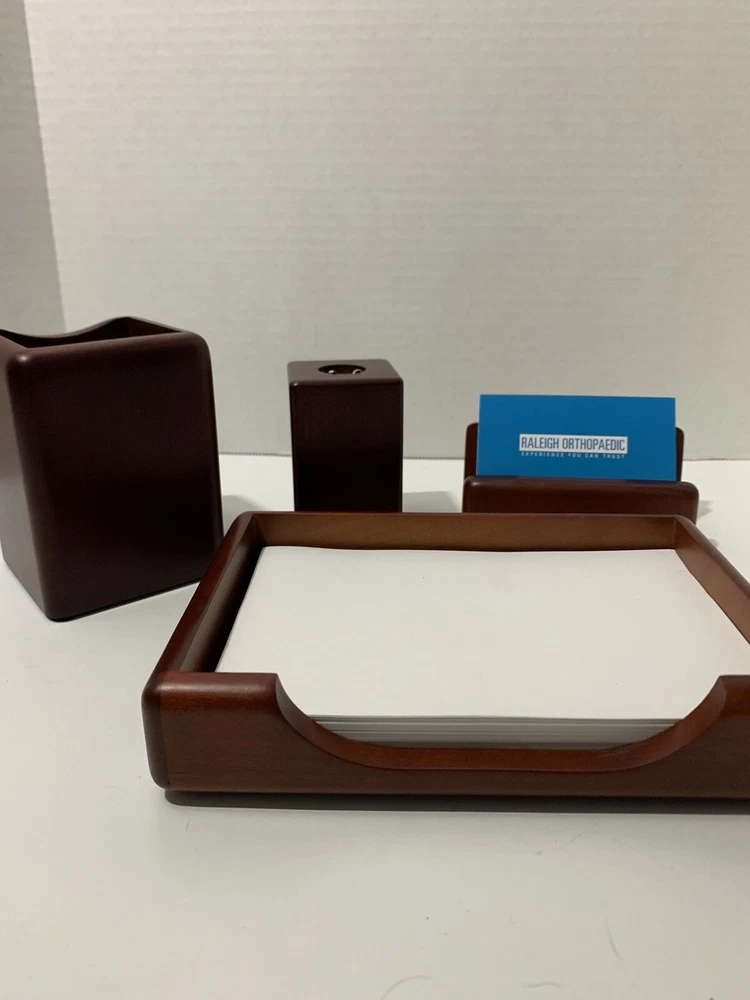 Desk organizer set (Pen & Pencil, Paper, Paper Clip, & Business Card Holder) Item is in very good condition and will ship USPS from Raleigh NC metro area.