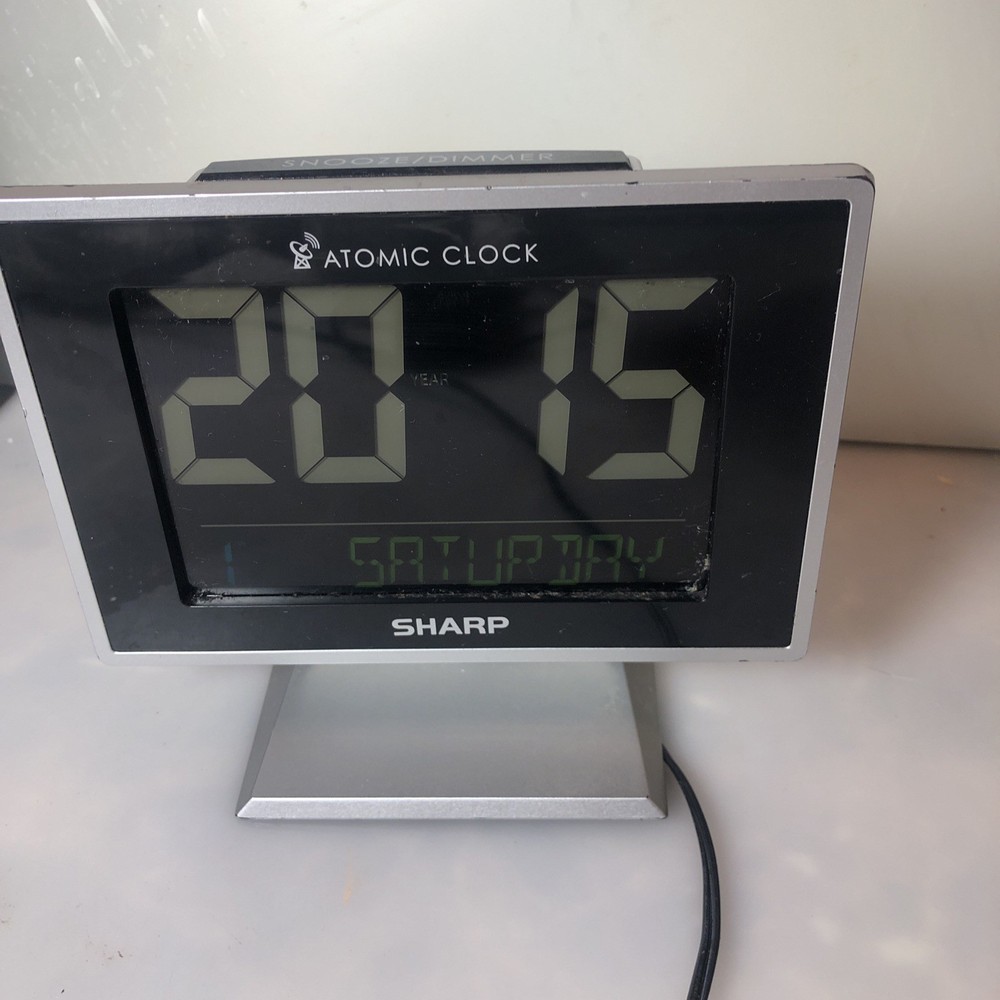 The Sharp Desktop Dual Alarm Clock with Color Display offers atomic accuracy in timekeeping, making it a reliable and precise tool for waking up on time. The calendar and date display add a convenient feature for staying organized and on top of schedules. With a sleek silver design and a weight of only 1.08 pounds, this clock is easy to move around and place on a desk or nightstand for easy viewing. Its electrical power source ensures continuous functionality. The dual alarm feature allows for setting multiple wake-up times, providing versatility in daily routines., only works with battery, cord is damaged, see photos