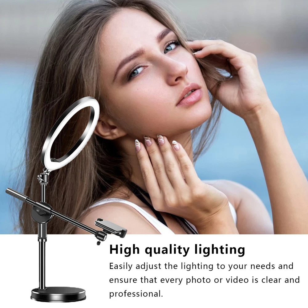 Desktop Phone Mount Selfie Ring Light With Stand Articulating Arm Camera Mount Bullet Points: Convenient Hands-Free Positioning: Enjoy a compact design that provides strong and reliable support for your phone with this overhead phone mount. Easily adjust the angle and height to achieve the perfect viewing position. Advanced Illumination: Rejuvenate your photography or live streaming with the overhead phone mount that comes with a 26cm ring fill light. Customize the lighting with 3 color modes & 9 brightness levels, breeze through visuals like never before. Stable and firm: The base of the lifting live broadcast mobile phone holder is thickened and weighted to ensure stability, and also allows a variety of angles to be chosen. Diversify Your Content: Enhance the quality and diversity of your videos with our Overhead Phone Mount's dual camera mobile phone holder. Easily capture dynamic content from multiple angles for a dynamic and engaging video. Multi-functional: Perfect for online teaching, universal video production, and live streaming, this adjustable overhead phone mount allows for customization of angle and height to achieve the ideal shot. Introducing the Universal Overhead Phone Mount - the perfect solution to improve the quality and diversity of your content creation. Our mount provides good stability, strong and reliable hold, and easily adjustable lights for optimal photo conditions. Type: mobile phone holder Material: ABS Product name: Desktop overhead photo stand Powered supply method: USB Product weight: 1032g (excluding fill light) Interface size: 1/4 universal interface Product light source: white light, warm light, warm white light List: Overhead Phone Mount x1 Payment should be completed within 2 days after auction closed, or unpaid dispute will be filed for an closing auction. An unpaid case will be filled after 4 days ● We strive for 100% customer satisfaction ! ● Positive Feedback is very important to us. ● We hope that you contact us immediately BEFORE you give us neutral or negative feedback, so that we can satisfactorily address your concerns. ● We promise to offer the lowest price and high quality produce. Our working time: Monday to Friday (9:00 am to 18:00pm)(Beijing Time) Saturday (9:00 am to 12:00am),except International Holiday. Dear buyers : ● Welcome to my store ! ● Your satisfaction is our top goal,we appreciate your patronizing. ● If you have any questions, please contact us before leave negative or neutral feedback, we will try our best to solve the issue to your satisfaction, thanks ! ● If you are satisfied with our service, please rate the details of the transaction (Detailed Seller Ratings) on eBay. ● Please always talk to us via ebay Message . ● We appreciate your business and look forward to growing our e-Bay sales with satisfied customers.