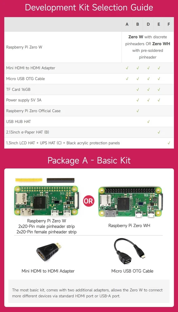 Overview This development kit includes: the Raspberry Pi Zero WH (built-in WiFi, pre-soldered headers), and some most basic components you may need to get going with your Pi Zero: Mini HDMI to HDMI Adapter, Micro USB OTG Cable. Raspberry Pi Zero WH Features Broadcom BCM2835 1GHz ARM11 single-core processor 512MB RAM Added wireless connectivity 802.11 b/g/n wireless LAN Bluetooth 4.1 Bluetooth Low Energy (BLE) 40PIN pre-soldered GPIO headers Micro SD card slot Mini-HDMI port (1080p60 video output) Micro-USB power Micro-USB OTG port CSI connector Composite video header Composite reset header Dimension: 65mm x 30mm x 11.6mm PACKAGE CONTENT Raspberry Pi Zero WH x1 Mini HDMI to HDMI Adapter x1 Micro USB OTG Cable x1 This development kit includes: the Raspberry Pi Zero WH (built-in WiFi, pre-soldered headers), and some most basic components you may need to get going with your Pi Zero: Mini HDMI to HDMI Adapter, Micro USB OTG Cable. Broadcom BCM2835 : 1GHz ARM11 single-core processor Added wireless connectivity : 802.11 b/g/n wireless LAN;Bluetooth 4.1;Bluetooth Low Energy (BLE) Mini-HDMI port (1080p60 video output) 40PIN pre-soldered GPIO headers