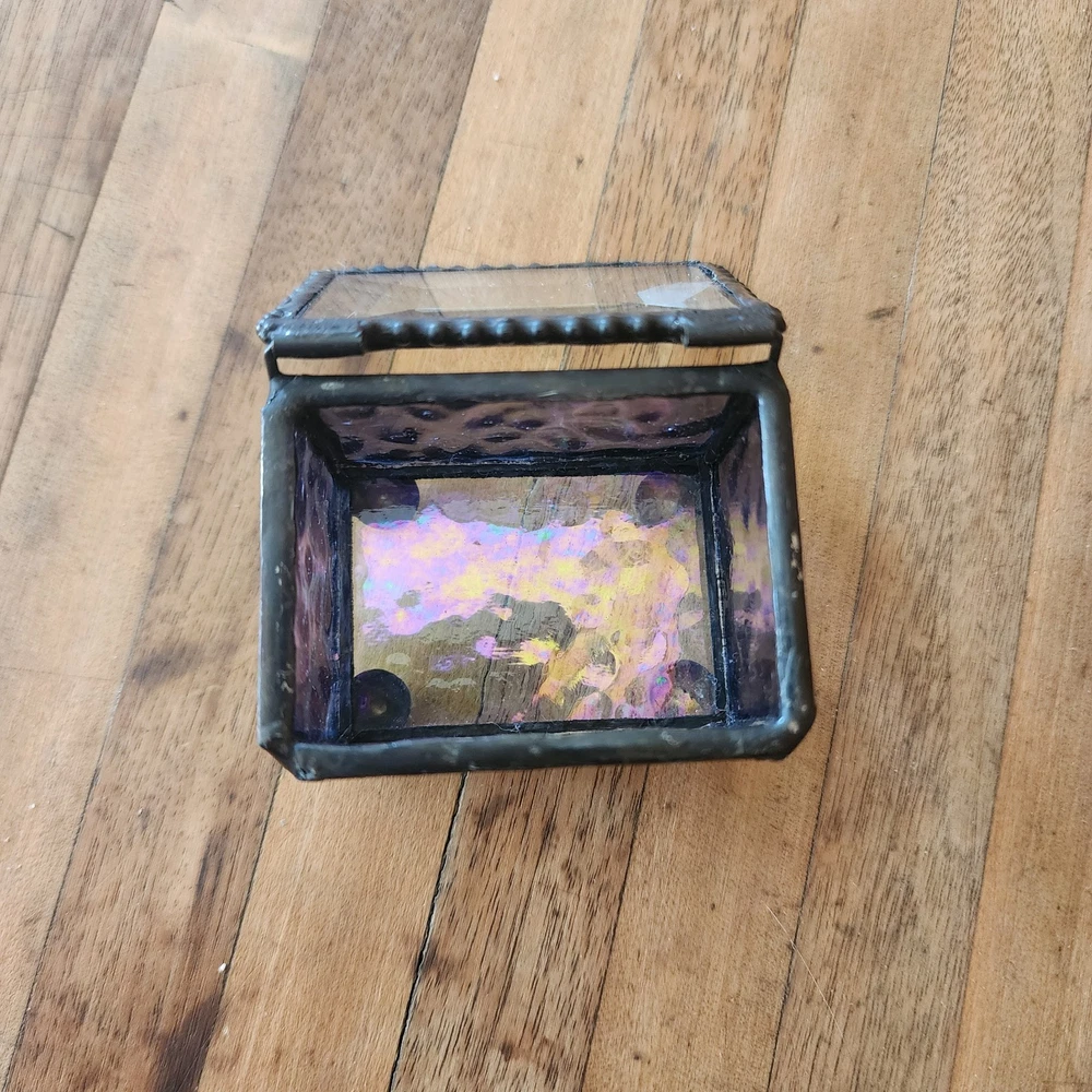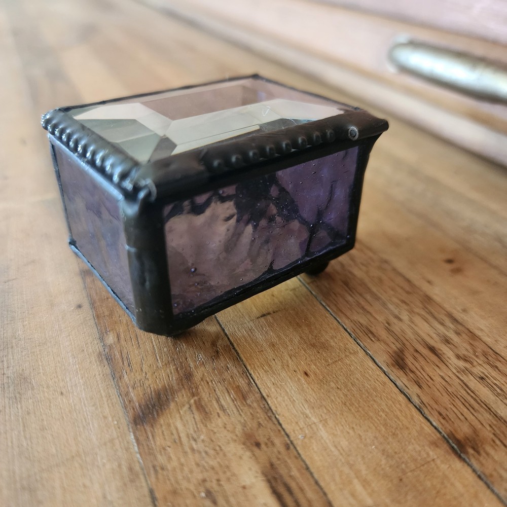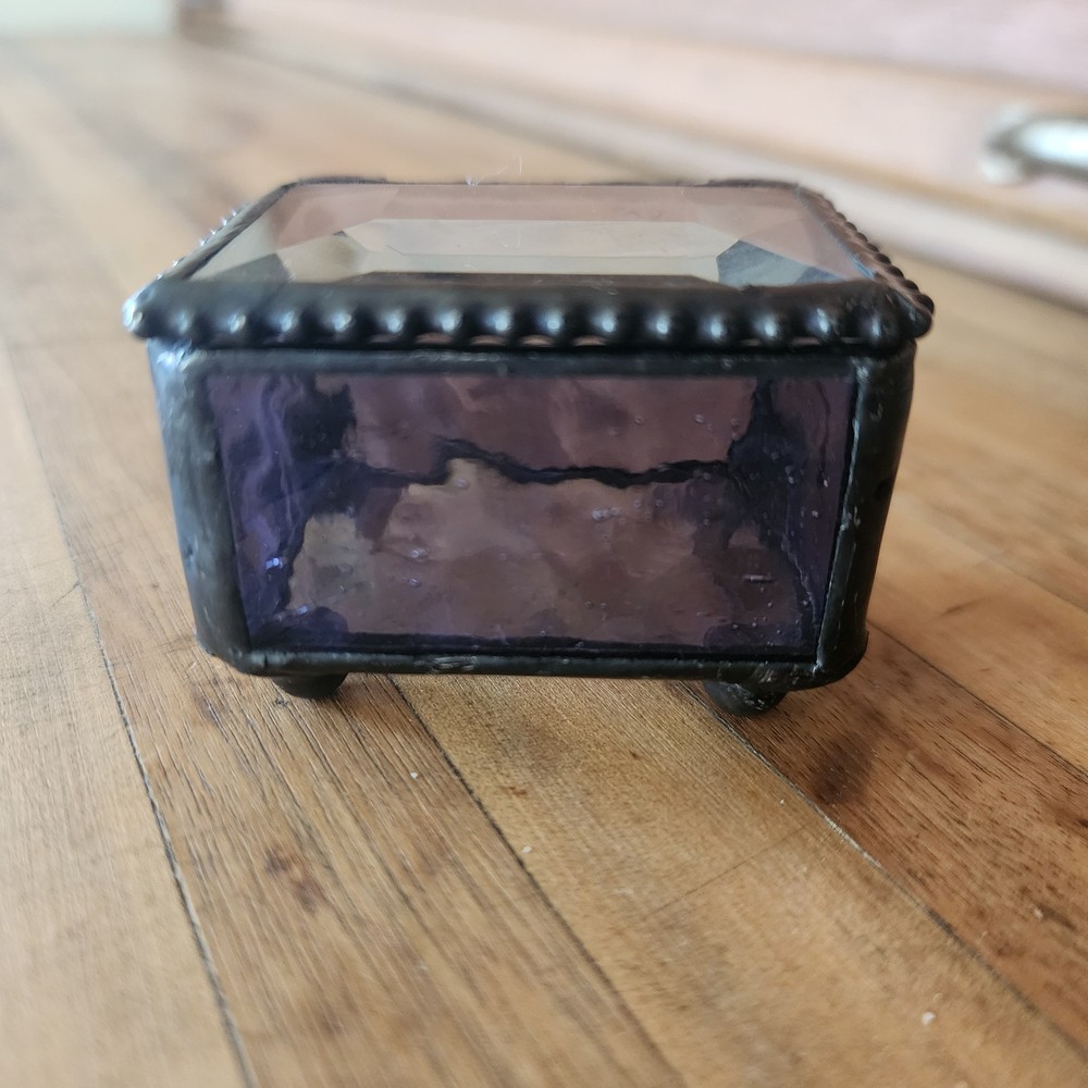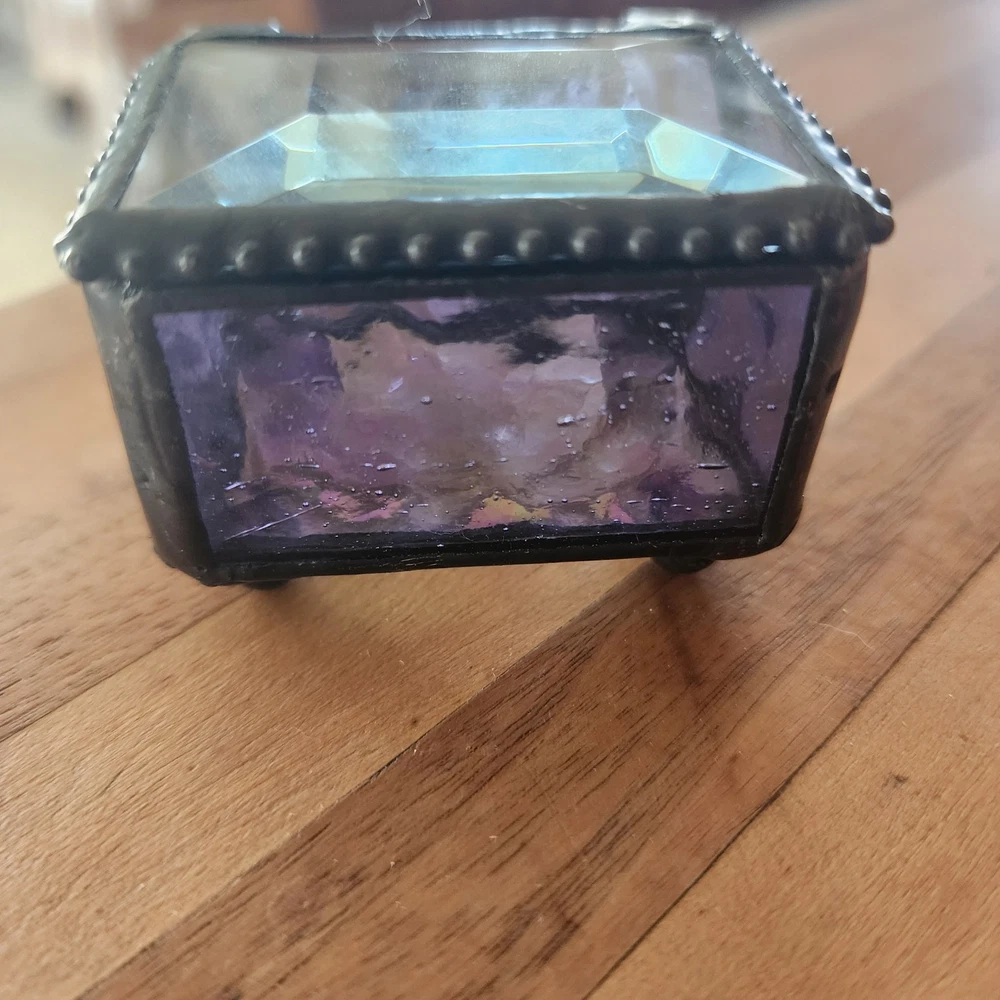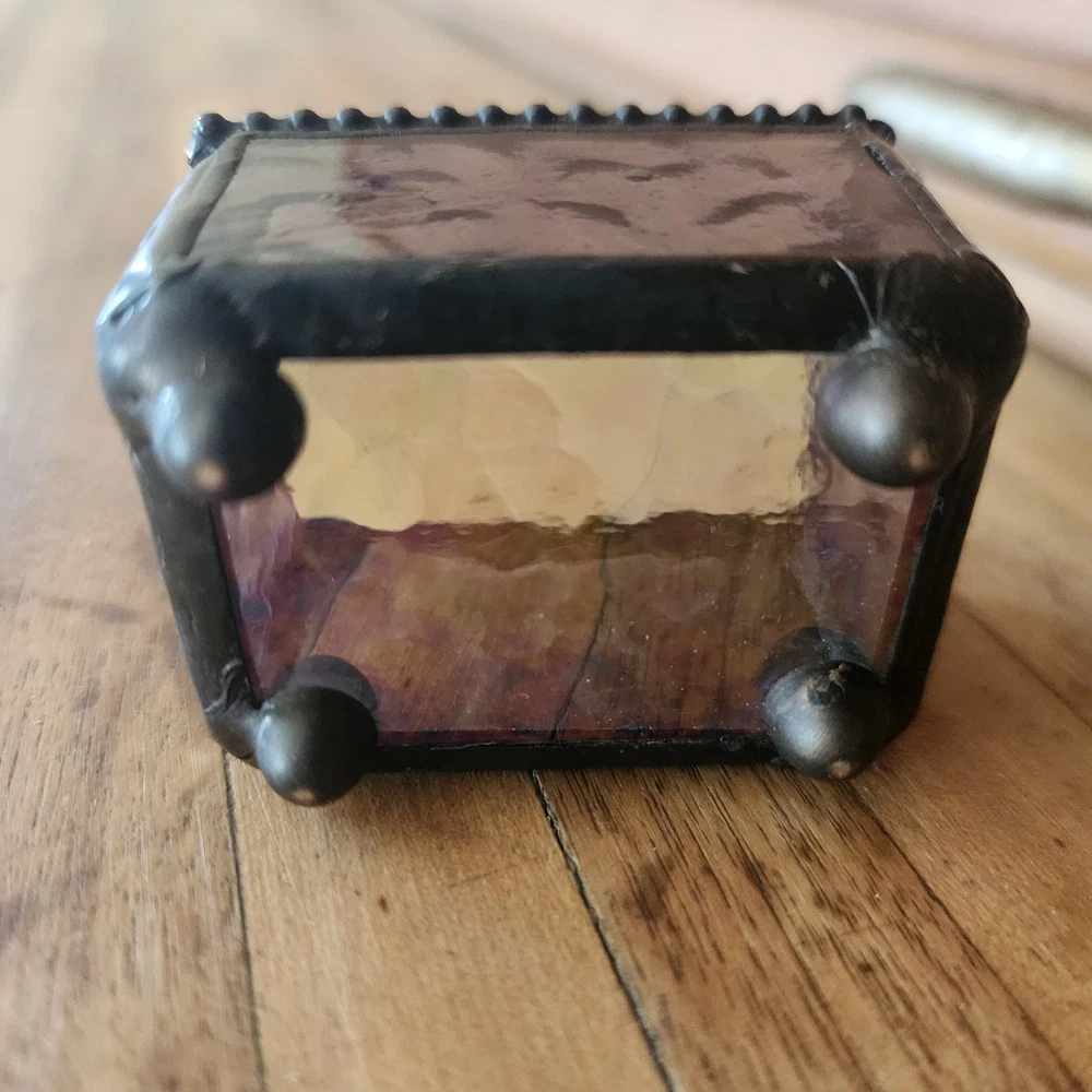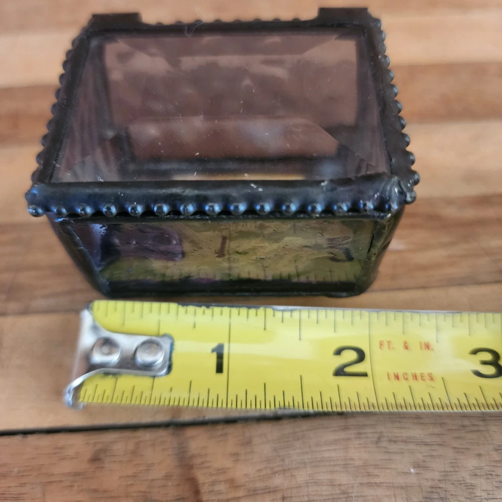 This glass jewelry box is elegantly handcrafted and designed to hold your most prized trinkets and jewelry. Carefully crafted using colorful stained and textured glass. Lead free solder. Metal / glass 1.5''H x 2.25''W x 1.75''D Imported
