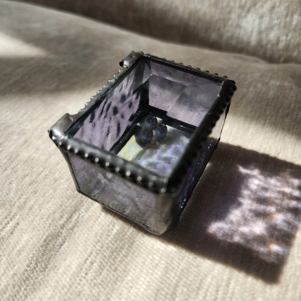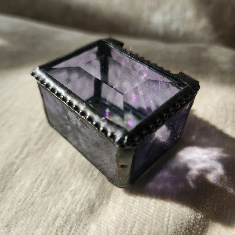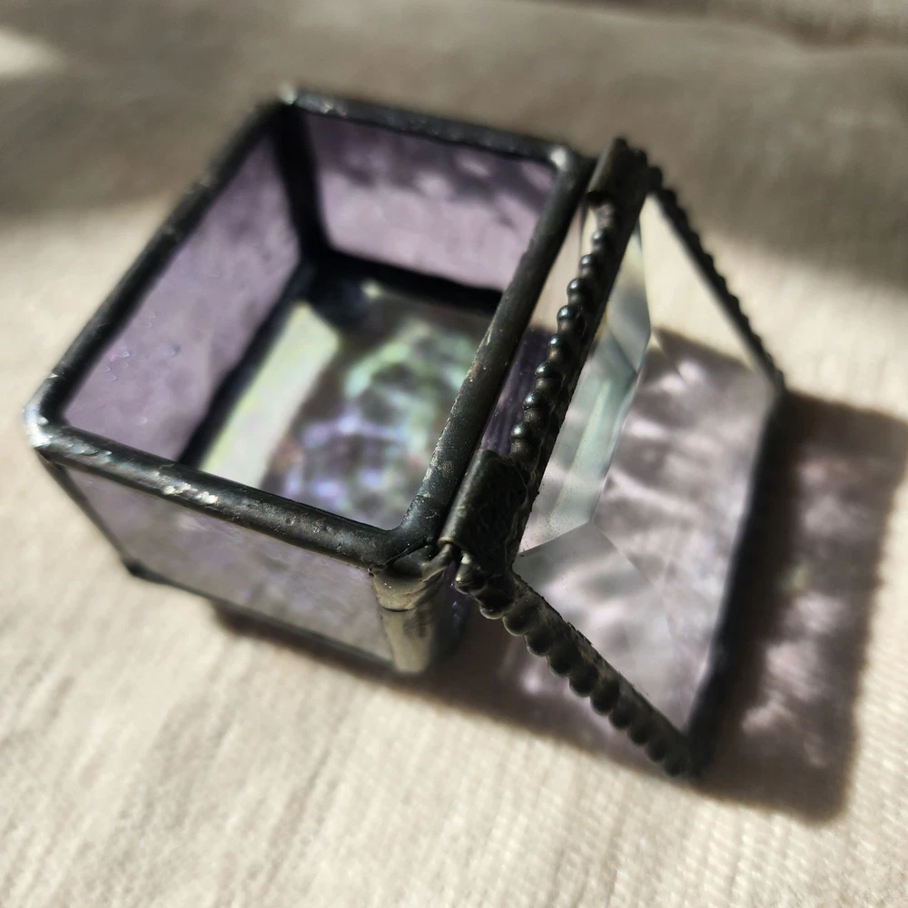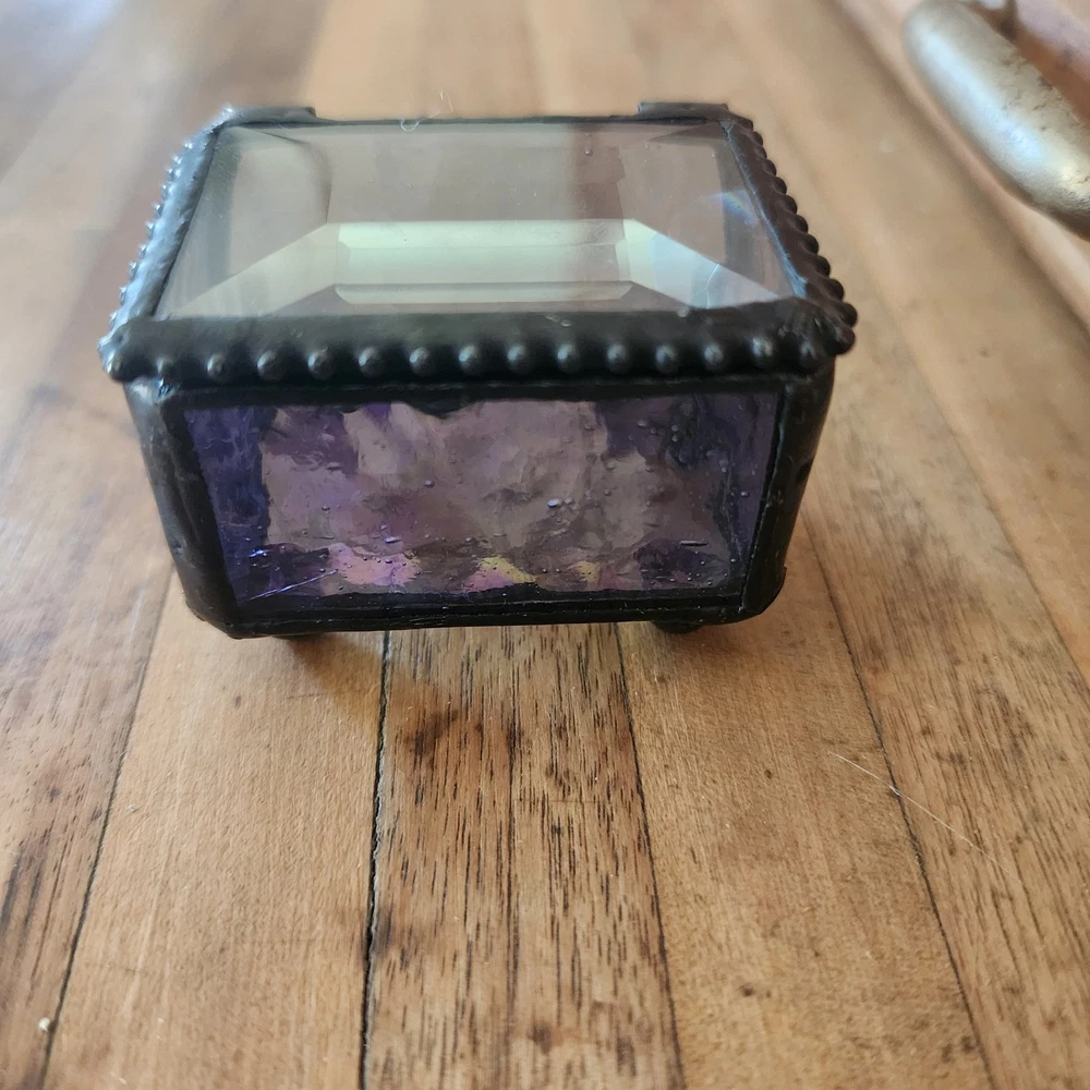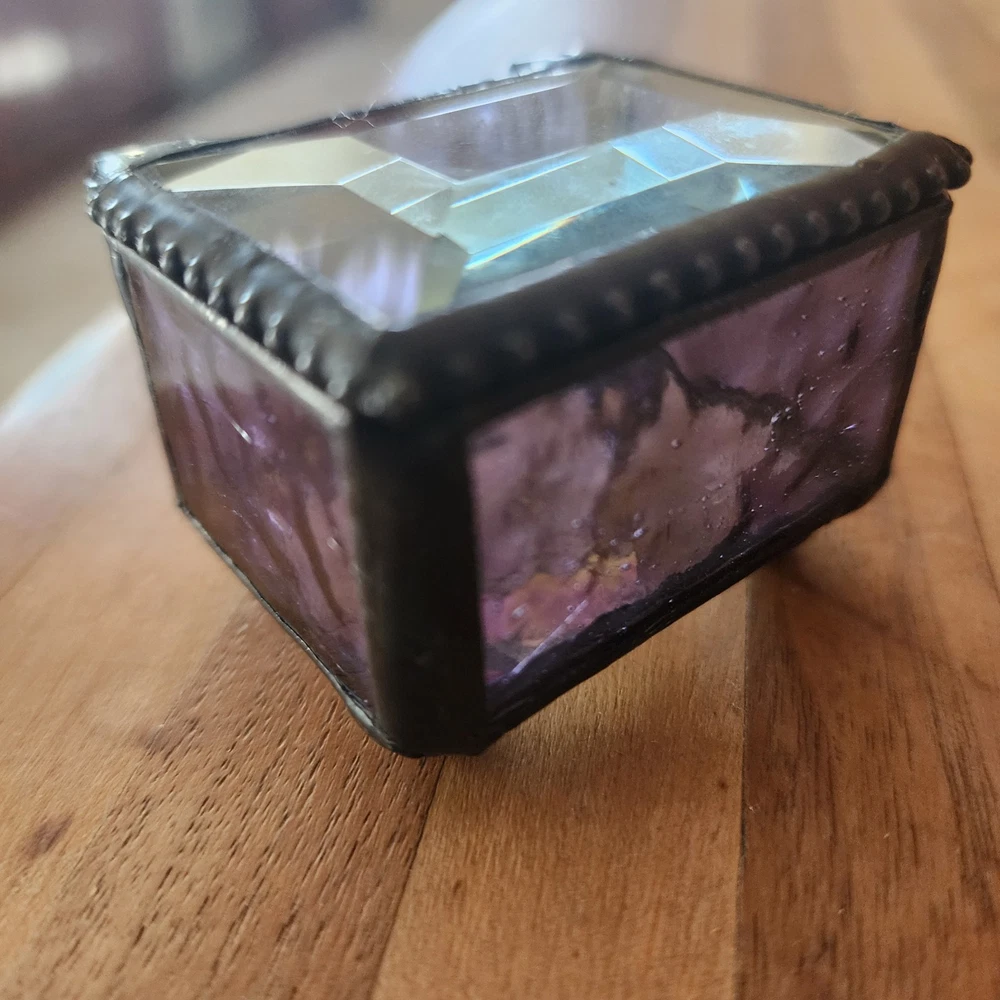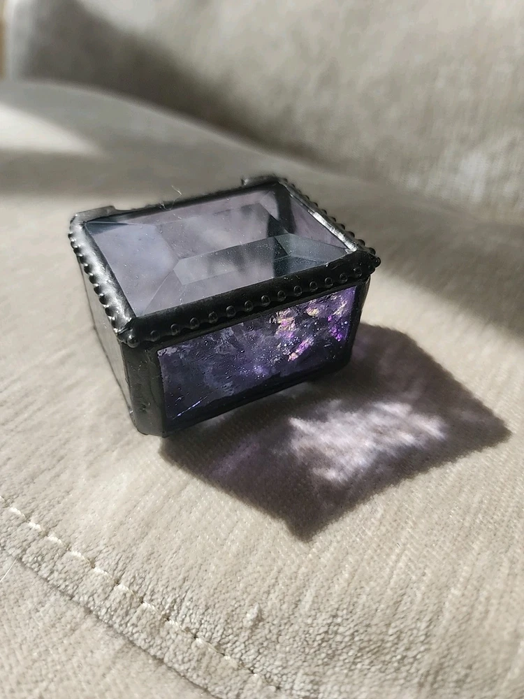 This glass jewelry box is elegantly handcrafted and designed to hold your most prized trinkets and jewelry. Carefully crafted using colorful stained and textured glass. Lead free solder. Metal / glass 1.5''H x 2.25''W x 1.75''D Imported