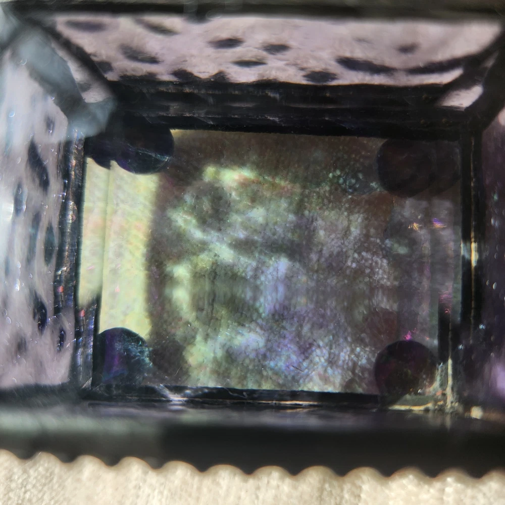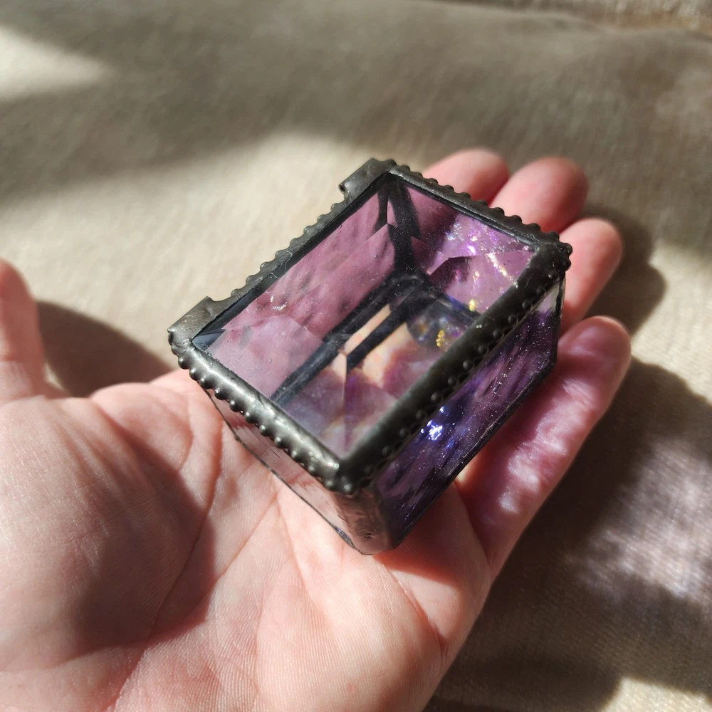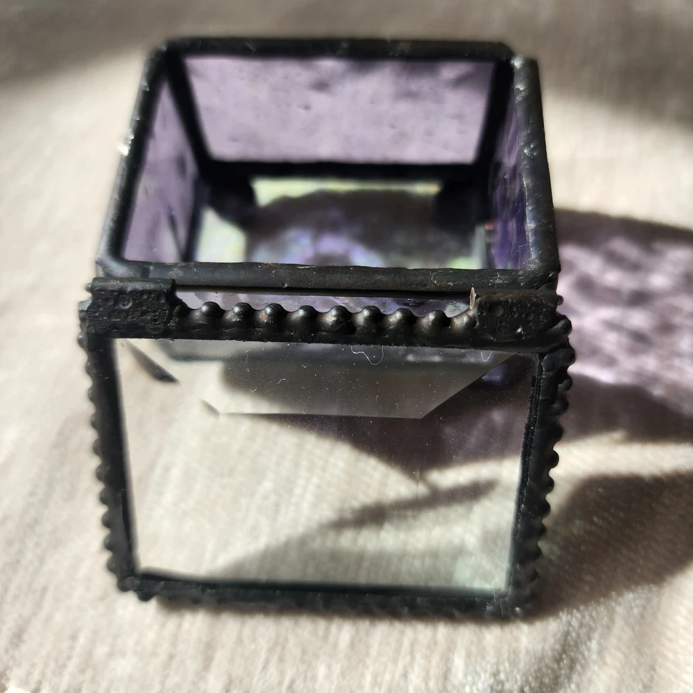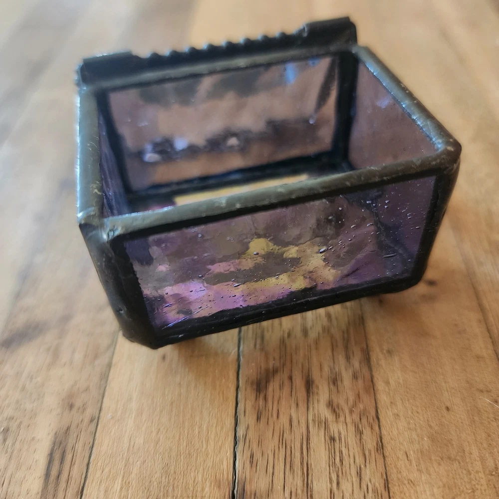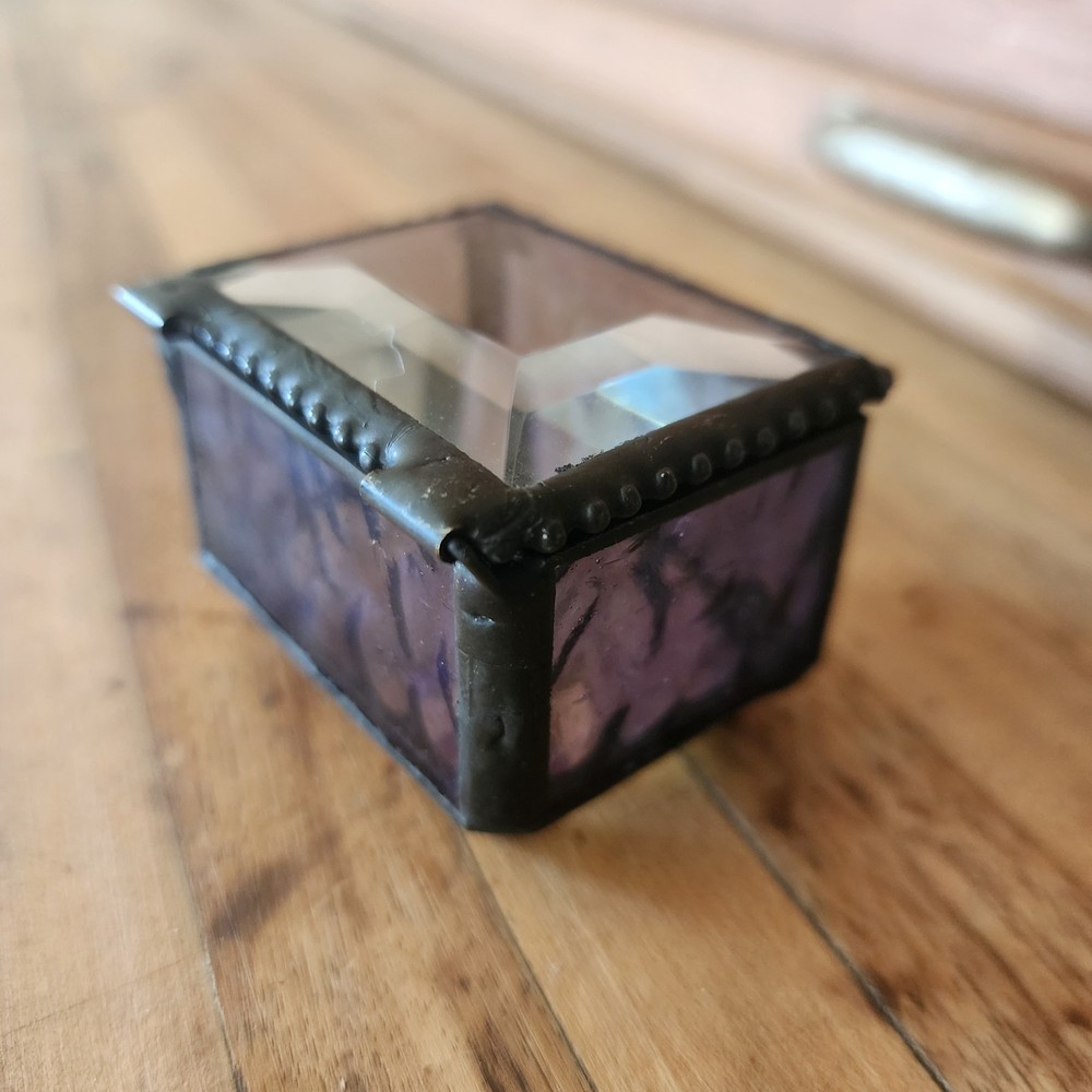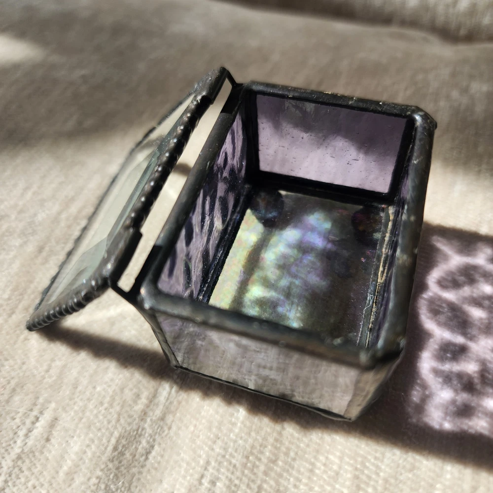 This glass jewelry box is elegantly handcrafted and designed to hold your most prized trinkets and jewelry. Carefully crafted using colorful stained and textured glass. Lead free solder. Metal / glass 1.5''H x 2.25''W x 1.75''D Imported