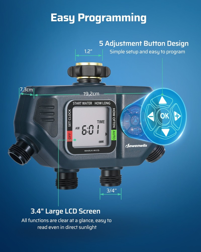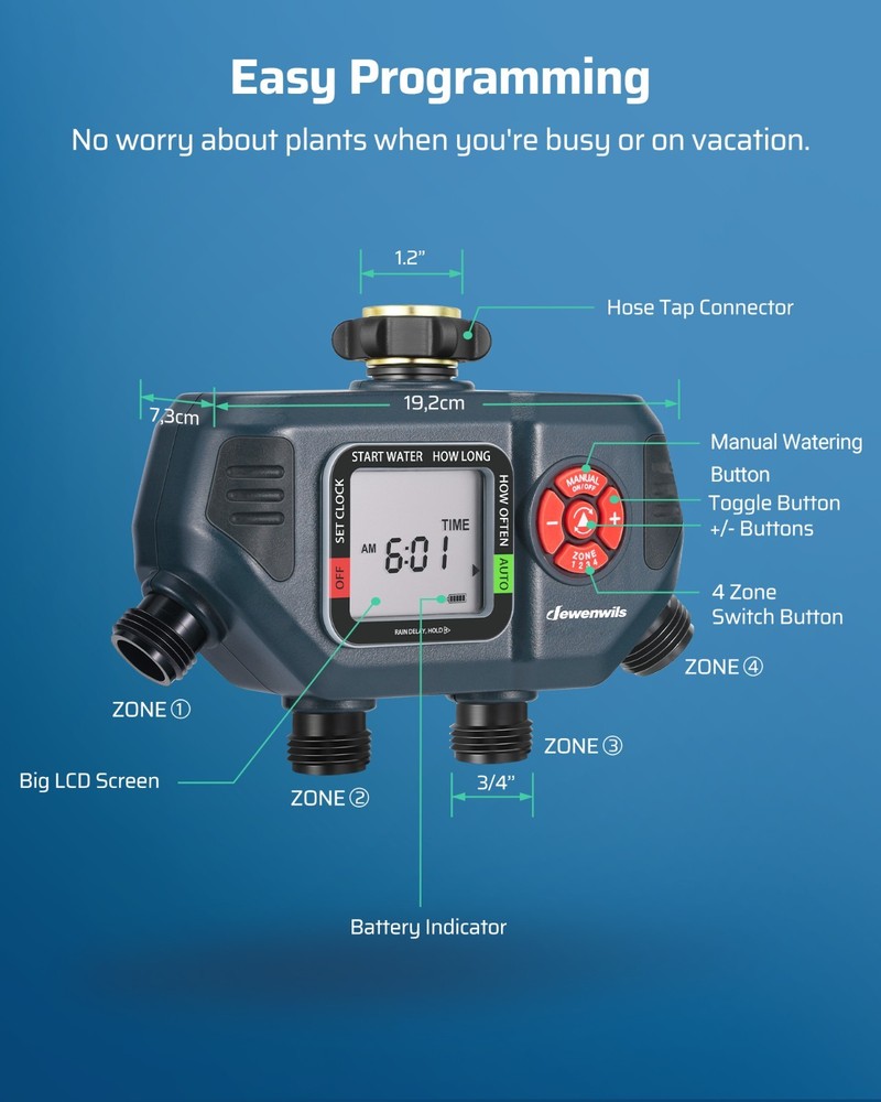 Store Categories Store Categories Remote control outlet Remote control socket Extension cord Light Bulbs Power Strip Surge Protector Timer Dimmer Light Fixture Wall lamp floor lamp night Light Lawn lamp book light chandelier table Lamp downlight String Light Fans Lights Security Light Bathroom Light Work Lights UK DE Voltage Transformer Extension Cord Reel Socket & Panel Air Hose Heat Cable Wall Plates Water - products Water Hose Water Timer Pool Pump Timer Other DEWENWILS Sprinkler Timer 4 Zone,Water Timer for Garden Hose with Rain for Yard Product Description Brand DEWENWILS Type Tap/Hose Timer Number of Items in Set 4 Power Source Battery Indoor/Outdoor Outdoor MPN HDWT04B1 Suitable For Occasional Watering Watering Frequency 1 -7days/ every 2 days/ every 3 days Control Style Auto Number of Zones 4 Manufacturer Warranty 1 Year Features Auto-Off Color Navy Blue Set Includes Hose Material Abs,Plastic,Pet Battery Type AA Model Rain Delay About this item [User-friendly] Featuring a 3.4-inch LCD screen, this faucet timer offers a simple and intuitive user interface; all functions are clearly displayed with accompanying explanatory text on the left, providing comprehensive details; the flashing cursor on the screen and 5 program buttons enable users to effortlessly achieve various watering cycles [Easy to Program] This water timer for garden hose is easy to set, allowing for customized watering schedules (1-360mins) on any day or days of the week, or on a biweekly basis; cooperate with multiple water hose pipes to meet the weekly watering and irrigation requirements of an entire household [4 Independent Watering Zone] 4 zones (1,2,3 and 4) are controlled by different procedures via operate buttons to achieve different watering and do not interfere with each other; our 4 zone sprinkler timer is ideal for sprinkler/ lawn/ plant irrigation, water mist system, garden/ landscape watering; schedule your needs via different hose and settings in different days, save your energy [Multiple Settings] Our hose timer for watering offers different settings to meet your everyday needs with Auto mode, rain delay mode and manual irrigation system (when/ how long/ how often to water); activate the rain delay mode to effectively free from worrying about unattended plants/flowers in rain, no more over-watering; low battery reminder, enjoy hassle-free vacation [Leak-proof for Outdoor Use] Pure zinc integrated tap connector avoids water leakage in use and supports standard 3/4 sprinkler timer; ABS plastic shell provides resistance to sunlight and waterproofing for outdoor use, No need to change frequently; sustainable water pressure is 120 psi, tap water or a pressurized water source ensures a normal drain Warranty Shipping Policy Feedback Warranty 1. The warranty is referred to exchange for item defective or damaged in transit. 2. We define the item as defective only if it doesn't function as described, it is the buyer's responsibility to understand the item description before bidding. The alleged defective parts must be returned to us for inspection. 3. Any loss or damage caused by improper installation or abuse is not covered by warranty. Buyer assumes all responsibility to assure proper installation and operation. 4. Warranty does not include product liability insurance. Shipping Policy 1. Please make sure the shipping address is valid and correct, no changes are allowed once the order is shipped. 2. All domestic orders will be shipped via USPS, UPS, or FedEx, or via more express delivery methods, and usually arrive quickly at your shipping address. Feedback 1. If you are dissatisfied for any reason, please contact us! We will work hard to make sure every customer 100% satisfied and resolve any problem for you. 2. If you are satisfied with the product you received, please leave us positive feedback and 5 scores DSR. Copyright © 2023 Dianxiaomi