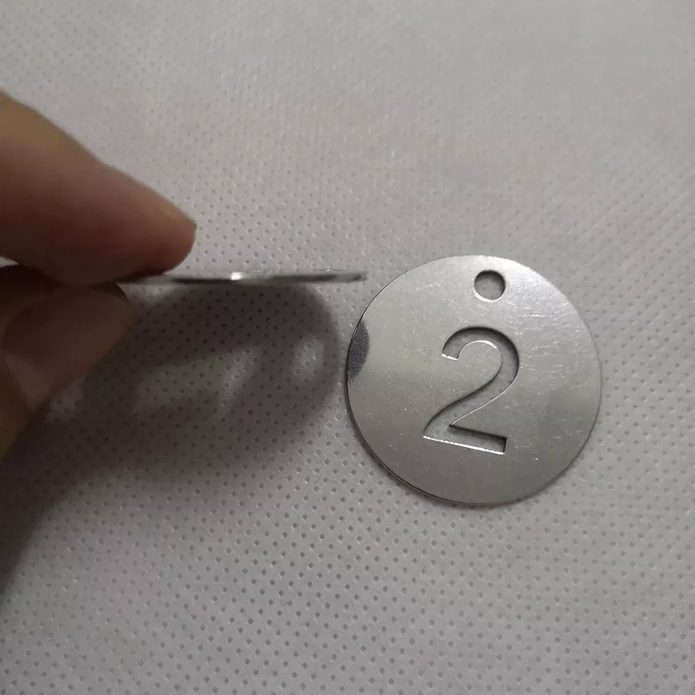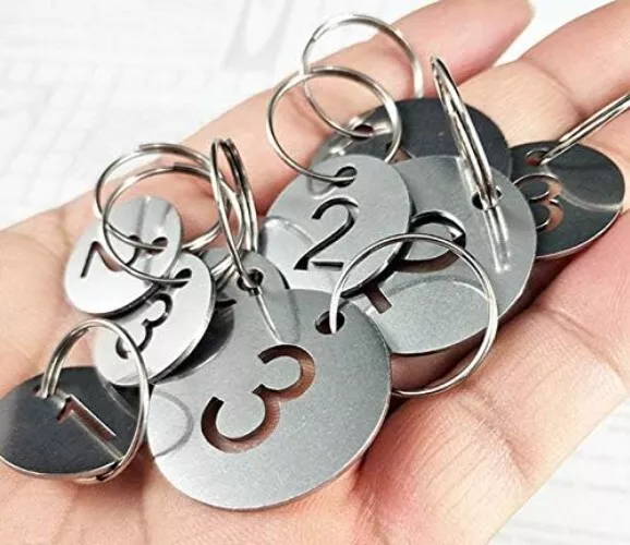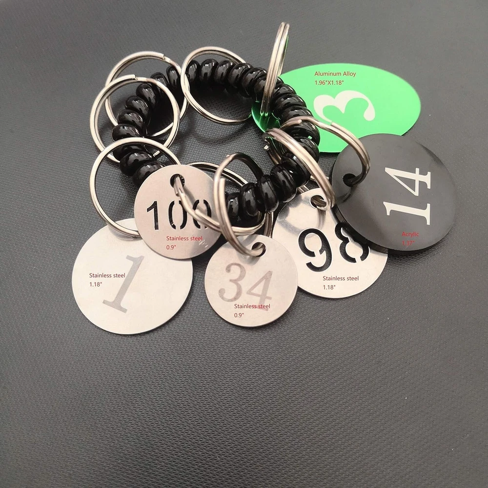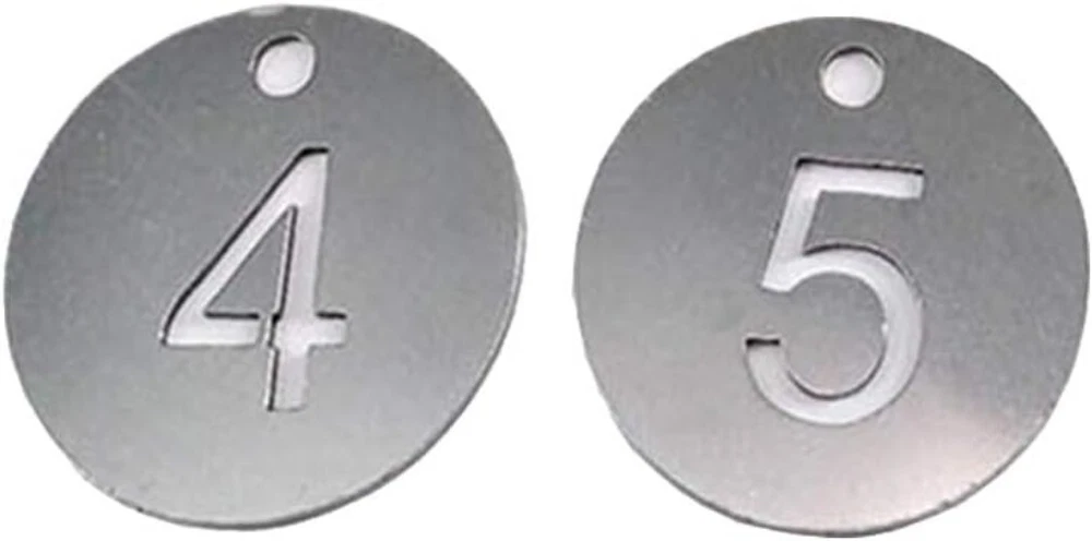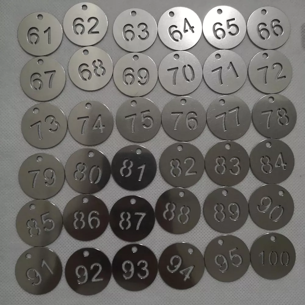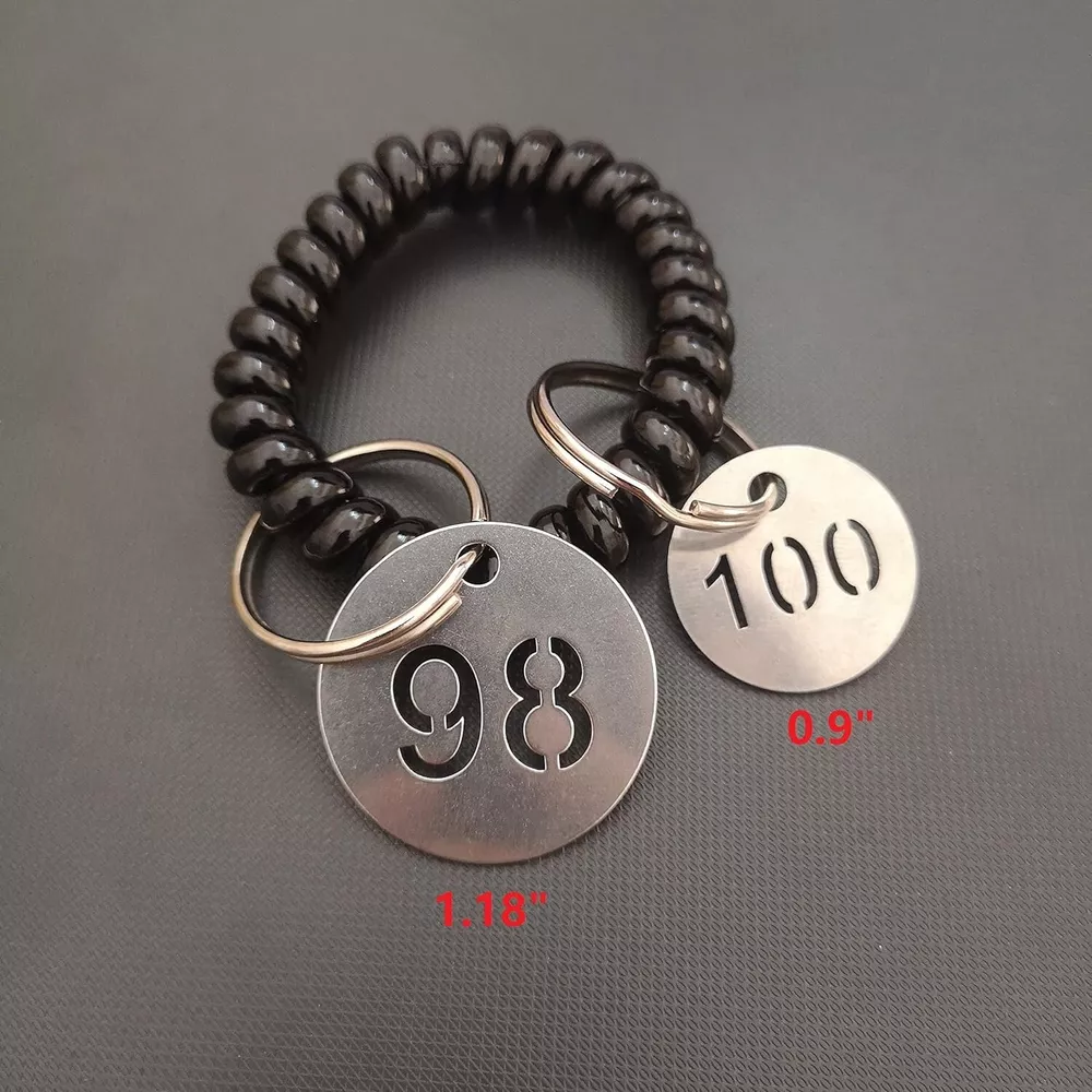 Diameter Inches Bigger Hollowed Stainless Steel Number Tags Key Tags with Rings 1-100 Material: 304 Stainless Steel Tag Size: " DIA . It's a bigger and heavier edition compared to size ". These tags can withstand corrosion, general handling, extreme can even be burnt in fire and boiled in water. The number will never fade because it's hollowed. Idea for gyms、sauna rooms 、 hotels、schools、office and etc.. Notice: Tags and key rings are not assembled. Need to be assembled yourself.