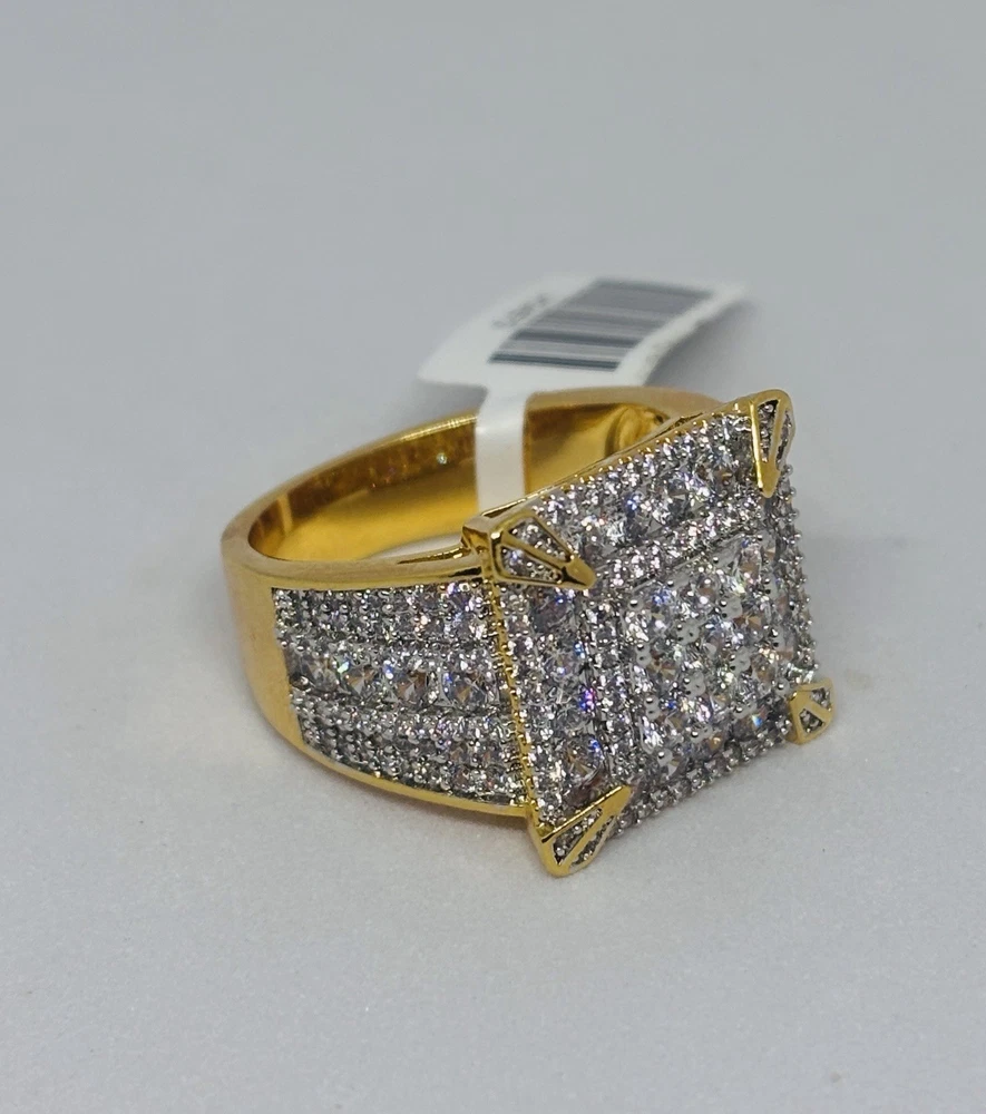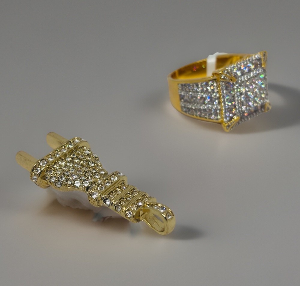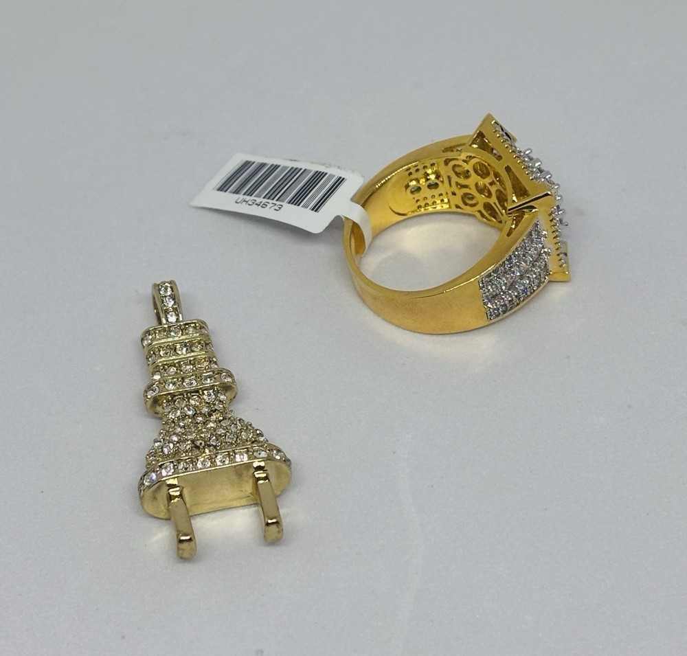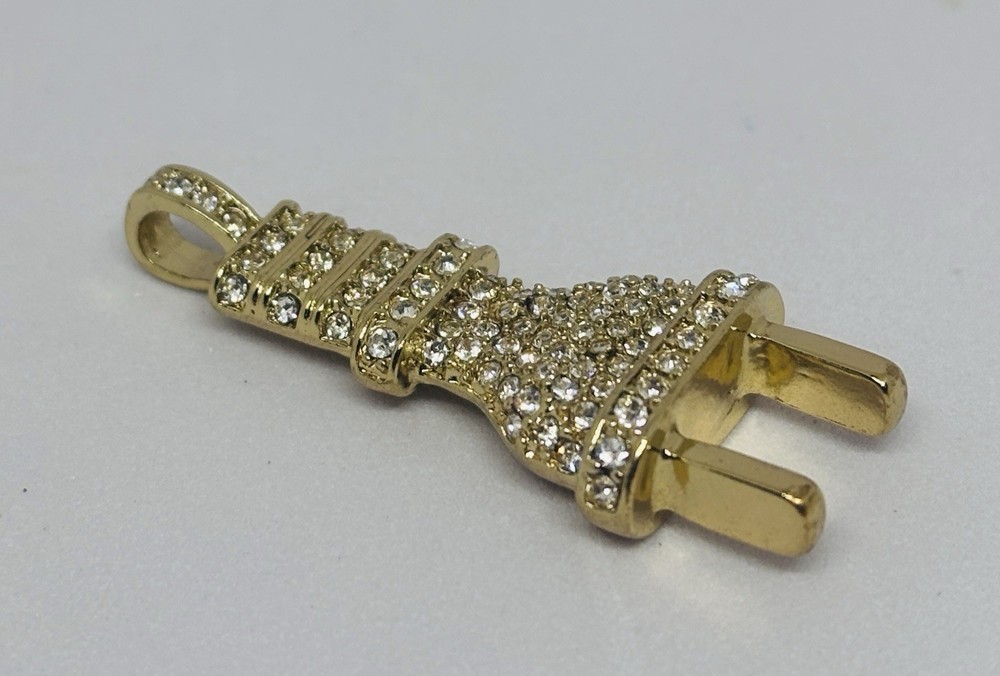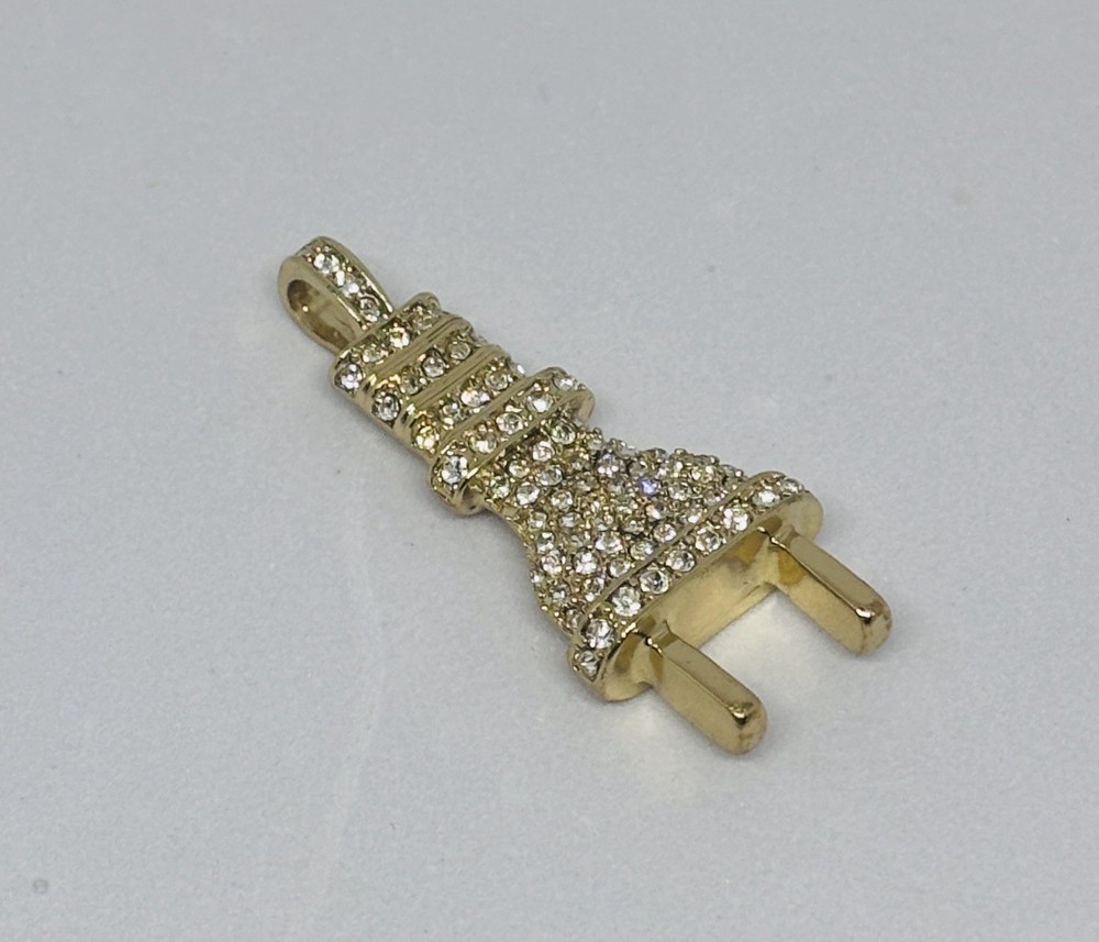 The product is a unique set that includes a diamond ring in size 10 and a gold pendant set with an electric power plug design. The pendant setting is branded by Electric, making it a stylish and eye-catching accessory for men's jewelry collection. The combination of the ring and pendant set adds a touch of luxury and modern flair to any outfit, making it a standout piece for any jewelry enthusiast.