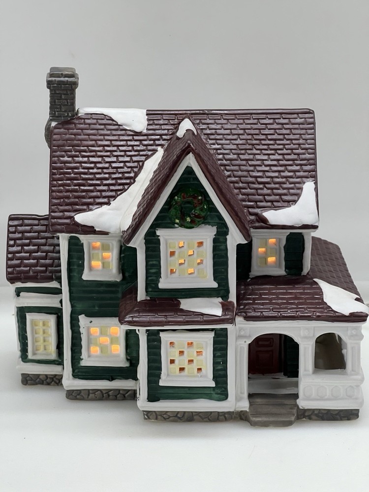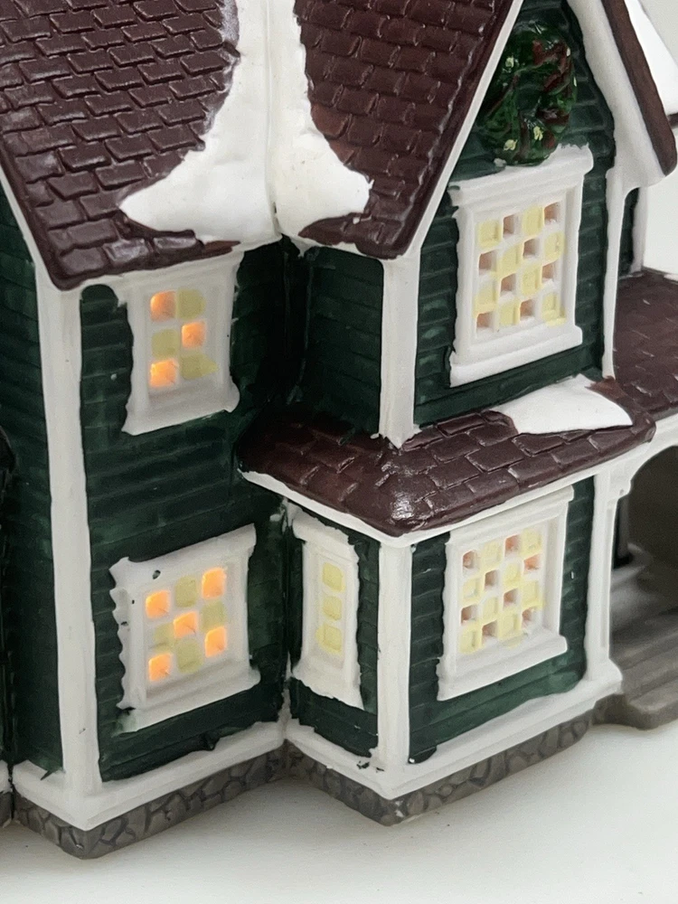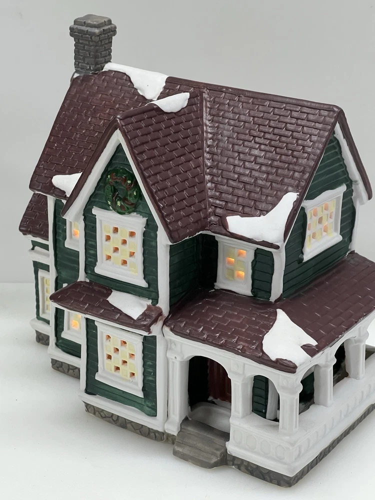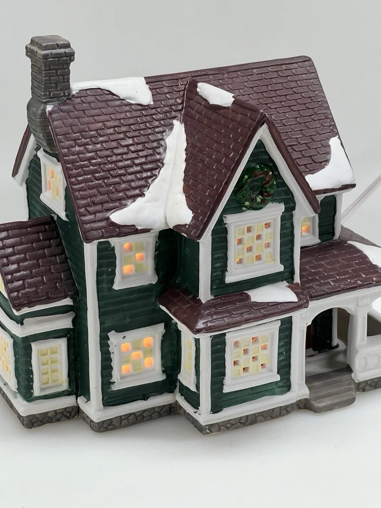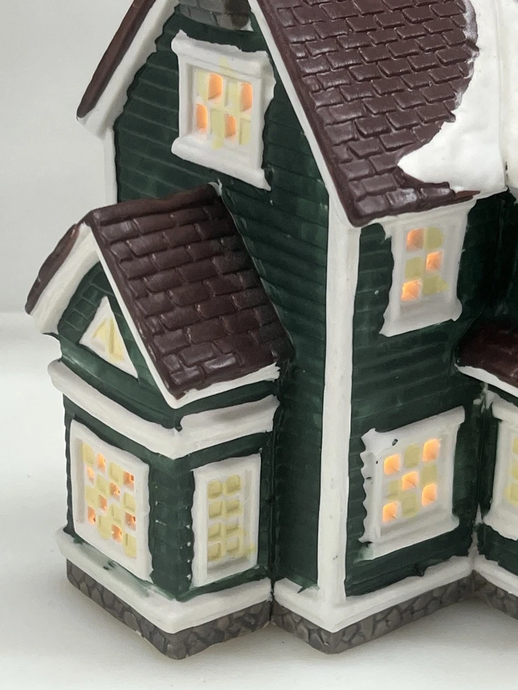 This Dickens Collectables Victorian Series 266-6220 Lighted House is a charming addition to any Christmas Village display. The porcelain house features a whimsical Victorian home with multicolor paint finish. The lighted house is suitable for any room and is perfect for creating a festive and seasonal atmosphere. The house measures 8 inches in length, 7-1/2 inches in height, and 5 inches in width, making it a medium-sized piece. The house was manufactured in 1994 and is in mint condition, both the house and the box. This collectibles item is a great gift for adults who love Dickens, Christmas, and seasonal villages. Absolutely incredible pristine condition. Includes all original packaging including cord & light .