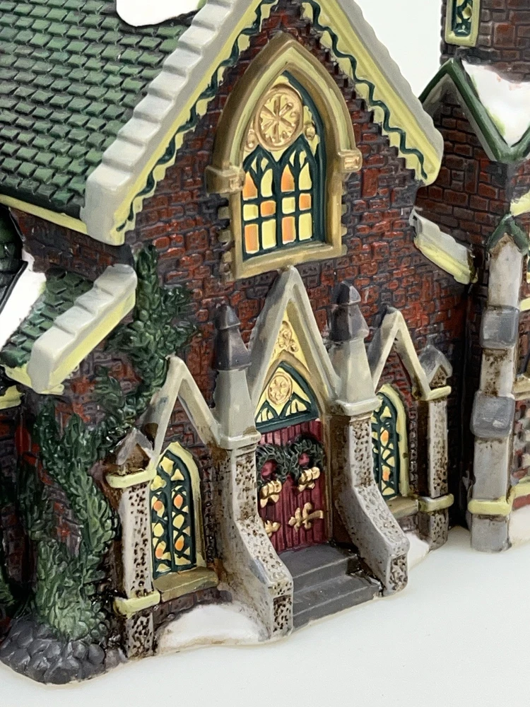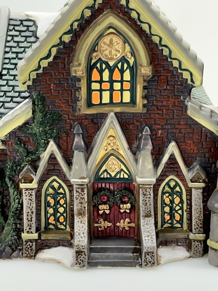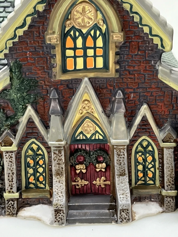 This Dickens Collectibles "Wedding Chapel" lighted house is part of the Victorian series from 1998. The medium-sized building features a whimsical design, 3D effect, and hand-painted details. It is suitable for a seasonal village display and has an illuminated feature. The Victorian style, multicolor finish, and porcelain material add to its charm, making it a lovely addition to any room during the Christmas season. Perfect pristine condition with all original packaging including light & cord 1998 !!