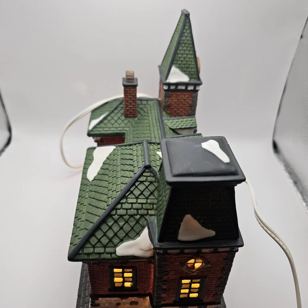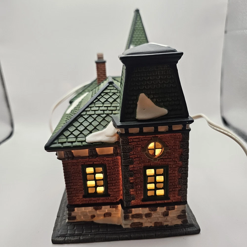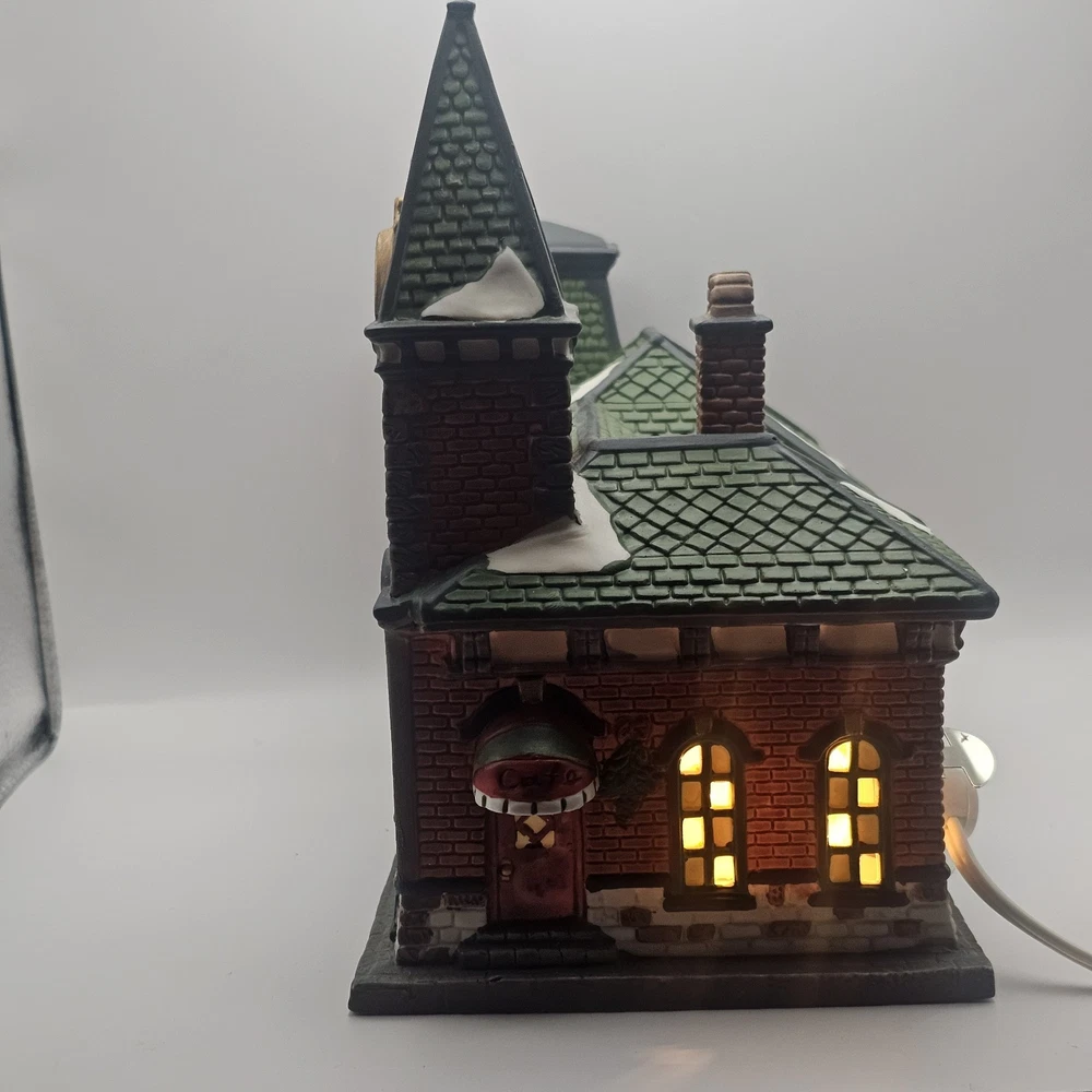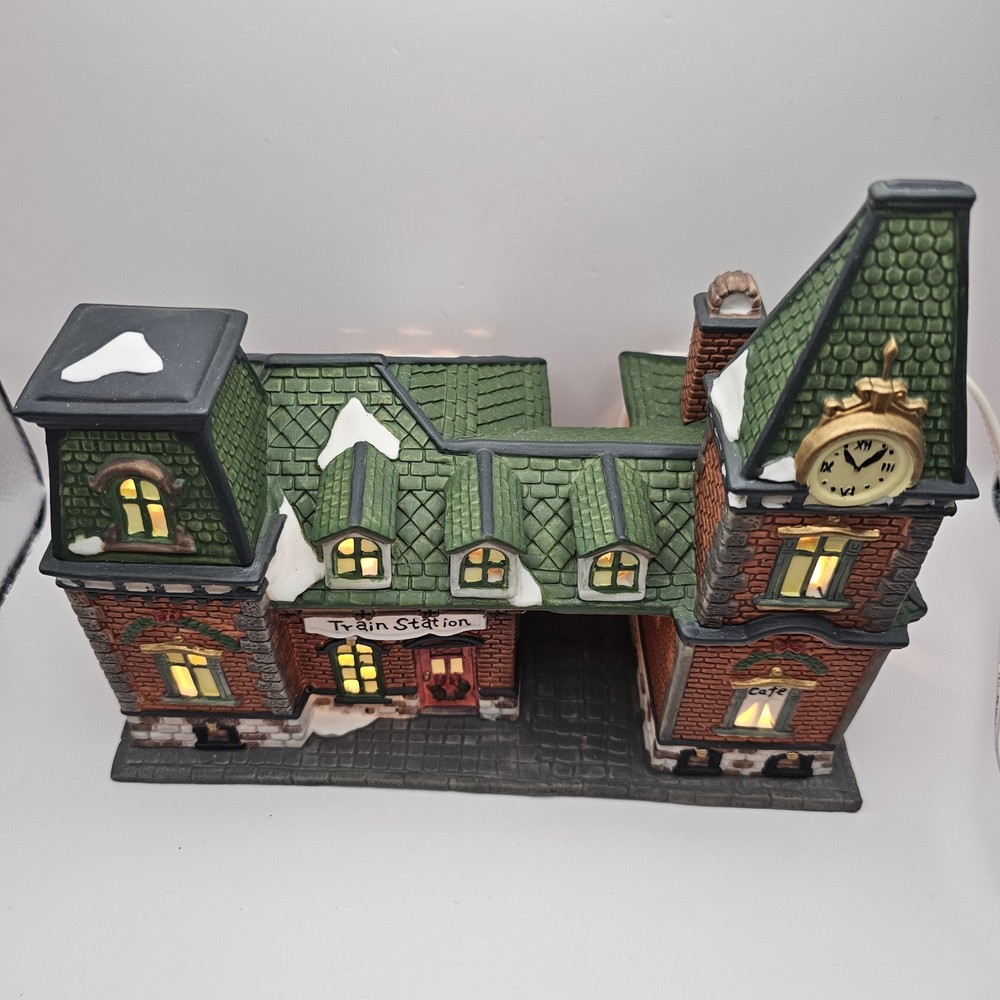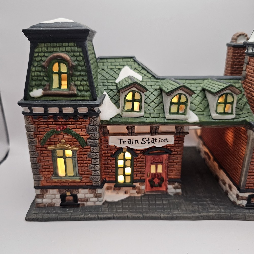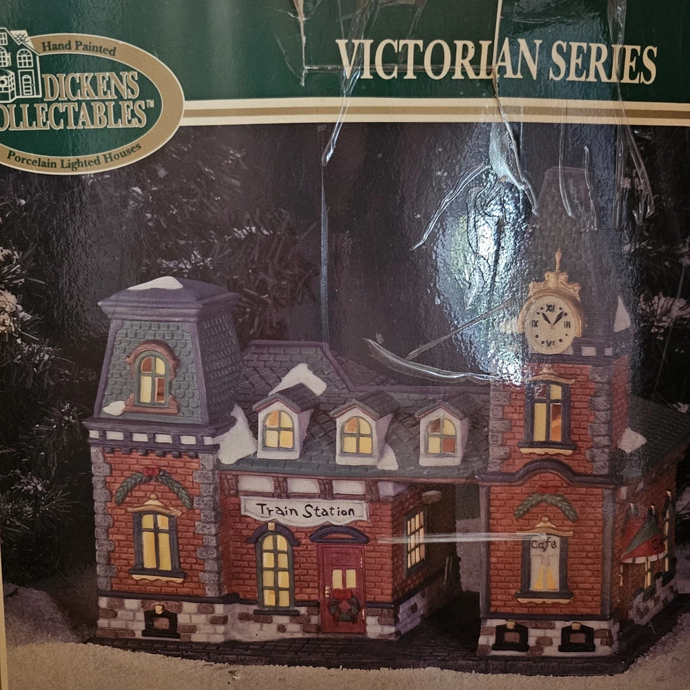 This beautiful collectible from Dickens Collectibles features a Victorian series lighted train station and cafe. Made from porcelain, it was manufactured in 1998 and is suitable for indoor use in areas such as the cloakroom, office, bedroom, living room, lounge, or dining room. The piece is approximately 9" in length, 7" in height, and 4 1/2" in width and comes in a box for safekeeping. The train station and cafe are beautifully decorated with multicolors and features a train subject, making it perfect for Christmas and seasonal decor. This original piece is signed and part of the Victorian Series collection. Add this unique and timeless piece to your collection today! Original box Mint condition