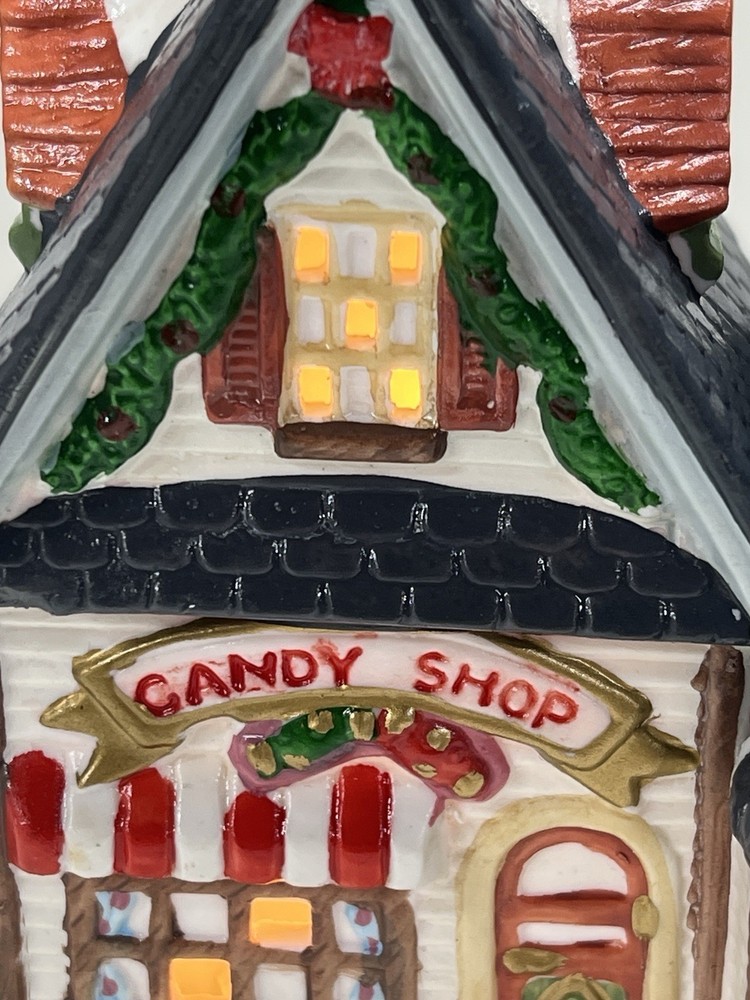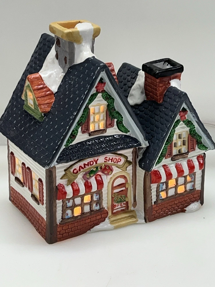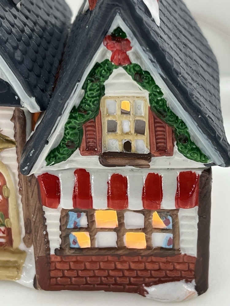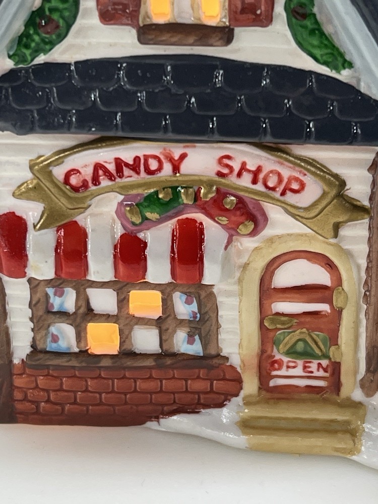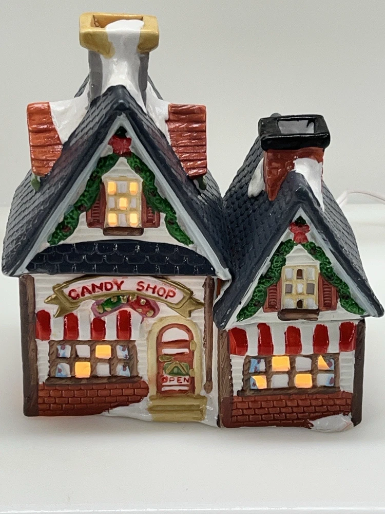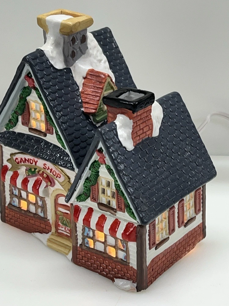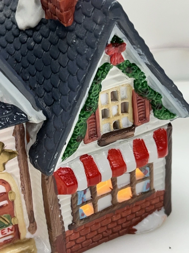 This charming Dickens Collectables Towne Series Candy Shop Village House O’Well from 1994 is a must-have for any collector of Christmas villages. The asymmetrical, hand-painted porcelain house features a whimsical candy shoppe design with multicolor accents and a illuminated interior. It comes boxed and retired, making it a rare find for those looking to add to their collection. Perfect for any room, this Victorian-style house is suitable for seasonal village display and would make a great addition to any holiday decor. The house measures 6-1/2" in height, 6" in length, and 4" in width, and was manufactured in China in the late 20th century. Don't miss out on the chance to own this delightful piece from the Dickens Collectables brand. Perfect condition! Comes with all original packaging including light & cord
