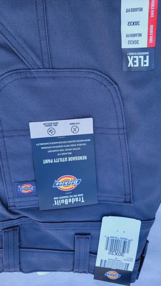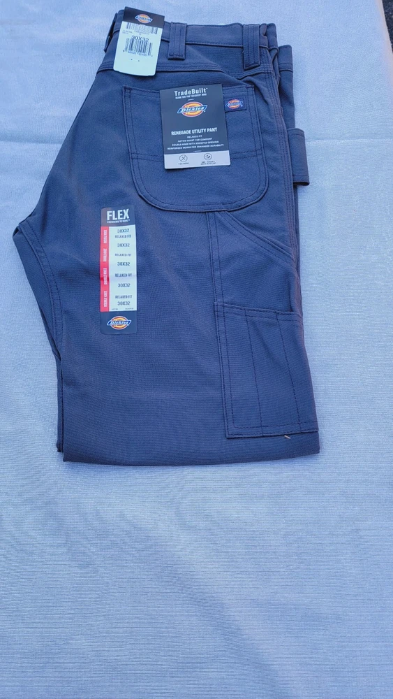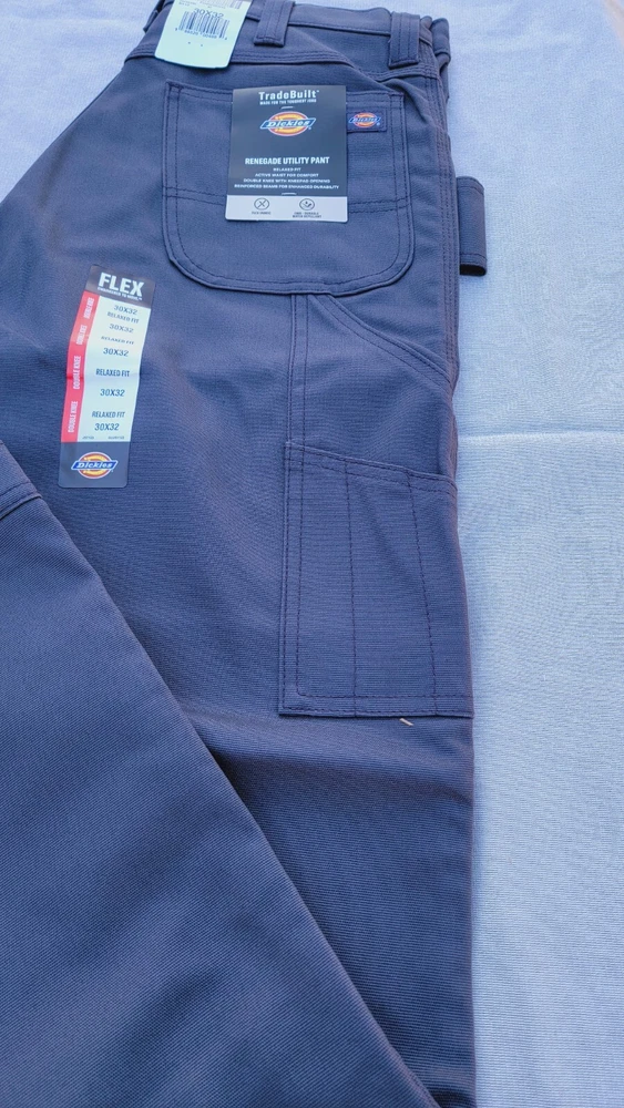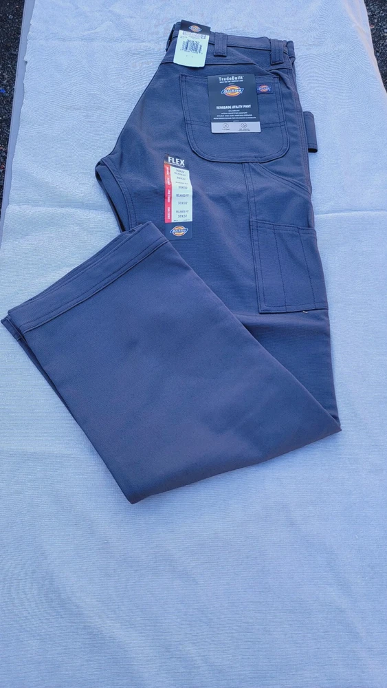 Dickies carpenter work pants. Size 30/32. Gray. Renegade Utility pants with double Knee, Knee pad opening, Flat Front, 5 pocket design. Relaxed Fit Flex. Machine washable.