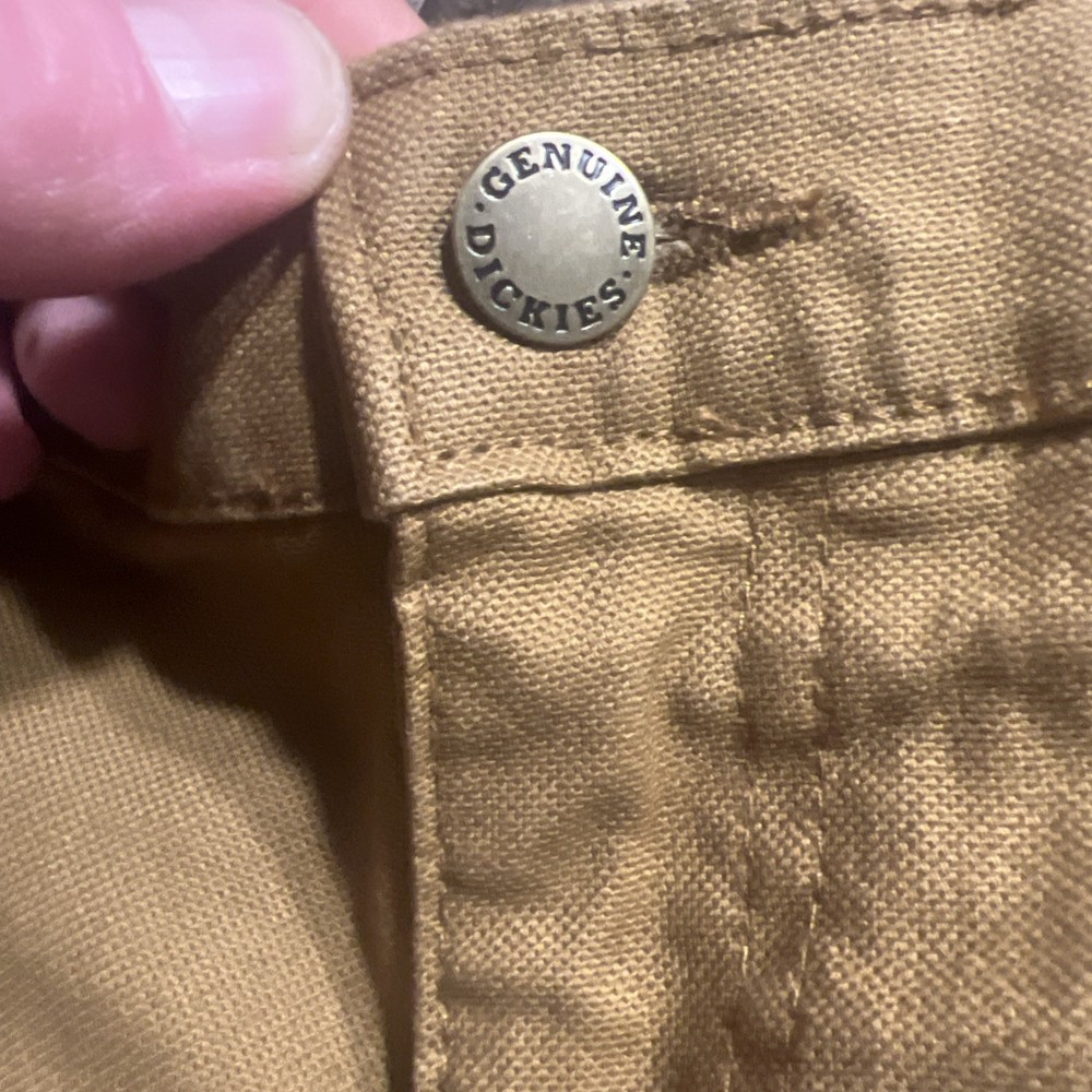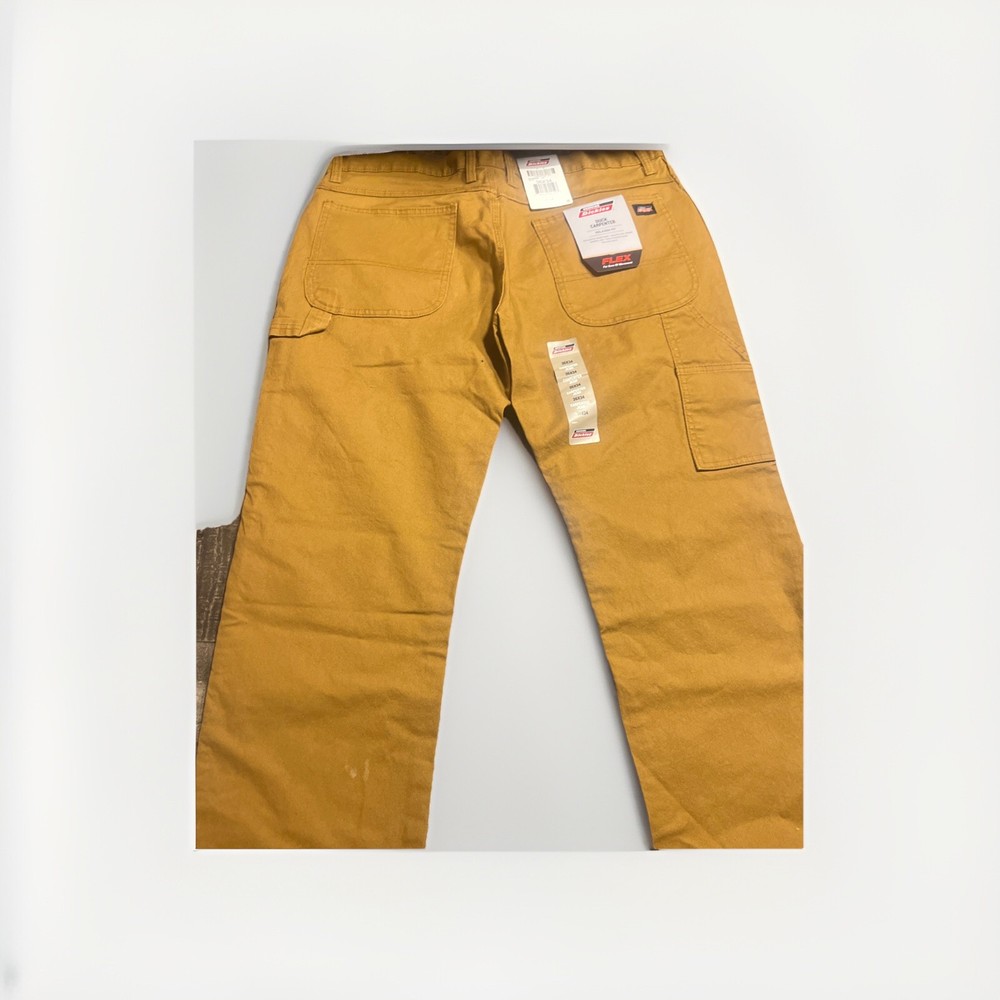 The Dickies Flex Duck Carpenter Relaxed Fit Men's Work Pants in size 36x34 and tan brown color offer a durable and comfortable option for men's workwear. Made from cotton with a Canvas fabric type, these pants feature a relaxed fit and straight leg style, making them suitable for various occasions such as travel, casual wear, and workwear. The pants also include accents like buttons, zippers, and the Dickies logo, along with features like easy care, comfort, and pockets, providing practicality and style for the modern man.
