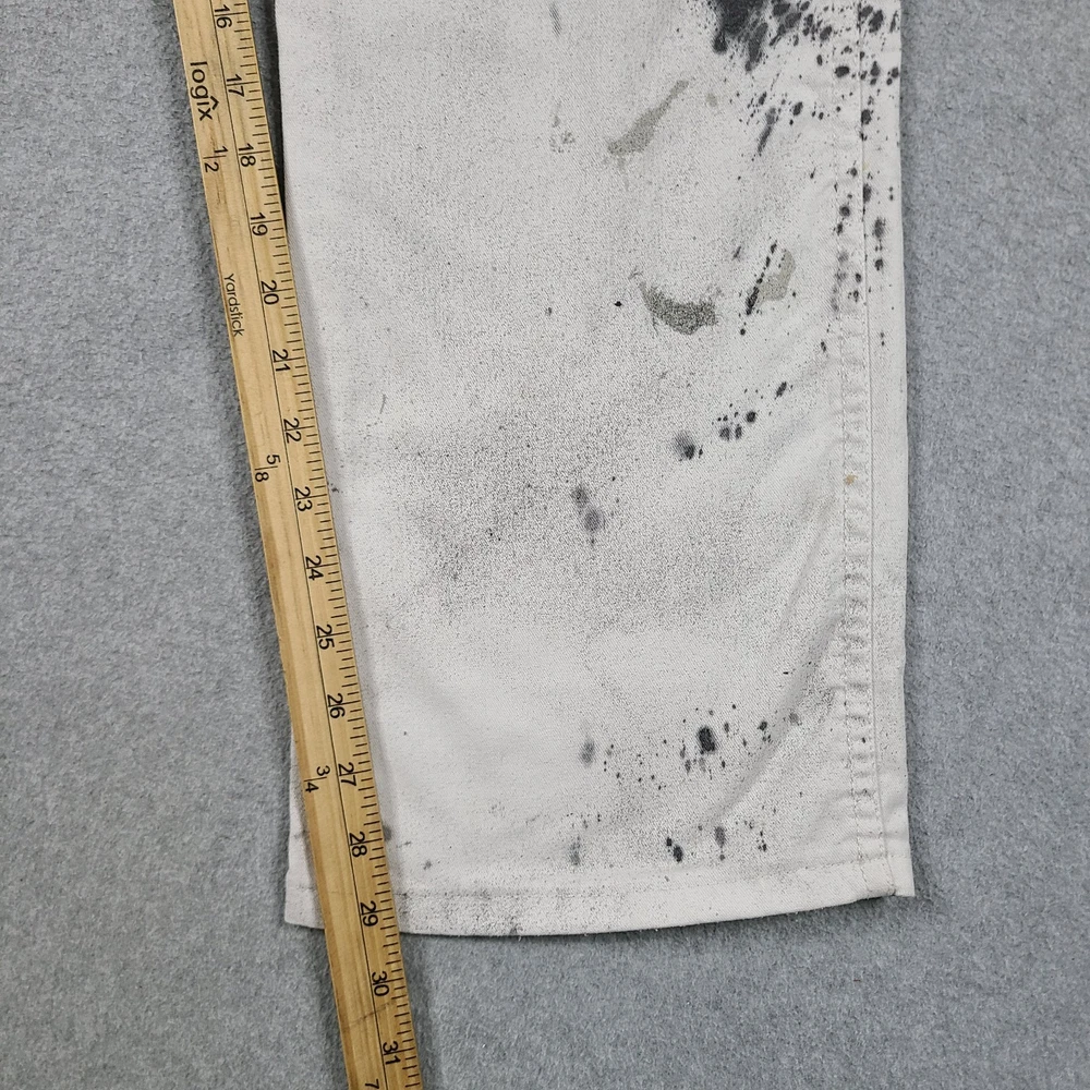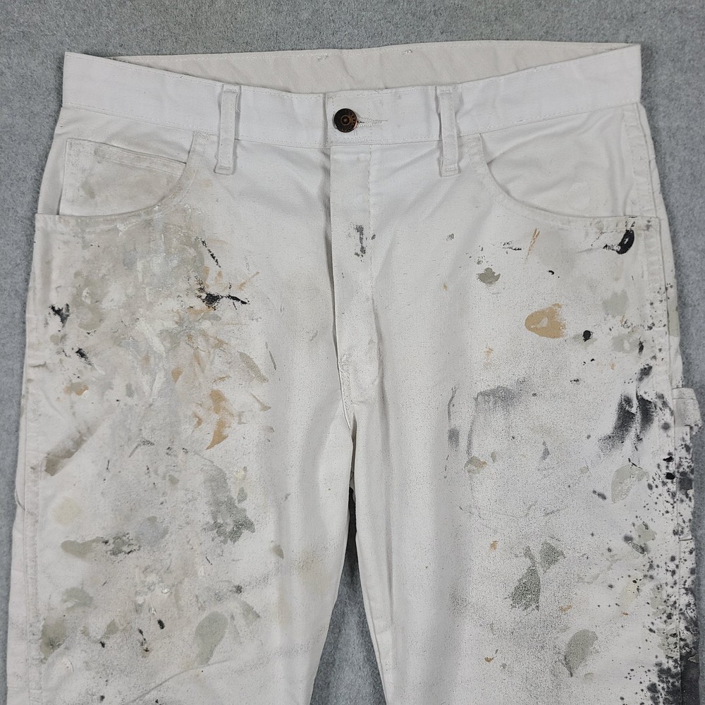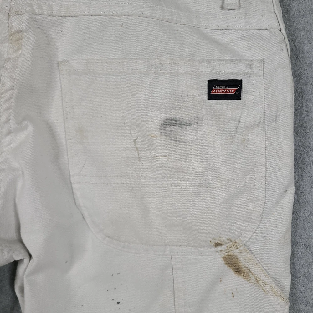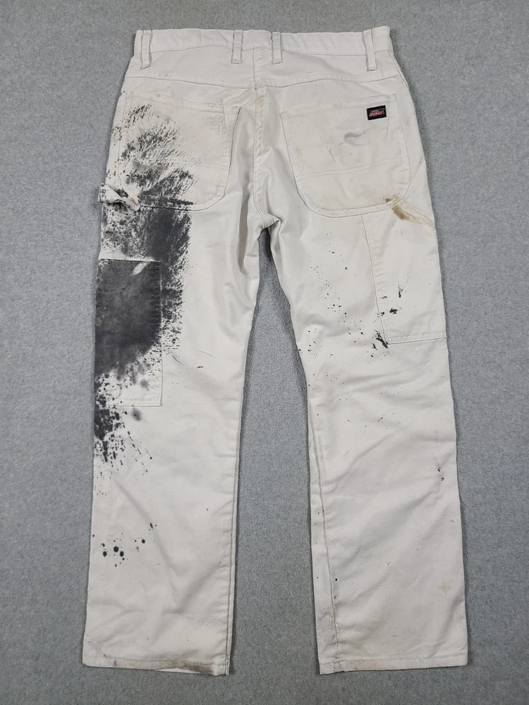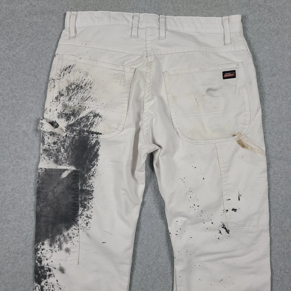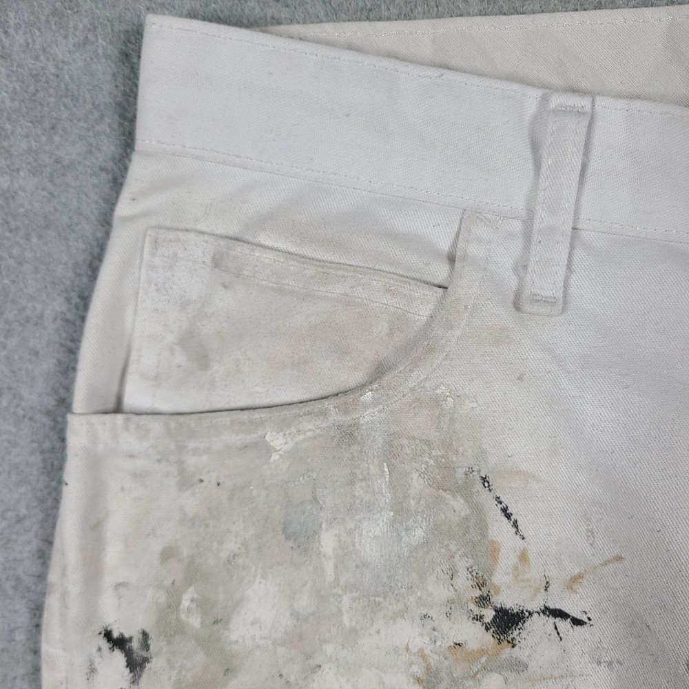 The product is a pair of Dickies Men's Pants in size 32x31, designed for utility, carpentry, or painter work. These white pants feature a mid-rise and straight leg style, with a comfortable cotton denim fabric and easy care properties. The pants have a zipper and button closure, along with various pockets for convenience. The logo and theme of the Dickies Sherwin Williams product line add a touch of grunge and art to the overall design, making them suitable for casual or workwear occasions in any season.
