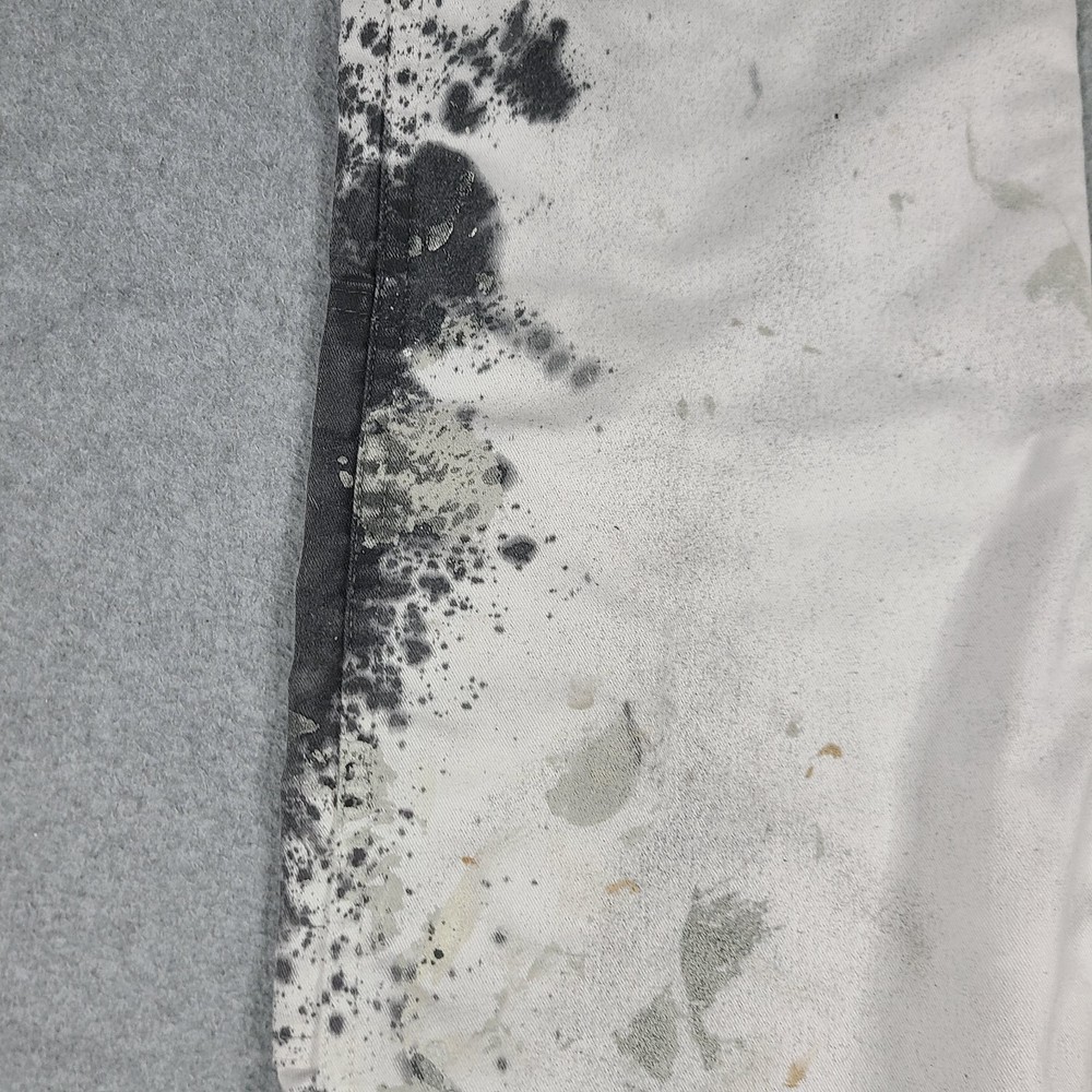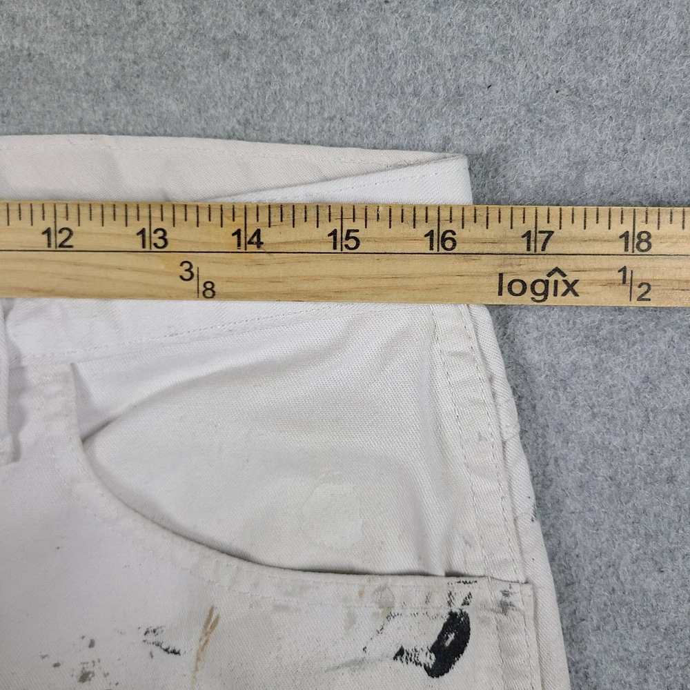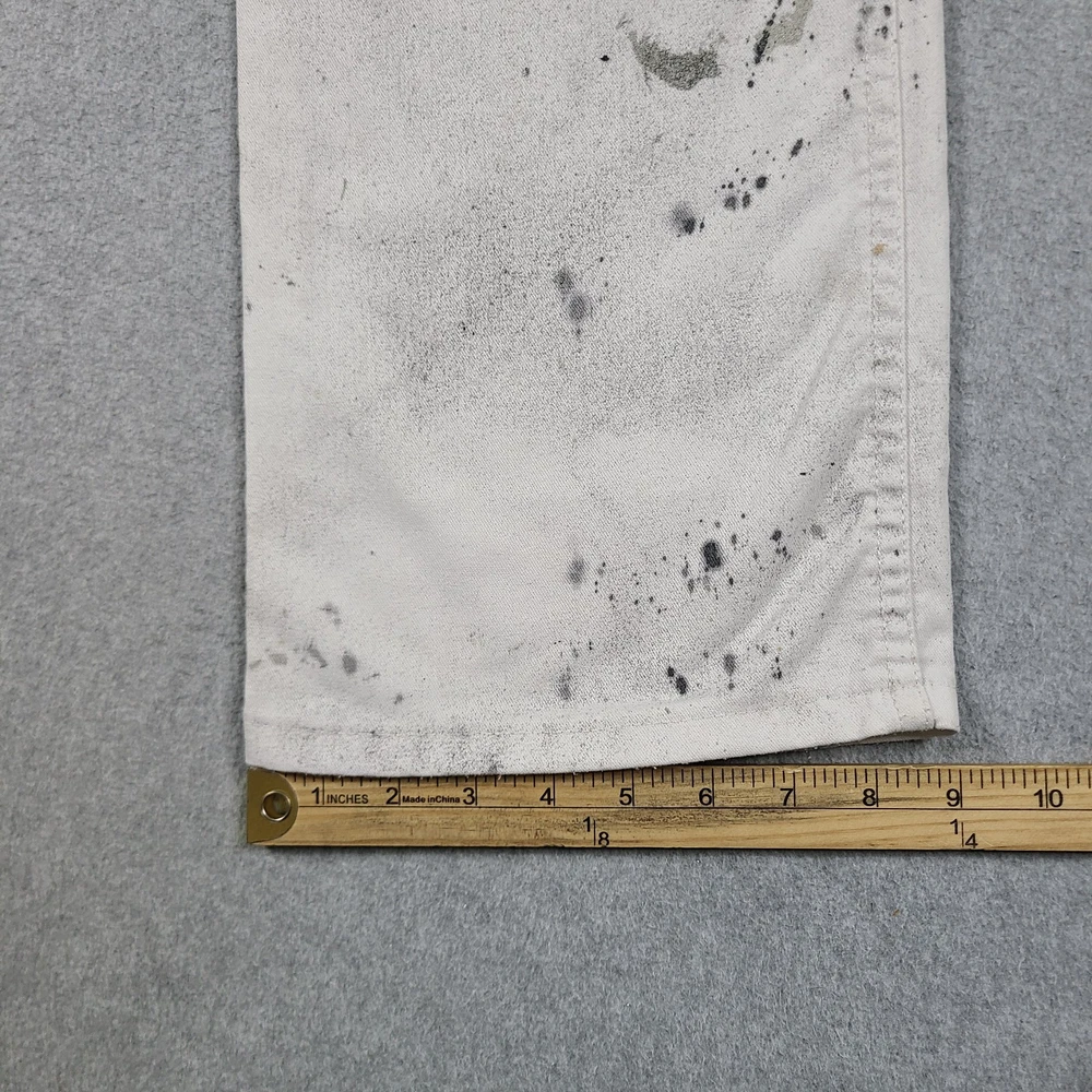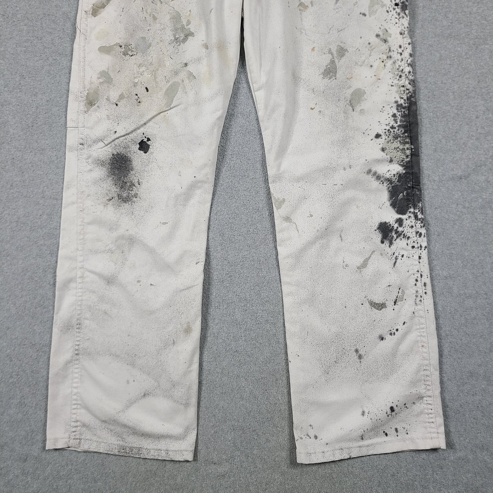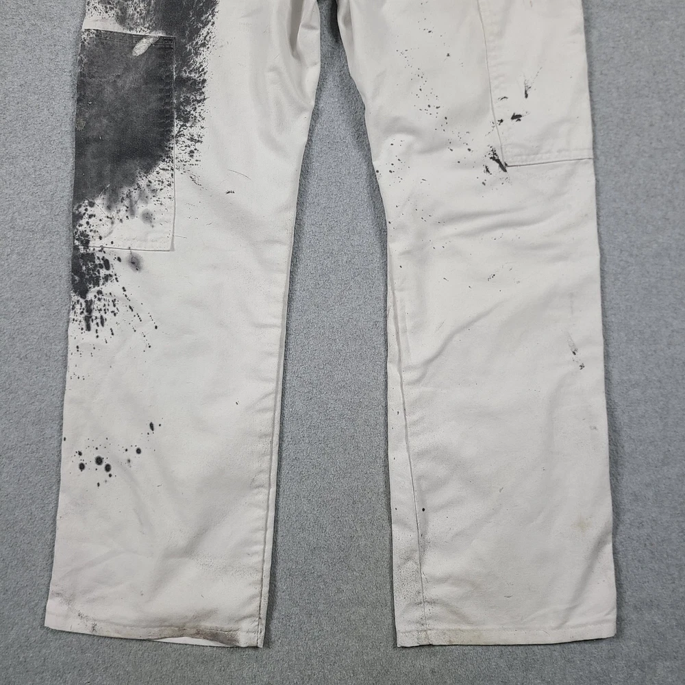 The product is a pair of Dickies Men's Pants in size 32x31, designed for utility, carpentry, or painter work. These white pants feature a mid-rise and straight leg style, with a comfortable cotton denim fabric and easy care properties. The pants have a zipper and button closure, along with various pockets for convenience. The logo and theme of the Dickies Sherwin Williams product line add a touch of grunge and art to the overall design, making them suitable for casual or workwear occasions in any season.