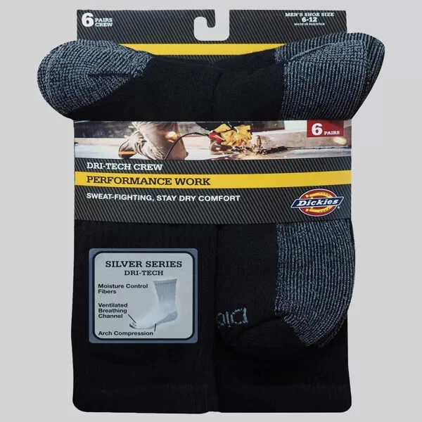 Dickies Men's Dri-Tech Crew Socks - Black, Size 6-12, 5 Pair