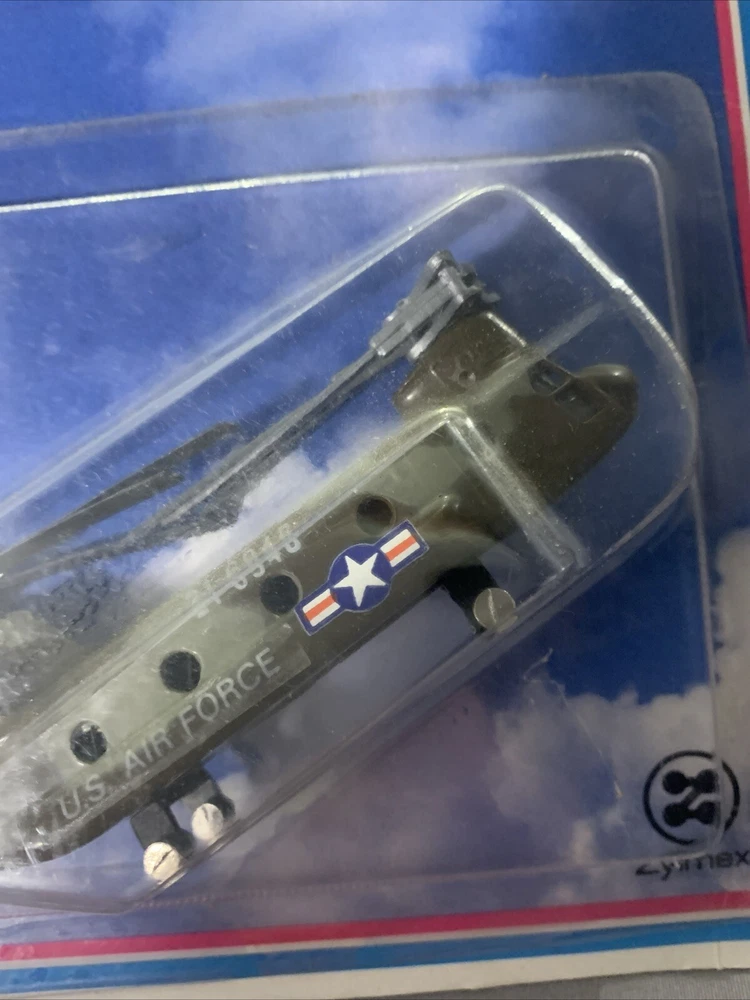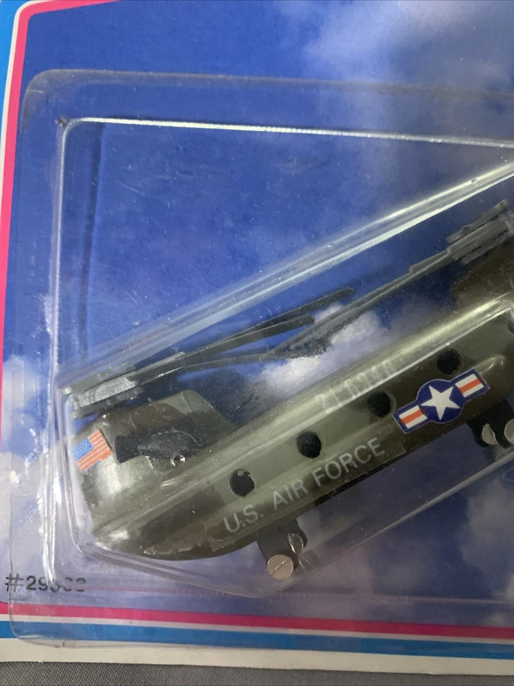 This Diecast US Air Force Chinook Copter A122 is part of the Zee Toys Dina Flites series. The helicopter model is in a vibrant green color and is made of diecast material. It is a vintage manufacture toy that replicates the Air Force Chinook Copter, known for its durability and detailed design. Perfect for collectors or aviation enthusiasts, this Zee Toys helicopter is a timeless piece that showcases the craftsmanship and quality of vintage diecast vehicles. Slight wear on card