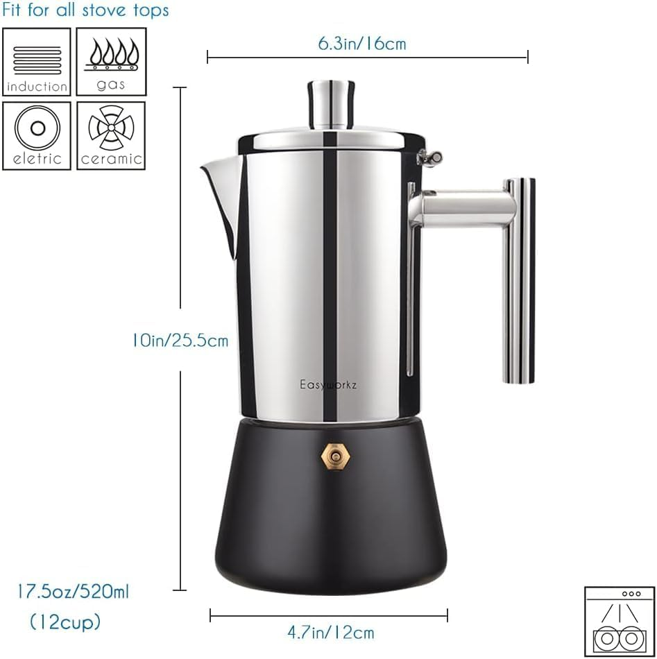 [Elegant and Heat Resistant Design] Used the latest manufacturing technology and combined aesthetics to design this elegant espresso coffee pot. The heat resistant hollow insulated lid and handle grip make it convenient to use. Base is non-stick high temperatured black hard-wearing coating, ensuring its long life time at high temperatured heat resource. [Premium Quality 18/8 Stainless Steel Moka Coffee Pot] Made of 18/8 Stainless Steel with high mirror polishing processed. The ability of anti-rust and corrosion is also the best. Can be used for all kinds of heat resource, such as gas stove , induction burner , electric cooktop.Easy to clean and disassemble. Dishwasher safe. [12 Cups of Espresso ] Could brew 12 full espresso cups (17.5 fl.oz/520ml). Brew with our coffee maker, your coffee will be extra strong ,rich and aromatous. We suggest brew with 40g fine grinding coffee and water for its best tasting. [Reducer&Safe Valve Included] With this coffee reducer, you could make less espresso one time to meet your unique taste. Takes less than 5 minutes to brew on heat and designed with the valve for the double safety. [Well made and Inspected in Own Factory] Made and quality inspected in own factory. Over 10 years' coffee maker manufacturing experience ensures its great quality and we provide 24 months quality guranteed after sale service. Product Description Easyworkz has created this high grade stovetop espresso maker with modern manufacturing technology and crafted to meet the top standards in this industry. Featuring a heavy gauge 18/8 stainless steel construction with high mirror polishing,induction base and fit for all stove tops. It is our Diego Coffee maker! Fresh espresso,classically brewed in a nice and elegant espresso maker. Our Diego espresso maker has an elegant classy design and will be your lifetime moka pot. Enjoy your coffee and have fun everyday with Our Diego coffee maker. Dishwasher safe - Easy to brew and clean stovetop espresso moka coffee pot Tip 1 **For safety, there will be residual water in the boiler to prevent over burning.** If you wish to make less espresso, fit the boiler half way to the safety valve with water and insert the reducer into the funnel. Add your ground coffee on the top of the reducer. Allow the moka pot to cool down before open it to wash. For the best results, always wash your espresso maker by hand. For the best tasting, brew with Fine grinding coffee and filtered water. Tip 2 **The boiler of the espresso maker is generally rustproof.** To keep it that way, we ask you kindly to: Use medium heat during brewing, do not overheating. Clean the boiler after each use. Dry it completely with a soft towel or air-dry. Design Elegant and timeless design of stainless steel with non-stick high temperatured black hard-wearing coating. Suitable for induction Suitable for all common types of cookers, like induction, gas, Ceramic and electric cooktop. Quality Made of stainless steel with Italian Safety valve. Dishwasher safe. Easy to clean Easy to disassemble and install. Step 1,Fill with water Unscrew the water container and fill cold water into it and not up to the MAX line. Step 2,Add coffee powder Fill the funnel with the ground coffee powder,smoothen the level gently and place it on the water container.Then screw the upper and lower parts together tightly. Step 3,Making coffee Place the espresso maker on a source of heat.Boil the coffee over medium to high heat so it doesn't burn and taste bitter. Step 4,Enjoy your coffee Take the pot straight off the stove as soon as the coffee continues to pour into the upper part.Pour your freshly brewed espresso coffee into a cup and enjoy it. Fill with water Add coffee powder Making coffee Enjoy your coffee