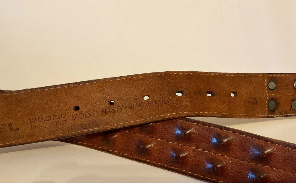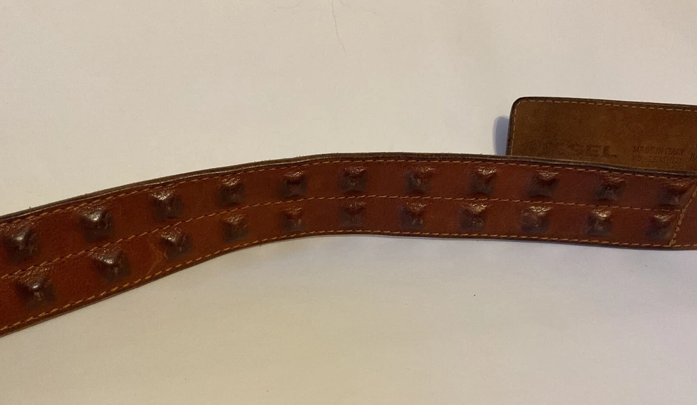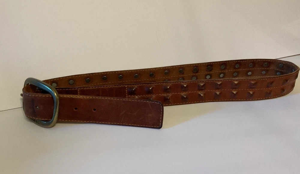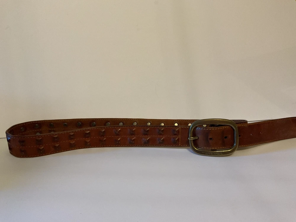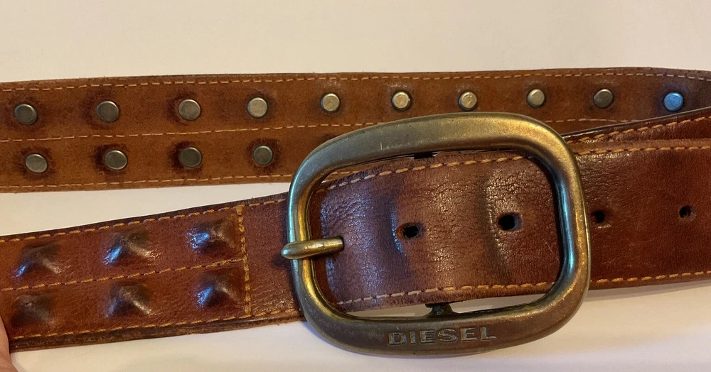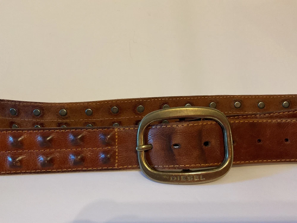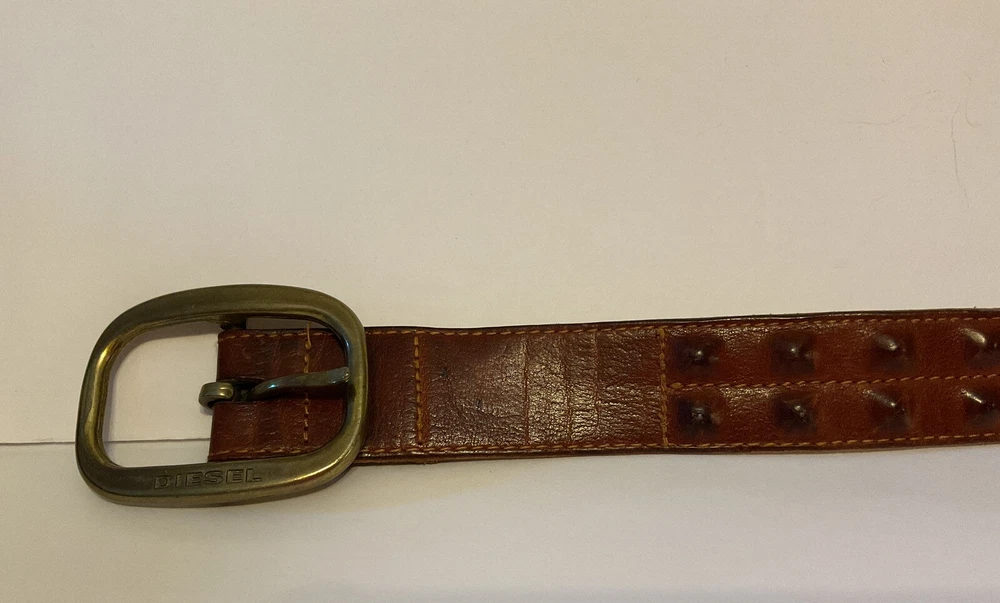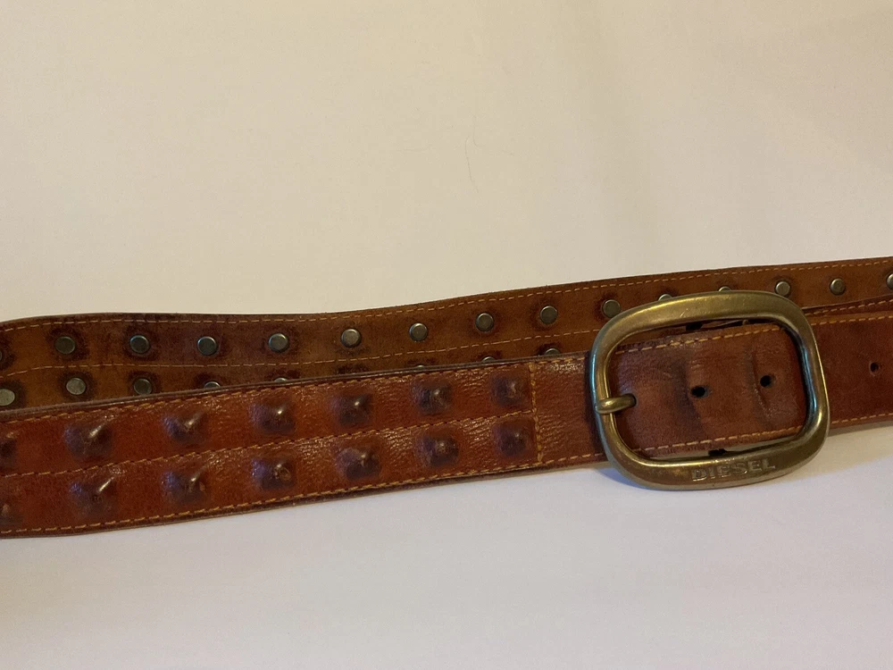 Elevate your style game with this stunning brown leather belt from Diesel, made in Italy. The belt boasts a studded design, with brass hardware accents that add a touch of sophistication to any outfit. The leather cover pyramid studs are a unique touch that sets this belt apart, making it a must-have for any fashion-conscious man. The high-quality leather material ensures durability and longevity, while the Italian-made belt guarantees designer-quality. Add this beautiful belt to your collection today and take your style to the next level. THIS BELT CAN BE UNISEX TAG - 38” 1 1/2” WIDE SOFT QUALITY MADE LEATHER BRASS? BUCKEL. SMOKE FREE HOME PLEASE FEEL FREE TO ASK QUESTIONS. VIEW ALL OF THE PICTURES FOR A BETTER VISUAL DESCRIPTION