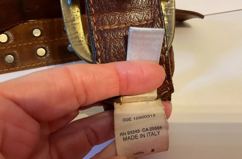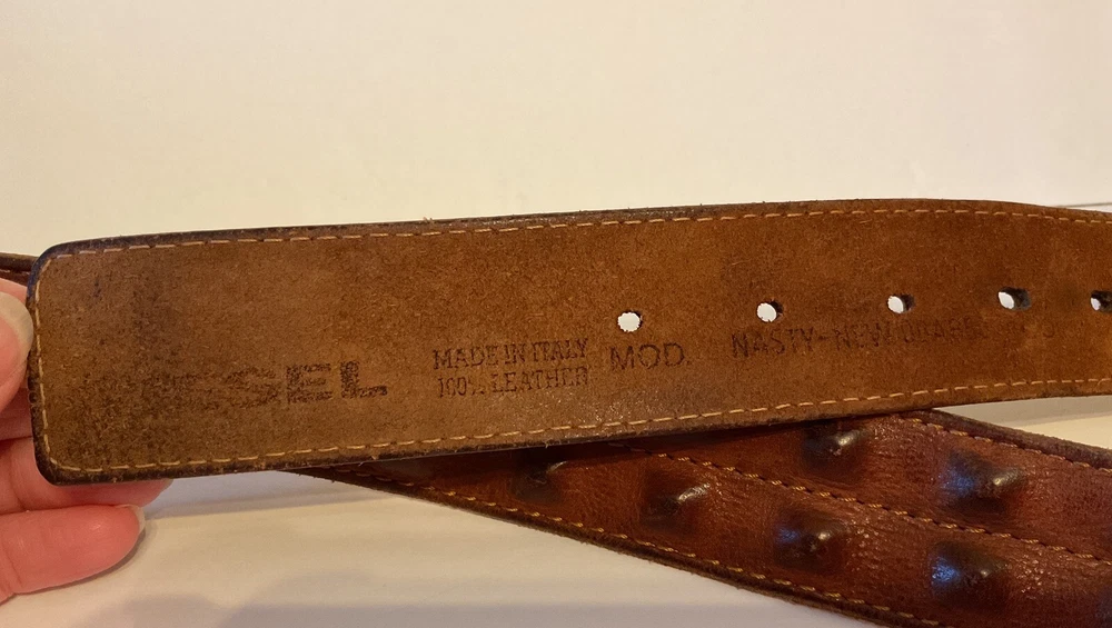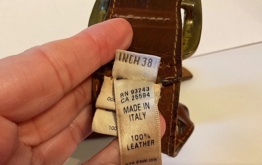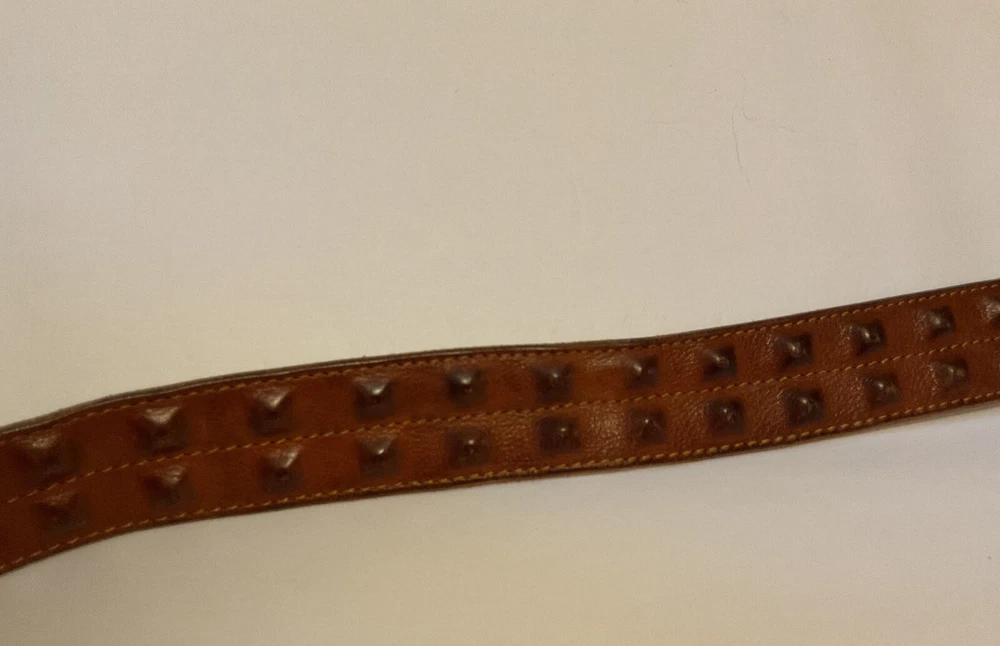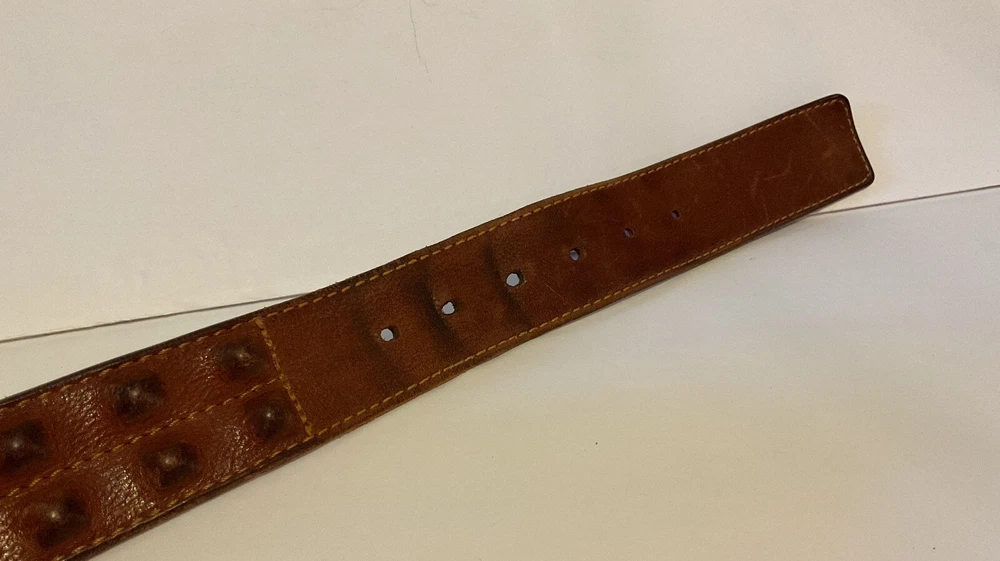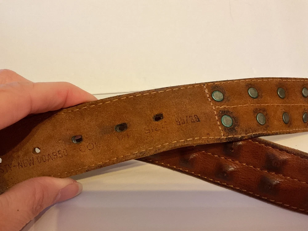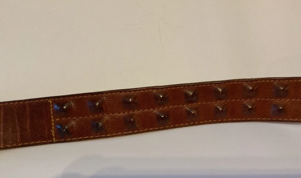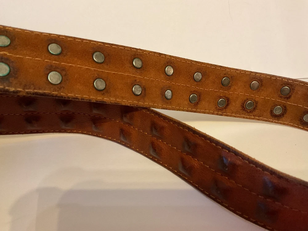 Elevate your style game with this stunning brown leather belt from Diesel, made in Italy. The belt boasts a studded design, with brass hardware accents that add a touch of sophistication to any outfit. The leather cover pyramid studs are a unique touch that sets this belt apart, making it a must-have for any fashion-conscious man. The high-quality leather material ensures durability and longevity, while the Italian-made belt guarantees designer-quality. Add this beautiful belt to your collection today and take your style to the next level. THIS BELT CAN BE UNISEX TAG - 38” 1 1/2” WIDE SOFT QUALITY MADE LEATHER BRASS? BUCKEL. SMOKE FREE HOME PLEASE FEEL FREE TO ASK QUESTIONS. VIEW ALL OF THE PICTURES FOR A BETTER VISUAL DESCRIPTION