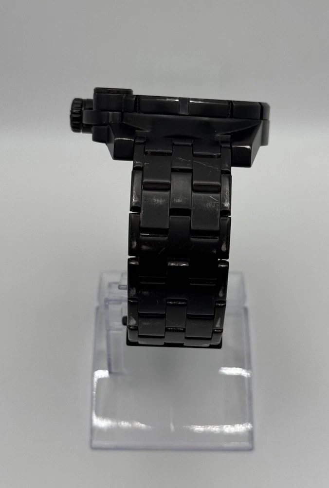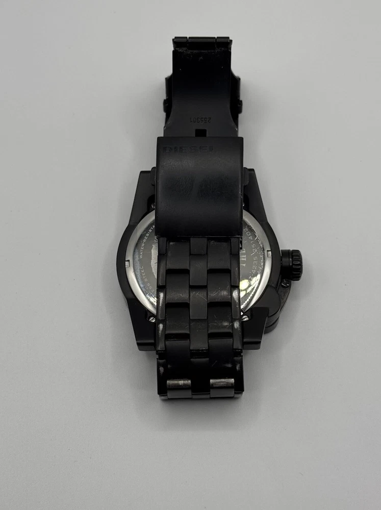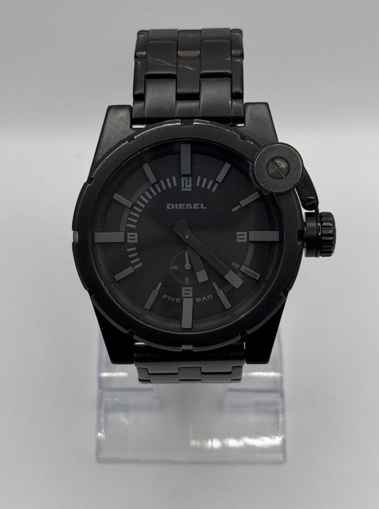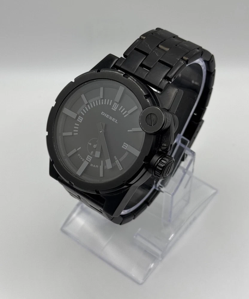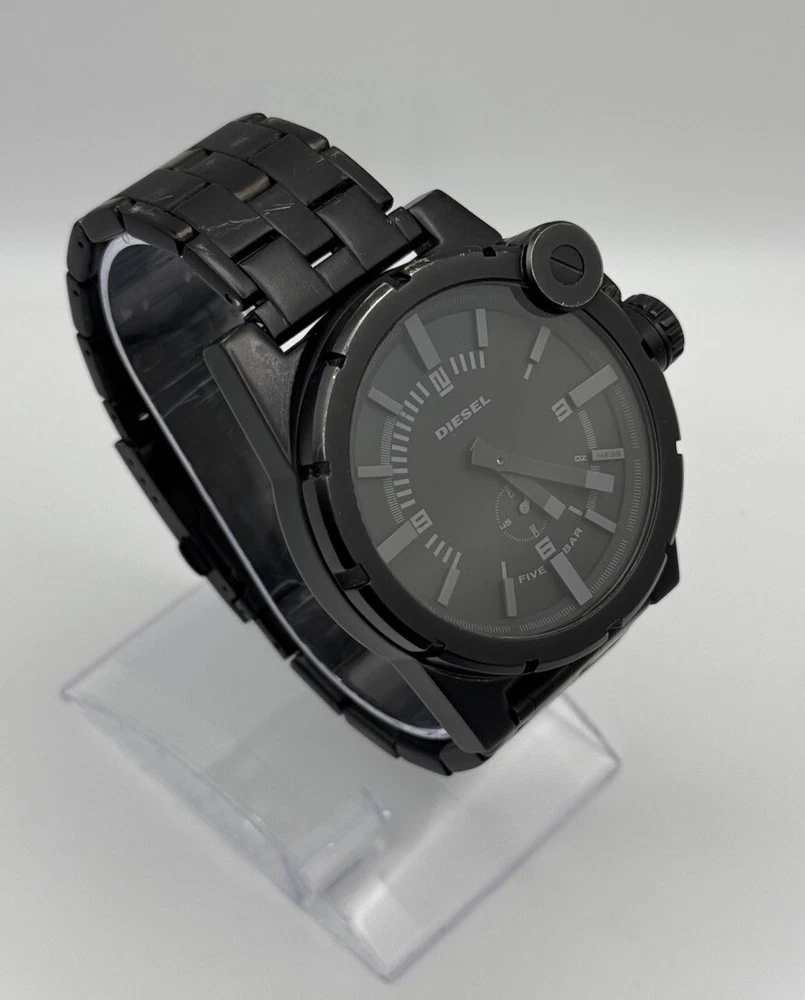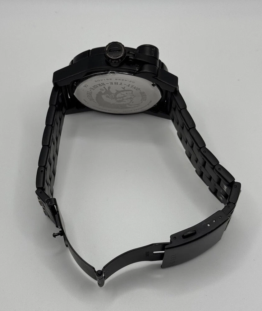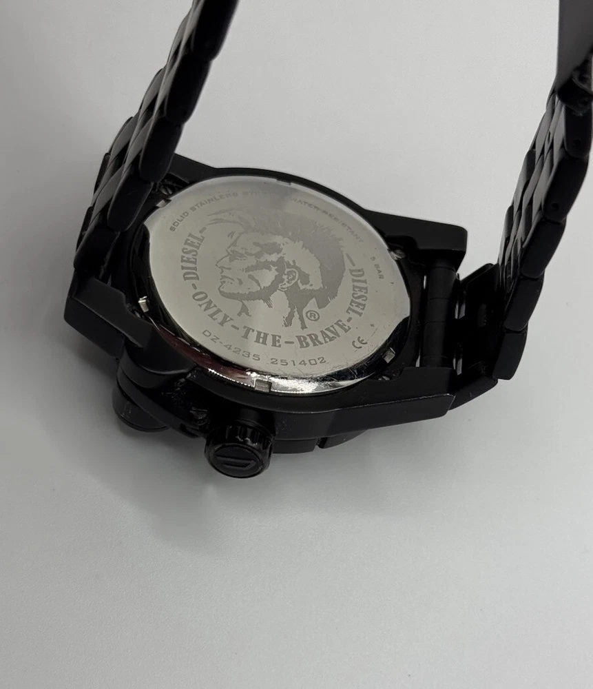 Indices: Arabic Numerals, Baton Indexes Watch Shape: Round Customized: No Department: Men Dial Color: Black Number of Jewels: 0 Caseback: Screwback Seller Warranty: No With Original Box/Packaging: No Brand: Diesel Vintage: No Band Width: 24 mm Style: Casual, Classic, Sport Movement: Quartz Case Finish: Matte Handmade: No Features: 12-Hour Dial, Mineral Crystal, Push/Pull Crown, Screwdown Crown, Small Second, Water-Resistant, Signed Crown, Original, Signed Bracelet Type: Wristwatch Band Color: Black Bezel Color: Black Band Material: Stainless Steel Band/Strap: Bracelet Case Size: 48 mm Closure: Fold-Over Push-Button Deployant Water Resistance: 50 m (5 ATM) Bezel Type: Engine-Turned, Fixed, Edge Indentations at each Hour Display: Analog Country/Region of Manufacture: China Case Material: Stainless Steel Case Color: Black Dial Pattern: Logo Reference Number: DZ-4235, DZ4235 Year Manufactured: 2000-2009 With Manual/Booklet: No With Papers: No With Service Records: No Lug Width: 24 mm