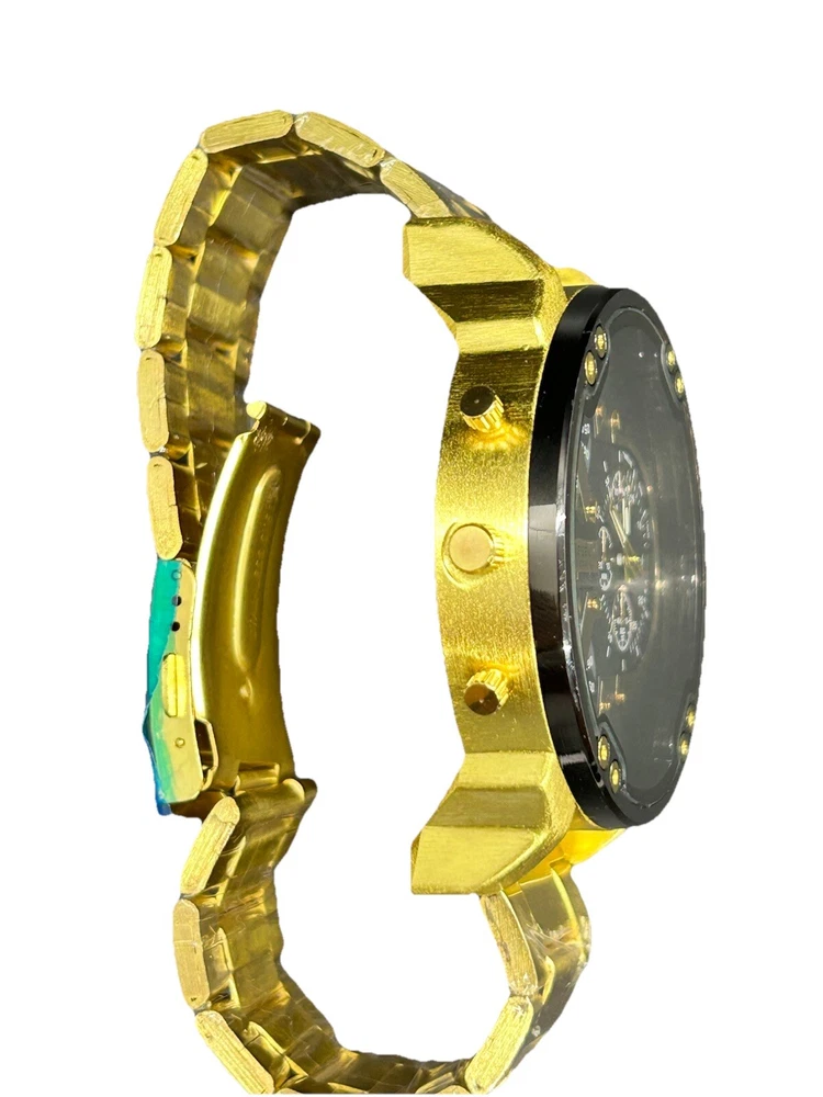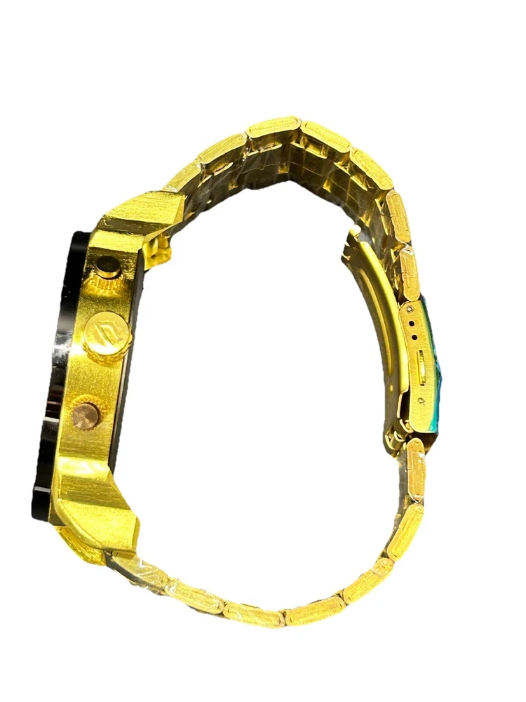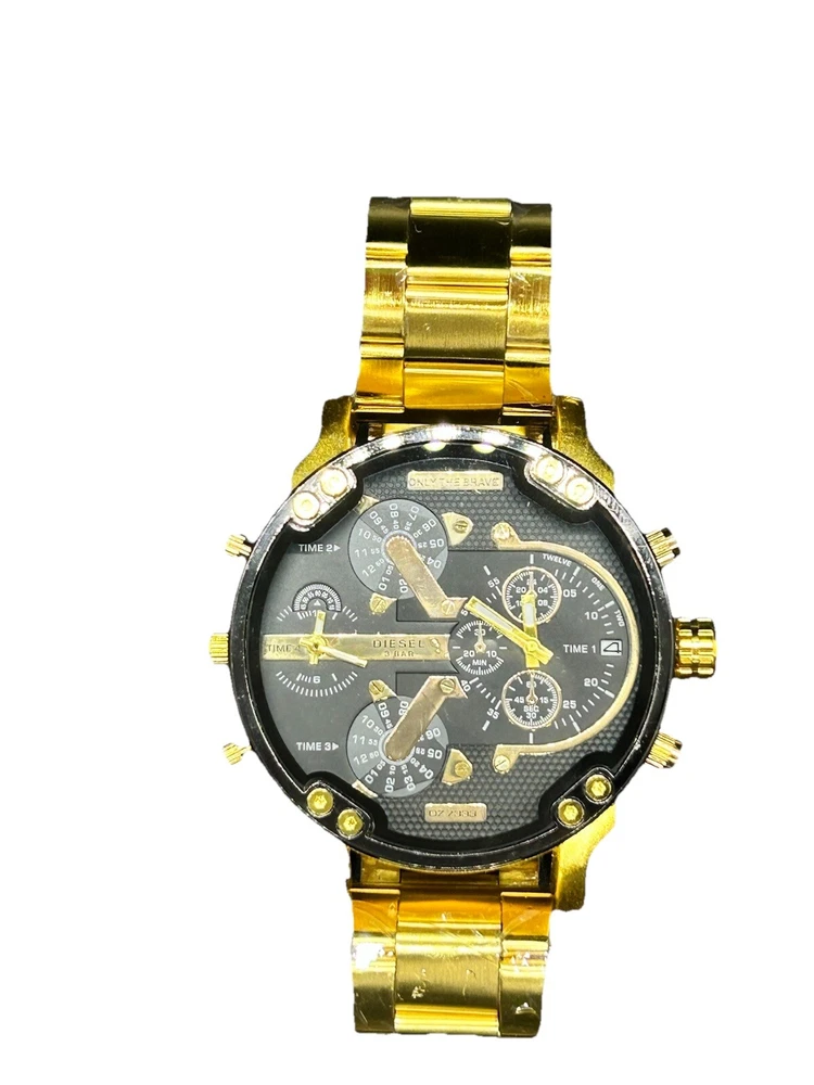 This Diesel Mr. Daddy 2.0 Chronograph wristwatch is a perfect addition to your collection. With a striking gold dial and bracelet, this watch exudes luxury and elegance. The round watch face features stick indexes and a date and day indicator, making it both practical and stylish. Crafted with high-quality stainless steel, this watch is water-resistant and has a quartz movement powered by battery. The case has a gloss finish and measures 57mm in size with a 14mm thickness. The bracelet is also made of stainless steel and has a width of 28mm. This watch is suitable for adult men and is perfect for a variety of occasions, including casual, classic, luxury, dress/formal, and sports.