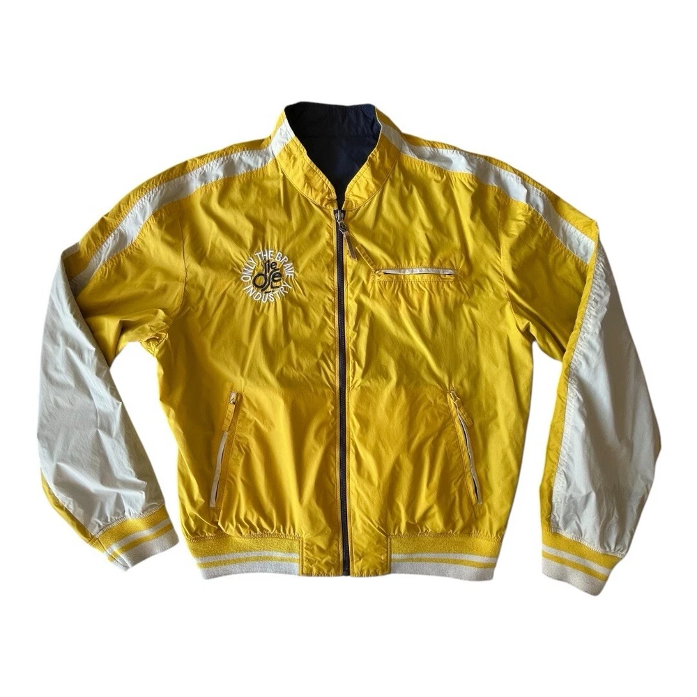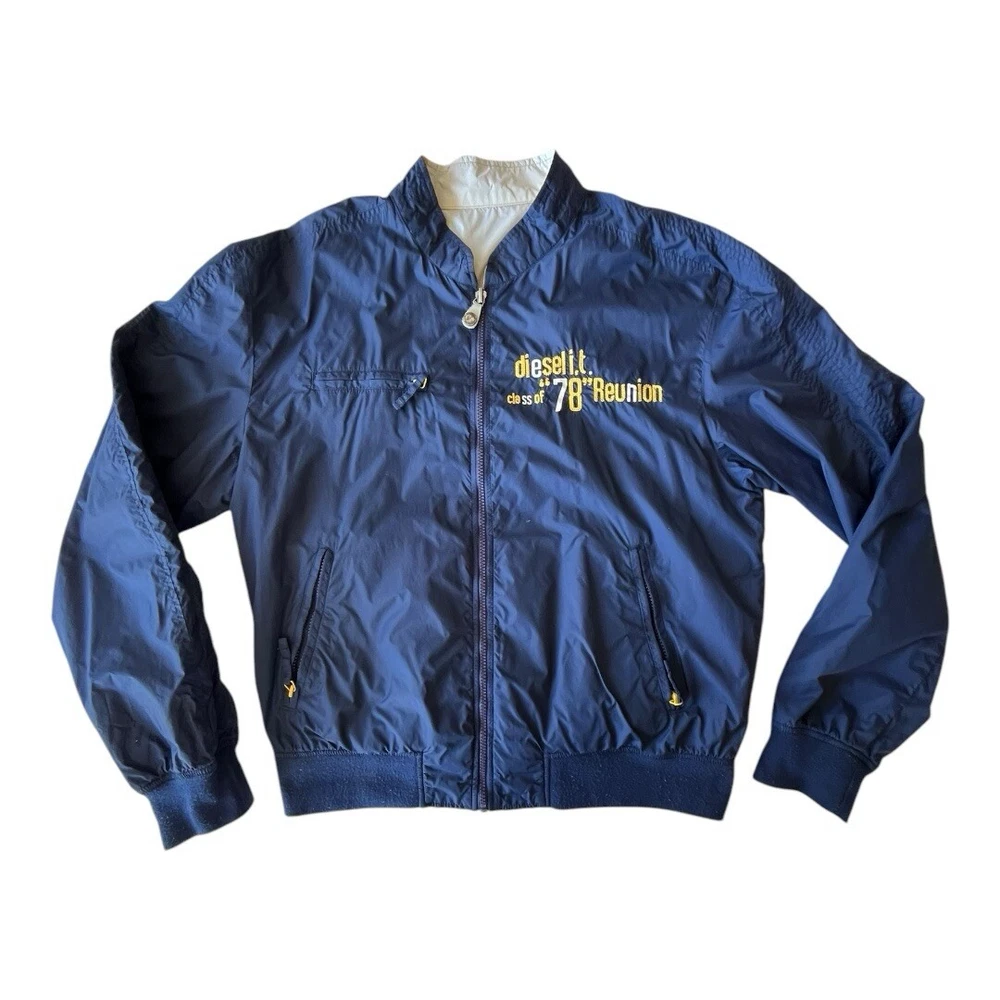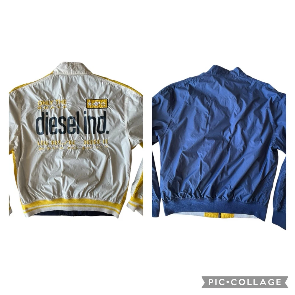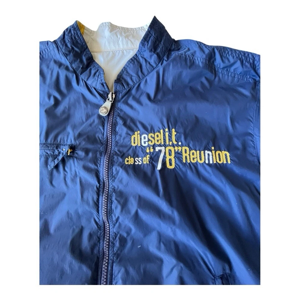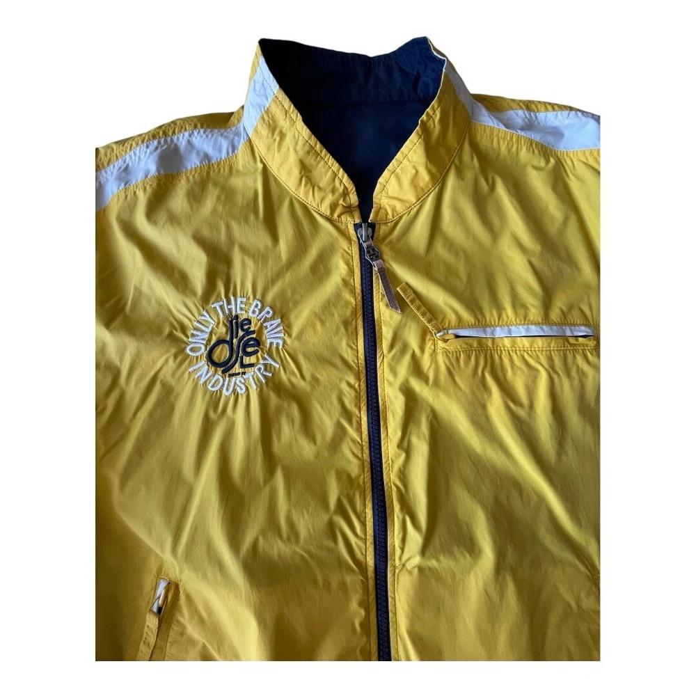 EUC, Y2K Diesel Industries Reversible Moto Style Jacket, size XL. Light signs of wear around the White areas, light piling on the hems. Yellow/White with nice back hit, or Navy Blue, no size, care or made in tags at all.