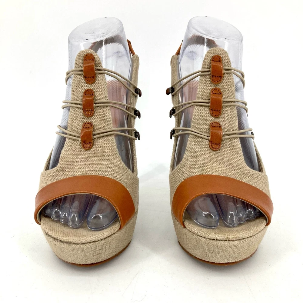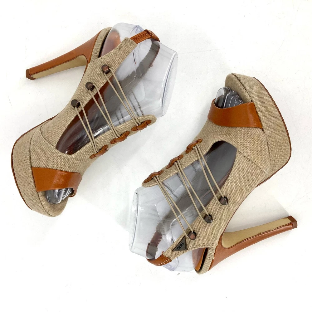 Stunning heels in canvas and leather. Elastic straps hook across the front. Really unusual and elegant. Immaculate condition. These have barely been worn. 5” heels. 1” platform EU37 is US 6.5