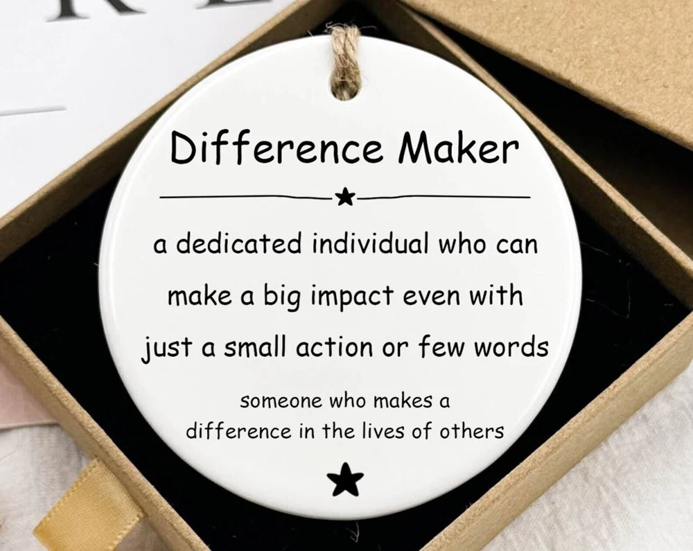 Difference Maker Definition Appreciation Gift Coworker Gift Office Gift Work Gift Personalized Appreciation Gift Ceramic Sign Material: Ceramic Color: White Shapes: Circle, star, heart and oval Can be printed on both sides Imprint full-color artwork, photos, or logos Hole for hanging string and hanging string included Printed in the USA