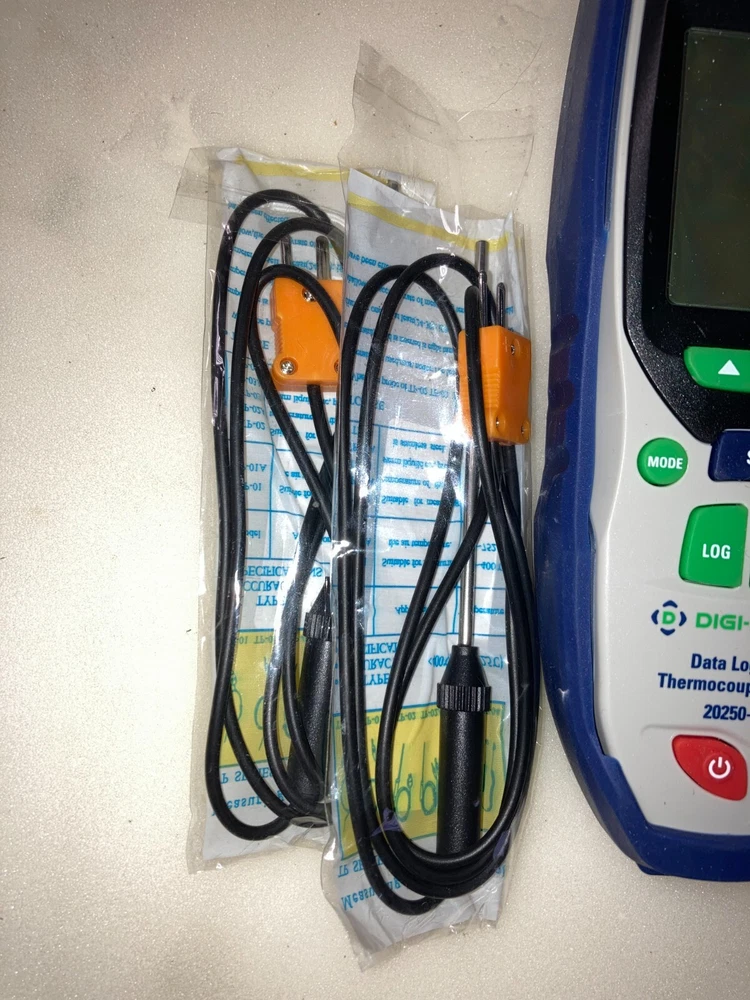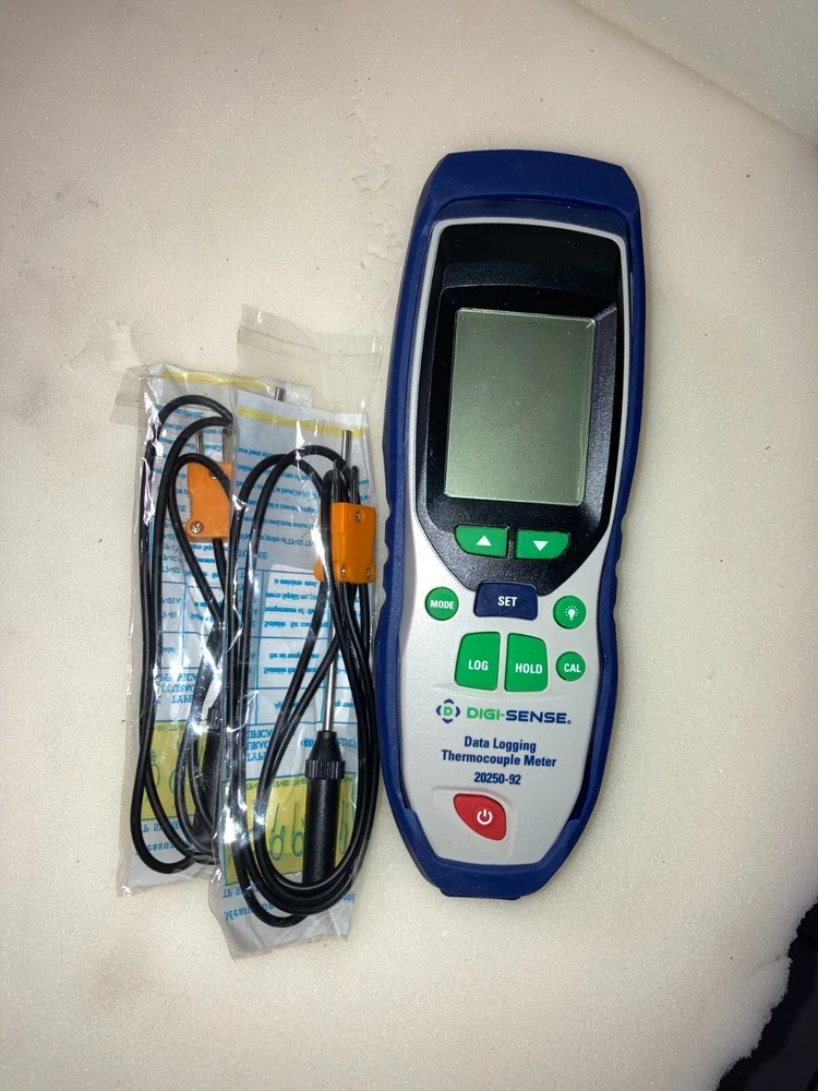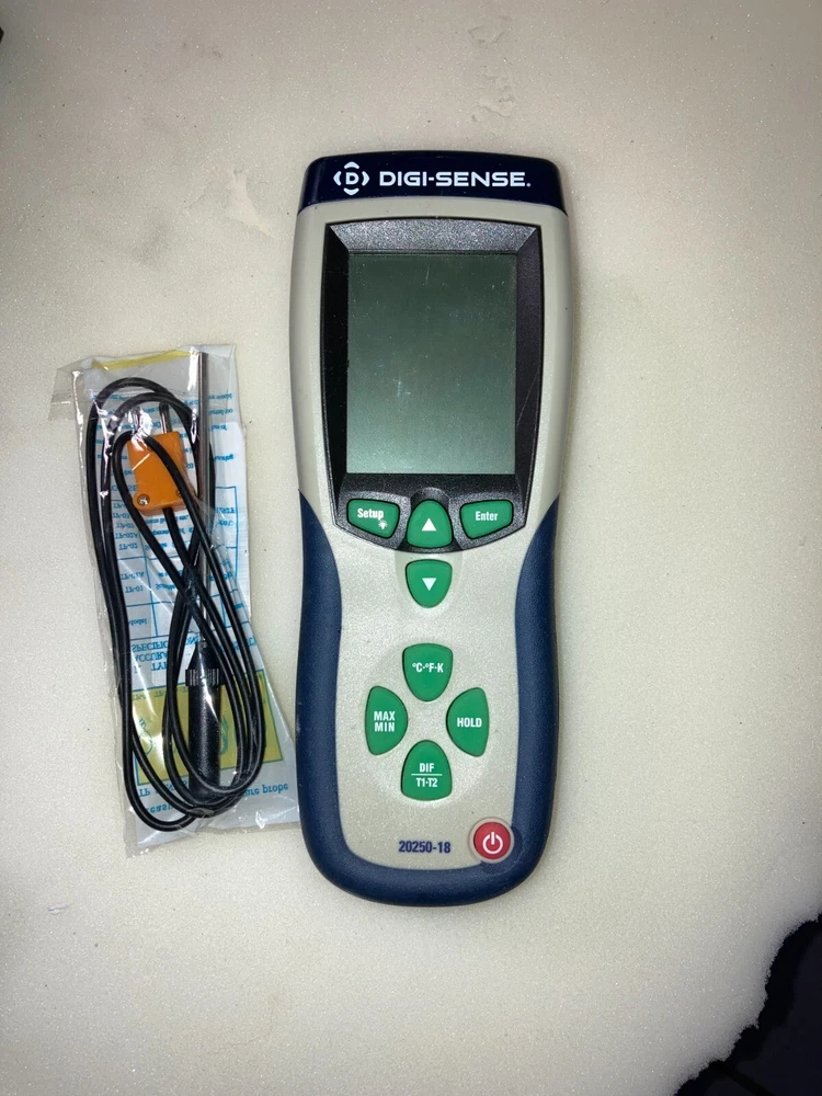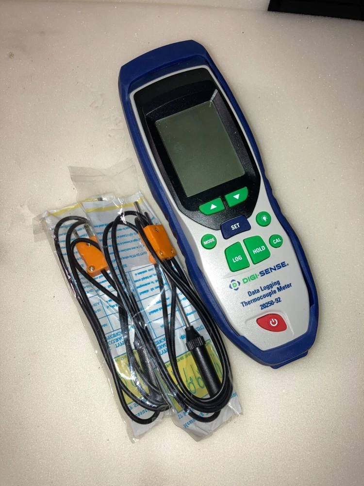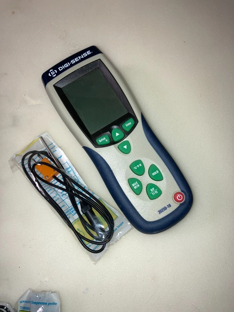 Good, Working Digi-Sense Professional 1-Input Thermocouple Probe Thermometer, Type K. NEW Batteries and 2 NEW Probes are included. Specifications & Description Meter Measurement Type Thermocouple Number Of Probe Channels 2 Types Of Probes Accepted Type K Min Temperature (° F) -328 Max Temperature (° F) 2501 Min Temperature (° C) -200 Max Temperature (° C) 1372 Resolution 0.1°; 1° above 999.9° Low Battery Indicator Yes Display Type Backlit LCD Height (in) 8 No. of Probe(s) Included 1 Battery 9v Battery (1) Description Professional 1-Input Thermocouple Probe Thermometer, Type K, NIST Traceable Cal