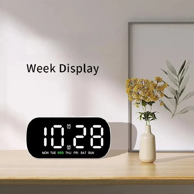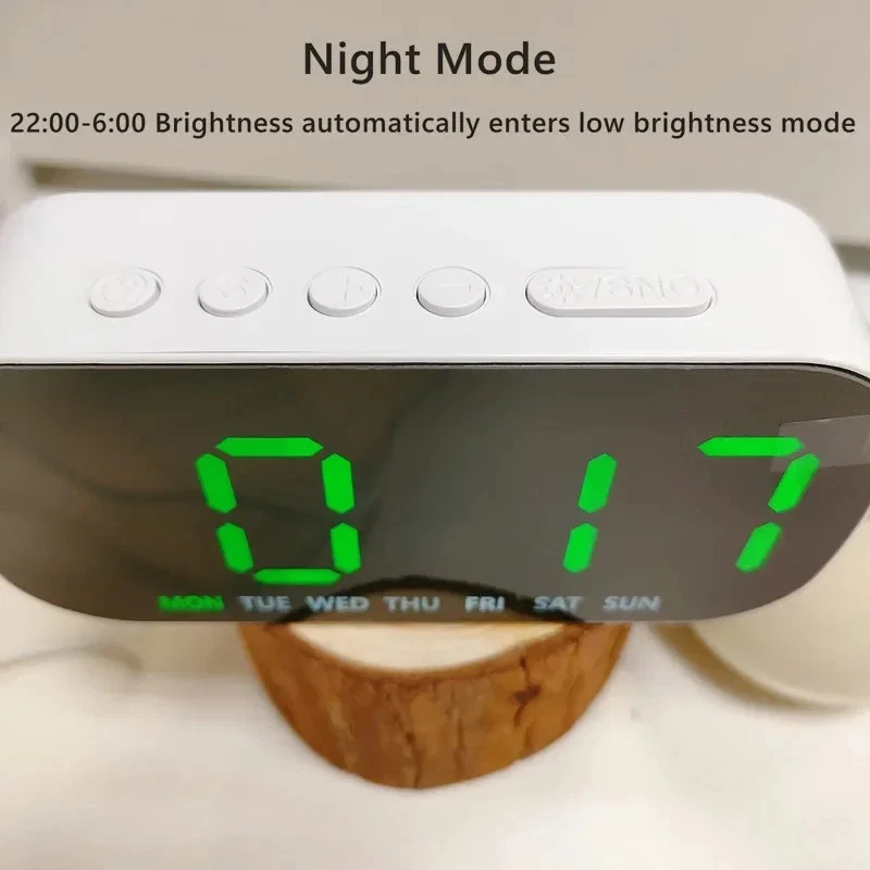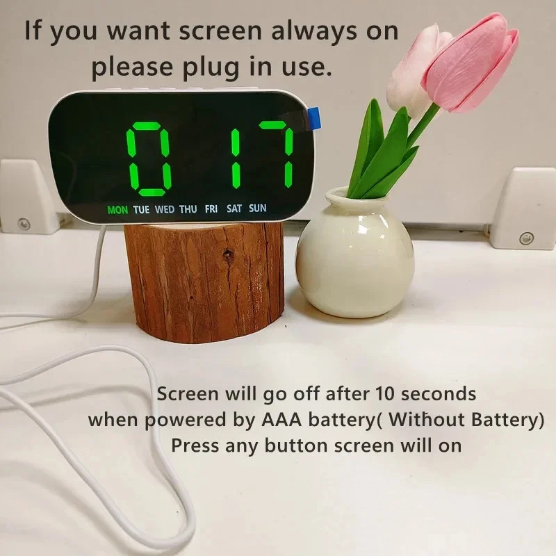 Function 1.Time/Date/Temperature /Week Display 2.Dual Alarm clock function Support to set Alarm frequency :1-5/1-6/1-7 1-5:Alarm rings from Monday to Friday 1-6:Alarm rings from Monday to Saturday 1-7:Alarm rings from Monday to Sunday 3.Brightness adjustment 5 Levels manual brightness adjustment 4.Two Display Modes Press “+” button more than 3s to switch display mode ①Time and week are displayed on the same screen ②Time/date/temperature+week circle display 5.Time memory function Available when powered by battery and plug in use at the same time 6.Night Mode If night mode is on,Brightness darkens at night (22:00-6:00) 7.12/24 hour format switch (1)Time Display (2)Press S button more than 3s 24Hr Display (3)Press UP or DOWN can switch to 12Hr 8.℃/℉ Switching Press “-” button more than 3s to switch ℃/℉ Product Show Material: plastic Power type: external power supply(USB powered) Color: black white light, black green light, black blue light,black pink light,black orange light USB Cable Length:100cm/39.37inch Package size: 14*8.5*4cm/5.5*3.3*1.6inch Product size: 13.5*6.5*3.5cm/5.1*2.6*1.4inch Package: 1xDigital Alarm Clock 1x100cm USB Cable 1xInstruction NOTE 1:Take the protective flim on Clock Screen,it will be brighter. NOTE 2:It will go off after 10 seconds when only powered by 3xAAA Battery(Not Included).Press any key to wake up the alarm clock . If you want screen always on, please plug in use.(USB Included but Plug Not Included)
