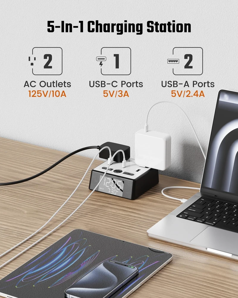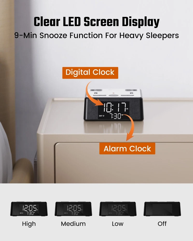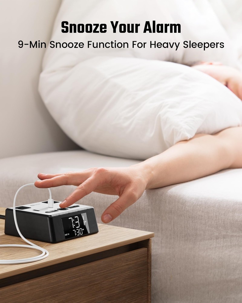 This alarm clock is a game-changer! It keeps my nightstand clutter-free with its built-in outlets and USB ports, plus the adjustable brightness is perfect for any time of day. Love that it charges all my devices safely while I sleep—no more hunting for spare chargers. The sleek design fits anywhere, and the clear display is easy to read. Highly recommend for anyone needing an all-in-one charging station and alarm!