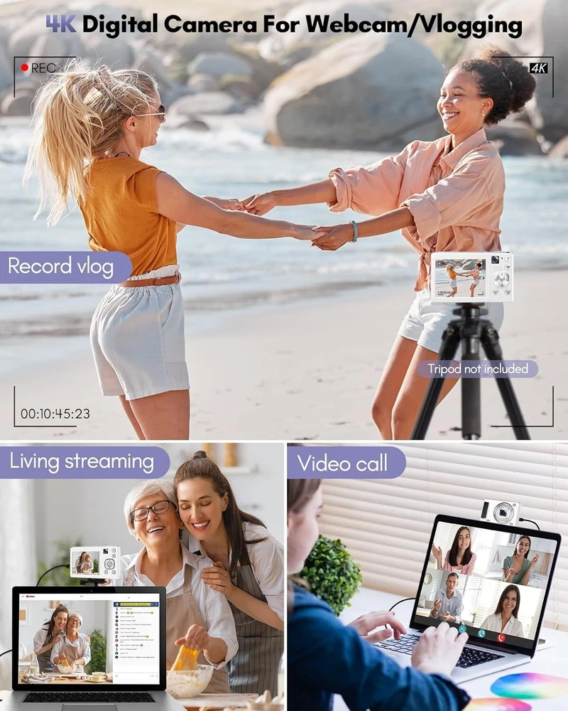 -Brand New - Never Used - Questions: Feel free to ask any Questions - BOX: Never Opened - DESCRIPTION: 【48MP Dual-Lens Digital Camera, Easily Record Your Travels!】This digital camera uses the latest CMOS image sensor system, allowing you to easily capture stunning 48MP HD images. Equipped with dual lenses, it enables one-touch switching between selfies and landscape photos without the need for assistance. Even beginners can take amazing photos of people, scenery, selfies, and more during their travels! 【Autofocus 4K Digital Camera for Photography】This compact digital camera features an innovative autofocus system. In photo mode, lightly tap the capture button to keep the camera steady to activate autofocus. When you see the focus frame on the screen change from yellow to green, the focus is complete. Fully press the capture button to take the clearest and most vivid photos. The W/T button allows you to adjust the 16x digital zoom, making it easy to capture distant scenery. 【4K Video Blog Camera with Pause Function】This video blog camera supports 4K video mode, and the dual cameras can switch the content and composition perspective as you wish. Press the "OK" button to pause while recording or playing back video, making use of the pause function. The camera also supports mounting on a tripod for use as a webcam. Equipped with two rechargeable batteries and the ability to record while charging, you never have to worry about running out of power during shooting. 【Portable and Versatile Features】This portable small digital camera is equipped with a 2.8-inch IPS screen and is extremely lightweight, making it perfect for your pocket when you want to travel light without carrying a ton of lenses. This digital camera also offers a variety of image styles, self-timer(2/5/10S), 3-continuous shooting, face recognition, anti-shake can make the picture stable and clear, and fill light allows you to take high-quality photos in low-light conditions. 【Complete Camera Set: Ideal Choice】This point and shoot digital camera comes with a high-quality 32GB card, wrist strap, and lanyard to free your hands and prevent the camera from falling when not in use - OFFERS: Reasonable offers are considered, LOWBALLERS, Best price and Lowest askers will be ignored - all sales final/no refunds/ no exchanges/ no returns - Disclaimer: I do not own the brand's trademarks, logos, pictures, or products posted. I do not intend to infringe on copyright. I find such content available on the internet. Contents are considered fair use. - Digital Camera, 48MP Autofocus Cameras for Photography,Vlogging Compact Camera with Front and Rear Camera, 16X Zoom Protable Point and Shoot Cameras with 32GB SD Card,Anti-Shake,2 Batteries(White)