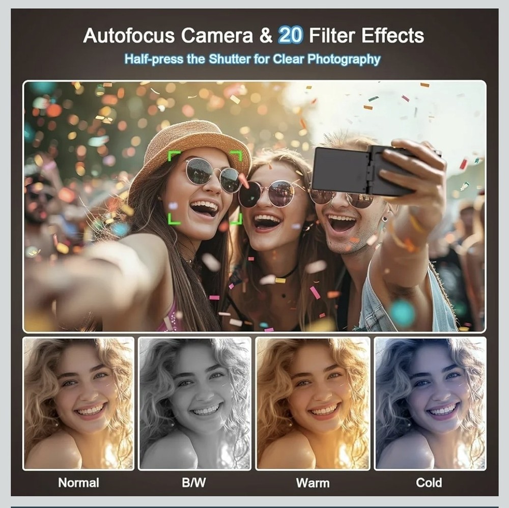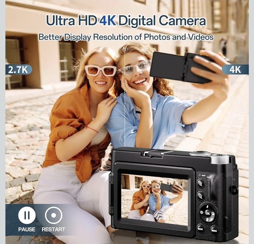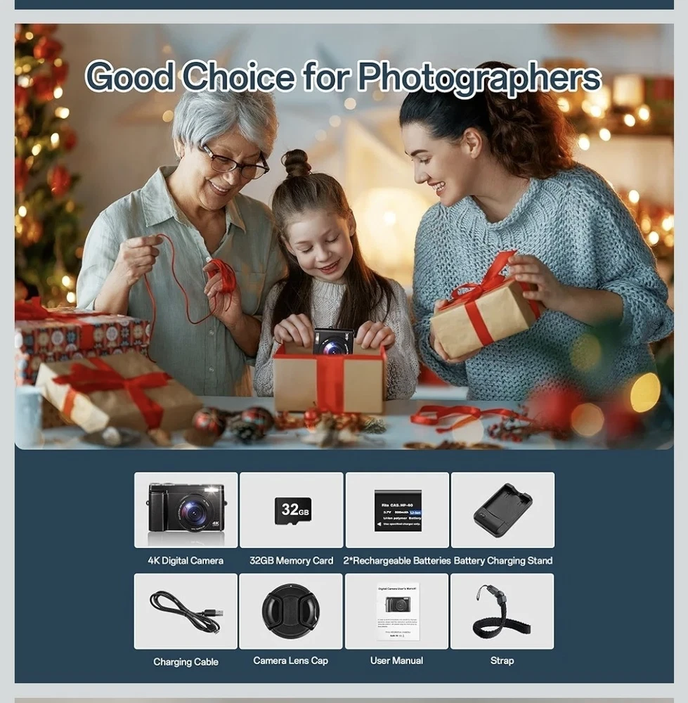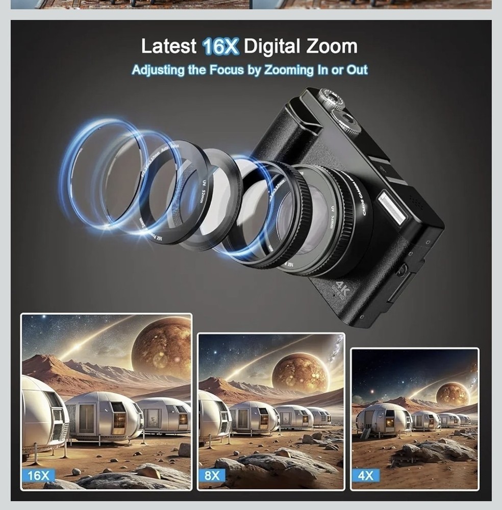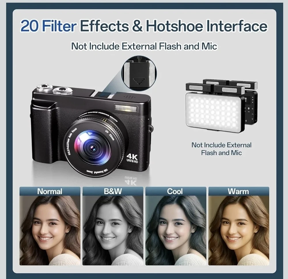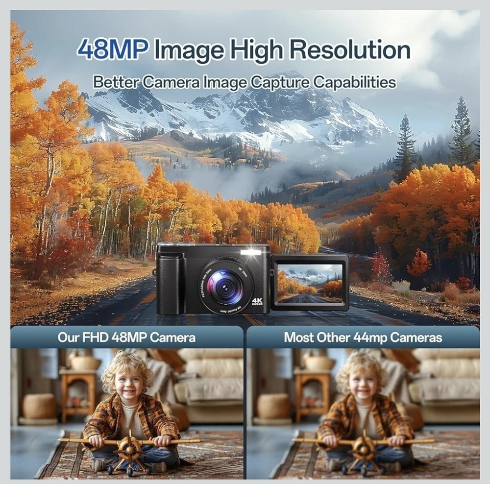 Digital Camera 4K, 48MP 16X Autofocus Digital Zoom Photo Camera, 3 Inch 180° Flip LCD Screen Compact Vlogging Photography Camera with Charging Station, 2 Batteries, 32GB Card for Children, Beginners Compatible mountingsPentax K Aspect ratio1.27:1 Photo sensor technologyCMOS Supported file formatJPEG Image stabilisationDigital BrandVAHOIALD 4K Ultra HD & 16X Digital Zoom: This camera delivers professional sharpness and precision, allowing you to capture every breathtaking moment in 4K Ultra HD digital camera resolution and create videos with vibrant colors, high contrast, and realistic details. Combined with advanced image stabilization technology and 16x digital zoom, you can take photos of better quality without compromising image quality 48MP & Professional-Level Shooting Modes: Equipped with a 48MP CMOS sensor, this camera captures sharp, vibrant photos with accurate color reproduction. The digital sensor and lens system ensure sharpness. Portrait mode, sports mode, night scene, time-lapse, and slow motion. These shooting modes can be adjusted for any scenario 3-Inch Rotating Display & Practical Charging Station: This camera features a 3-inch LCD rotating display that can turn 180°, enabling perfect selfies, vlogs, or recordings. With the intuitive user interface, you can adjust focus, snap photos with a tap, and instantly preview editing effects. The set includes a universal charging station CS-40 and two replaceable batteries, ensuring continuous power for long recordings. Additionally, it comes with a 32 GB microSD card, providing ample storage for your photos and videos Vlogging Camera & Webcam: A vlogging camera can easily capture daily life, friends' gatherings, and travel scenes. When connected to your computer via USB and switched to "webcam" mode, it can transform into a computer camera for live streaming and video sharing on social media platforms like Facebook, YouTube, etc. With the USB output, you can directly connect it to a TV or monitor for instant playback or editing. Easy to share with family Multi-Functional Camera & High-Quality Packaging: This camera is lightweight and portable, perfect for daily use, social media, travel, and photography, making it an ideal choice for amateurs and beginners to capture photos and videos. External-Memory Size 32 GB Model Number DC101 Model Series 4K