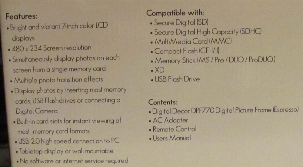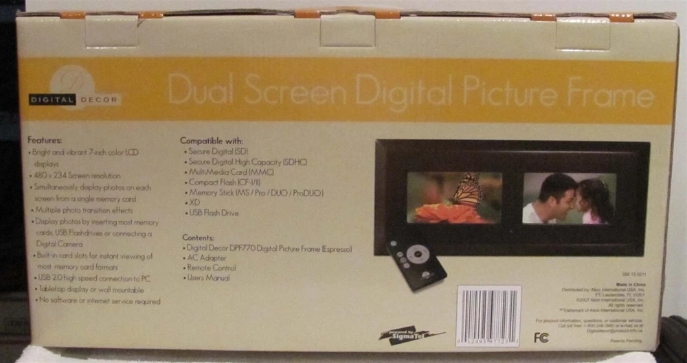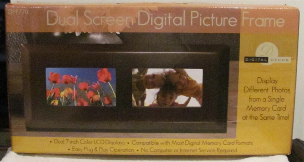 I couldn't find out exactly WHEN they stopped making these but I'm absolutely positive they haven't made them for at LEAST 15 years. Just finding one of these is not all that easy but to find one still new in the box, well now THAT'S a find! New in the box from 2007! This item has never been used. Box has been opened just to check contents. Everything is in perfect shape. Digital Decor Dual Screen Digital Picture Frame DPF770 Detailed item info: Product Identifiers: Brand Digital Décor Model DPF770 MPN DPF770 UPC 012495977231 Key Features: Type Digital Picture Frame Display Type LCD Frame Size 7" Compatible Memory Cards CompactFlash (CF) Card, Memory Stick, Memory Stick Duo, Memory Stick Duo Pro, Memory Stick Pro, Multimedia Card, SDHC Card, Secure Digital, xD Picture Card Formats: JPEG, MP3 Technical Features: Resolution 480 x 234 Pixels Additional Features: Features Built-in Clock, Built-in MP3 Player, Built-in Video Player, Calendar, Photo slideshow, Remote Control, Transition Effects, USB Port, Wall Mountable Digital Decor DPF770 Dual Screen 7-inch Color LCD Picture Frame With Remote Control. Bright & vibrant color displays Display Type: LCD Frame Screen Size: 7" Simultaneously display photos on each screen from a single memory card. Multiple photo transition effects. Display photos by inserting most memory cards, USB Flashdrives or connecting a digital camera. Built-in card slots for instant viewing of most memory card formats. USB 20 high speed connection to PC. Tabletop display or wall mountable. No software or Internet service required. Compatible Memory Cards: CompactFlash (CF-I/II) Memory Stick, Memory Stick Duo, Memory Stick Duo Pro, Memory Stick Pro (MS/ Pro/ DUO /ProDUO) Multimedia Card (MMC) Secure Digital High Capacity (SDHC) USB Flash Drive Secure Digital (SD) XD Picture Card Formats: JPEG Screen Resolution: 480 x 234 Pixels Color: Dark Brown Inputs: USB A and USB mini Features Playback Function, Continuous Slide Show; Digital Mode Contents of box: Picture Frame, Power Supply/AC Adapter, Remote Control Users Manual. Box weighs just under 5 pounds BEFORE packing. Rest assured I will pack the item securely and mail it the day after payment is received or the same day if I can manage it. Buy it now at just $49.99 and buyer pays $18.75 for Shipping with delivery confirmation AND tracking #. Payment is by PayPal. Any other questions, please email me Powered by SixBit's eCommerce Solution
