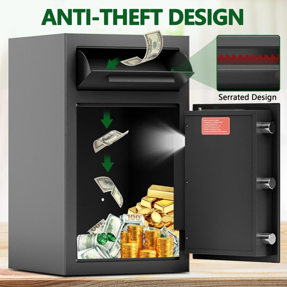 This is for informational purposes only. For medical advice or diagnosis, consult a professional. Key Features: Electronic Lock System: Safeguards against unauthorized access with a reliable electronic lock system, featuring two sets of programmable codes and two override keys for emergency use. 1 Secure Deposit Slot: Accepts cash and documents with ease thanks to the convenient deposit slot design. 2 The front deposit drawer's saw-tooth edge baffle prevents unauthorized removal of contents. 3 Durable Steel Construction: Built with solid steel and coated for enhanced durability. The safe features 3 live steel locking bolts, concealed hinges, and a recessed door, offering resistance against drilling, prying, collisions, and falls. Wall or Floor Mounting: Equipped with pre-drilled holes for secure mounting on walls or floors, deterring potential theft. The included soft cushion protects valuables from scratches or damage during installation. Specifications: Main Color: Black Main Material: Steel Assembled Length: 13.97 inches Assembled Width: 13.97 inches Assembled Height: 24.00 inches Weight: 46.83 pounds
