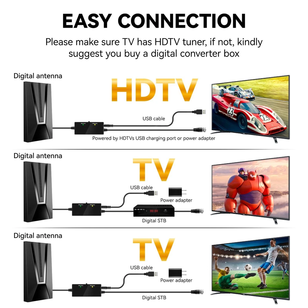 Never Pay Monthly Bill - Say goodbye to expensive traditional cable bills with our new upgraded high technology TV antenna. It's compatible with TV converter boxes and hundreds of digital Televisions/4K Ultra high definition (4K UHD), offering access to a plethora of HD channels including CW, Fox, AMC, ABC, Hulu, Netflix, ESPN, CBS, NBC, PBC and more. You can watch news/movies and any your favorite programs, enjoy free for life HD local channels, can save up to $3,000 a year! Up To 980 Miles Range Reception - Veaxetu TV antenna support super distance 980 miles reception and 360° reception around your HDTV. You can receive stable signals even in bad weather! Advanced signal booster optimize the signal transmission protection against interference with other signals, which can make sure you can get more channels even you are far away broadcast towers. Please switch the amplifier to "short range" if your house is very close to the broadcast tower (within 35 Miles). Full HD Crystal TV & Upgraded Smart IC Chip - Adopted powerful amplifier signal controller, built-in newest generation smart IC chip and crystal clear filter technology to pick up signals. The new technology filters out cellular and FM signals resulting in clearer pictures, low noise and access to more free broadcast TV signals with enhanced gain, range and frequency performance. No monthly contract and potentially save thousands of dollars a year! 35FT Coaxial cable & Easy to Install - Extra long high performance coaxial cable ensures Antenna can be placed anywhere in your home for the best signal and the strongest reception. Connect the antenna to 'Ant In' On the back of any HDTV Place the antenna in the desired location and scan for channels on your television menu. NOTE: Please re-scan for channels after each moving the tv antenna. Please visit "dtv gov maps'' information for the available channels in your location. 100% Satisfaction Guaranteed - We rigorously test our products to ensure top performance and provide lifetime professional technical team support! We are trying our best to make every customer satisfied, we will provide intimate service, if you aren't satisfied for any reason or have any questions about the product, please contact us when you receiving your antenna, we will give the best solution.