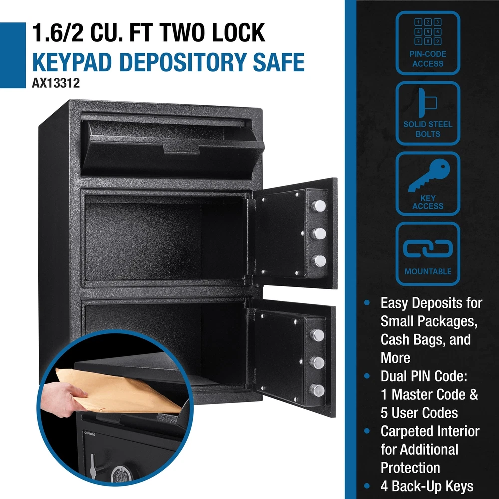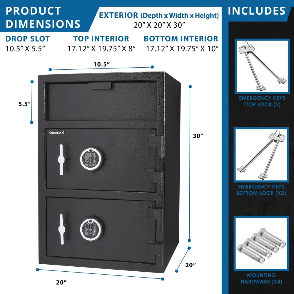 Specifications Place of Origin #originPlace# Main Color Black Main Material Steel Dangerous Goods #dangerFlag# Dimensions & Weights Assembled Length (in.) 20.00 Assembled Width (in.) 20.00 Assembled Height (in.) 30.00 Weight (lbs) 187.00 Product Features Advanced Security: The keypad can retain 1 master PIN code and up to 5 user PIN codes, and has the optional dual user mode. Lock Out Mode: The safe will enter lock-out mode if the incorrect PIN is entered too many times in a row. Solid Design: Both doors comes with 3 built-in deadbolts, and the safe can be mounted with included hardware. Double Compartment: The safe has a separate secured compartment on the bottom for long term storage. Included Components: Safe, 2 Back Up Keys, Mounting Hardware, Battery Description