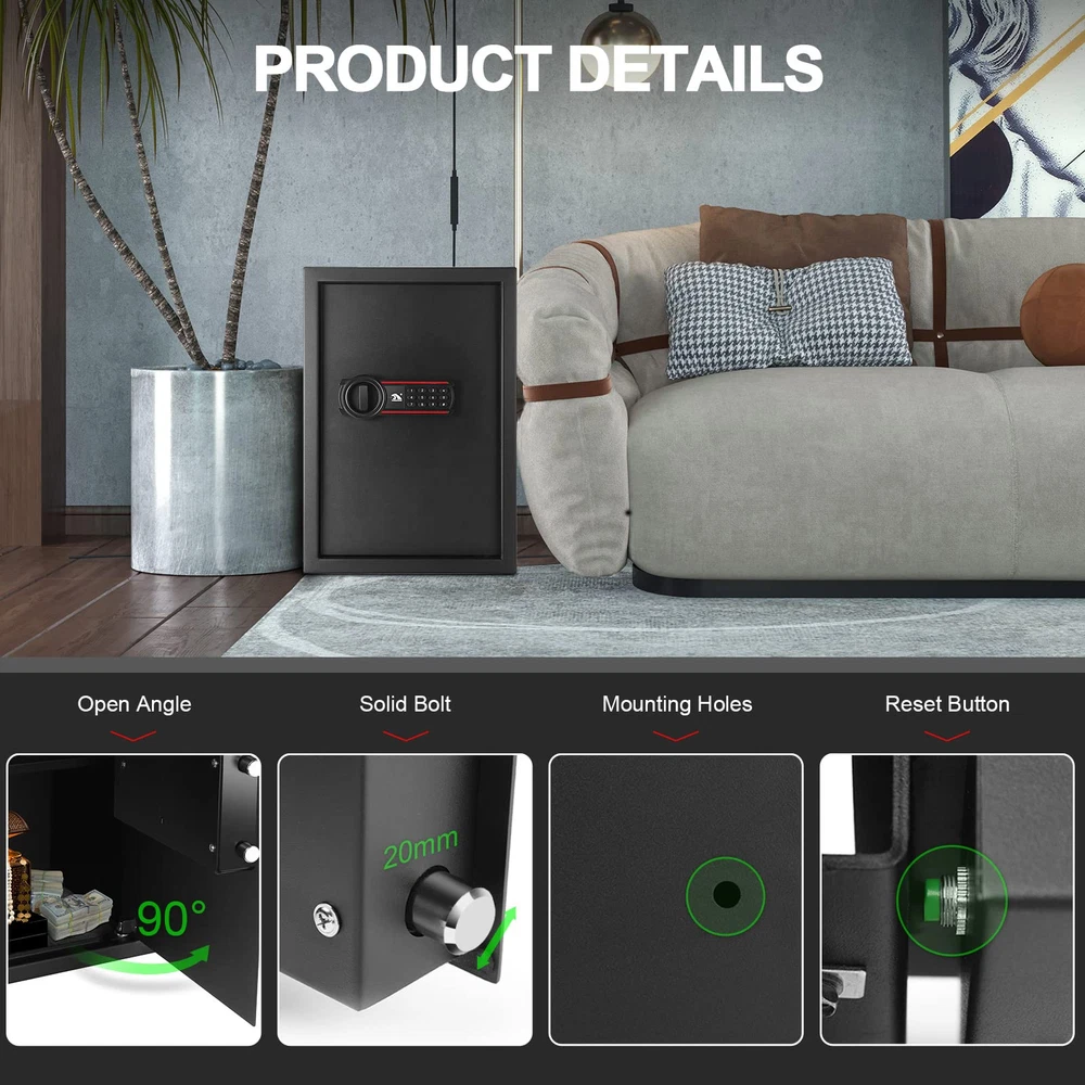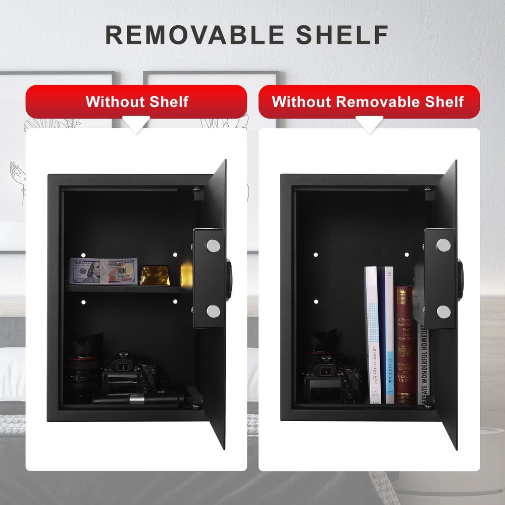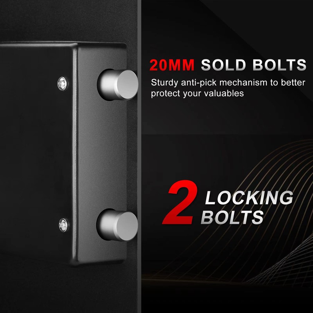 【STRONG & SAFE】: home safe is made of reinforced solid steel wall structure. Dual cylinder latches increase safety and reliability. Provide physical protection against forced entry. 【TWO UNLOCKING METHODS】: This safe is designed with a digital combination lock, which can be unlocked directly through the password and the knob. Equipped with two emergency keys in case the password is forgotten or the battery dies. In an emergency, the lock can be unlocked with a key and knob, which is easy to operate. 【LARGE CAPACITY】: This numeric keypad safe has an outer dimension of 19.68x 13.77x 11.81 inch and an inner dimension: 19.57"×13.66"×10.63"(H*W*D). It provides enough capacity for your valuables, You can safely store your cash, jewelry, pistols and more. 【REMOVABLE SHELVES】: Safes with removable shelves provide flexible storage solutions, get more space to store your valuables. 【EASY TO INSTALL】: There are 4 pre-drilled holes on the back and bottom, which can be easily fixed on the wall or floor. Well-designed cabinets and classic colors will perfectly match the decor of your home, hotel or office. 【ABOUT US】 : has been producing all kinds of safes since 2000. We have a professional after-sales team. We offer a 1-year warranty for our clients. If you have any problems or concerns about the digital keypad safe, please contact us directly, we will provide you with a satisfactory solution as soon as possible.