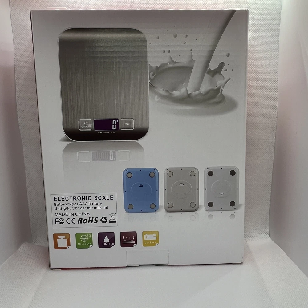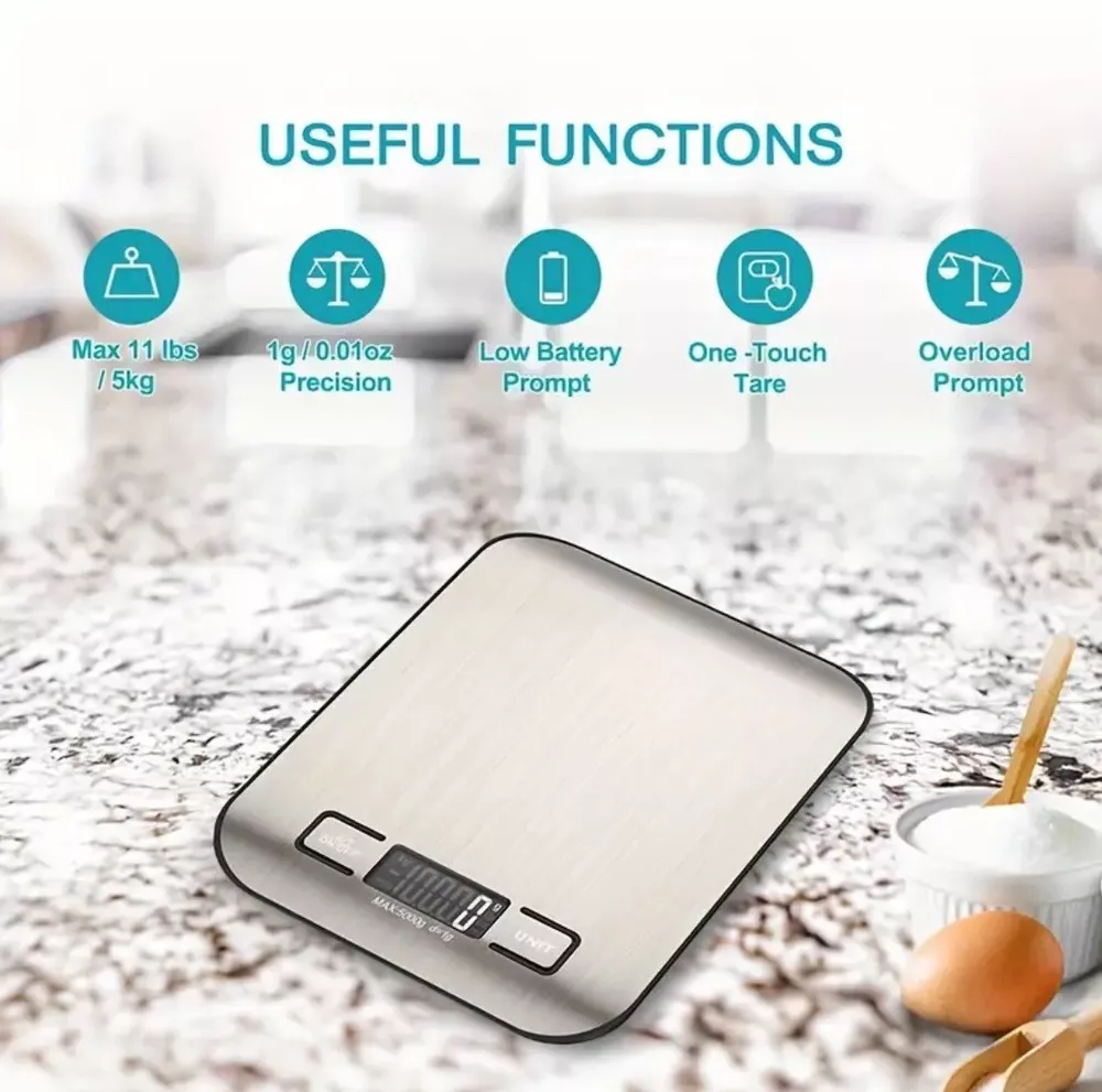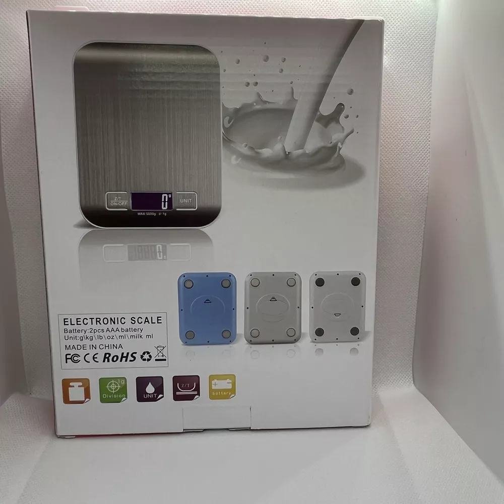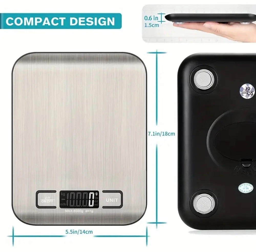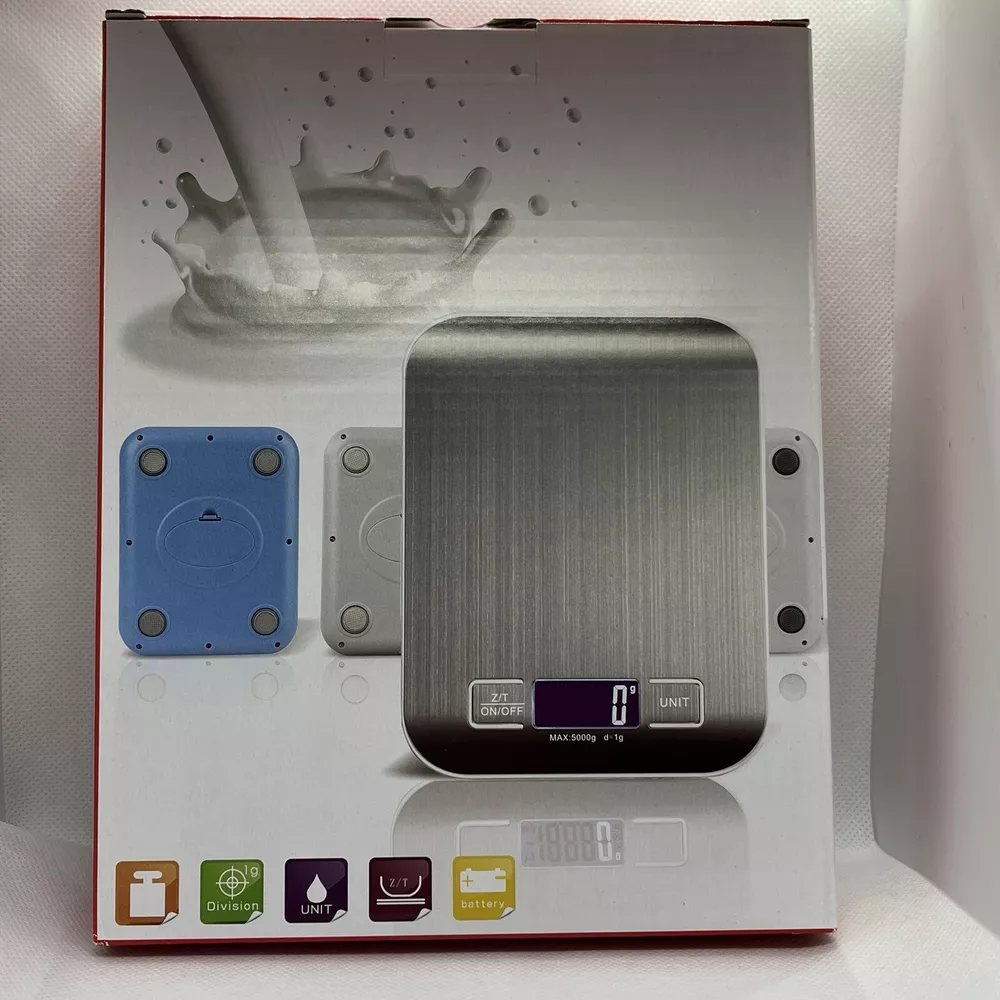 This digital kitchen scale is made of high-quality stainless steel and can weigh food or packages up to 11 pounds. It comes with 2 AAA batteries included and has a modern rectangular shape. The LCD display type makes it easy to read the weight in grams and ounces. This scale is perfect for measuring a variety of items such as pets, envelopes, jewellery, vegetables, medicines, packages, and fruits. It has a weight limit of 11 pounds and is light weight, making it easy to use and transport. The scale is also easy to clean and has a value of $0.01 per ounce. Get accurate measurements for your kitchen needs with this reliable and efficient digital scale. Features: Effortless Weighing: Supports 5 units (oz/lb:0z/fl'oz/g/mL), tare function for hassle-free operation Precise Results: Accurately weighs up to 5 kg/11 Ib with 1 g increments Simple & Compact: The small and sleek scale is a perfect fit for most kitchens, occupying little space and easily storable in cabinets Easy to Clean: Just wipe down the 304 food-grade stainless steel surfaces to keep clean LCD Display: Backlit LCD screen with large fonts for easy reading Item will ship either the same or next business day via USPS Ground Advantage. Please reach out if you have any further questions. Take care.