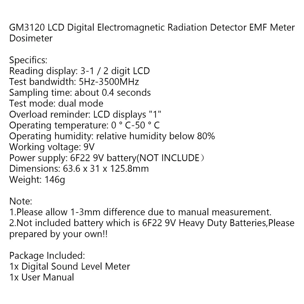 Product Description Digital LCD Electromagnetic Field Radiation Detector EMF Meter Dosimeter TesterU GM3120 LCD Digital Electromagnetic Radiation Detector EMF Meter Dosimeter Feature: 1: The two data are clear at a glance, helping you get rid of the tedious and troublesome need to replace the machine during the measurement, easily get it by one machine. 2: One key to lock the radiation value, convenient for you to record related data. 3: Intimately remind whether the current radiation is safe. 4: Adopt LCD display screen with backlight, which has both general environment and low light environment measurement capabilities. 5: Stylish appearance, easy one-handed operation, easy to move or measure on site. Specifics: Reading display: 3-1 / 2 digit LCD Test bandwidth: 5Hz-3500MHz Sampling time: about 0.4 seconds Test mode: dual mode Overload reminder: LCD displays "1" Operating temperature: 0 ° C-50 ° C Operating humidity: relative humidity below 80% Working voltage: 9V Power supply: 6F22 9V battery(NOT INCLUDE) Dimensions: 63.6 x 31 x 125.8mm Weight: 146g Note: 1.Please allow 1-3mm difference due to manual measurement. 2.Not included battery which is 6F22 9V Heavy Duty Batteries,Please prepared by your own!! Package Included: 1x Digital Sound Level Meter 1x User Manual About Us Bruce & Shark is a company Focus on Motorcycle parts more than 11 years. The design inspiration comes from the awe of the vast sea and worship of the fighting sharks, therefore Bruce & Shark takes a shark as brand logo. Since its inception, we have always put the "customer first" and "top quality" as our principle. We specialized in selling Motorcycle parts and providing customers with various types of high-quality products. Our brand Bruce & Shark has enjoyed good reputation in America, Europe, Japan, Canada and Africa, covering more than 30 countries. Our vision is to deliver high-quality Motorcycle parts products and sincere services to the world. Our main products are motorcycle mounted, fuel pump, stator, windshield, Seat Cover, motorcycle fairing. Welcome to our shop to choose products that are worth more for your Motorcycle! Please Add me to your list of favorite sellers and visit often. Thank you for your business. Shipping United States Buyers Parcel will send via USPS or UPS or FedEx from our United States Warehouse. Shipping Time Usually parcel will be delivered 2-7 working days include handling time. Sometimes shipping time may has a little delay, such as Bad weather, Holidays. Terms We stand behind everything that we sell and will do everything possible to assure you are satisfied. When you receive your purchase if you are not 100% satisfied, please sent me ebay message and we will do our best to make you happy. If you still want to return your purchase, simply ship the item(s) back to us and we will refund your original purchase price and the original shipping charge. Buyers are responsible for the postal cost of returning the items. We must be notified of the intent to return your item within 30 days of receiving the item. Items returned must be in the same condition that they were received. How to return 1,Please ask us for return address . 2,Shipping back the package . The RMA#(Return Merchant Authorization Number = Your ebay ID) must be clearly written on the return package ,Otherwise the package will be refused. 3,Sent us the return tracking number. 4,All returns will be inspected prior to a credit being issued. Contact Us Send us ebay message in English If you have any questions, our Customer Service staffs welcome you to sent me ebay message. We strive to answer all questions and resolve any problems as quickly as possible. Business Hours: HongKong Time GMT+8:00 Monday-Saturday 9:00-17:00 SATA Docking Station Duplicator SSD M.2 SATA+SATA Solid State Drive Enclosure U1 46.65 USD Free shipping Fuel Bleeder Valve 6598102 Compatible With Bobcat 753 773 S175 S185 T180 T190 16.77 USD 17.65 USD Free shipping 5% off Handheld Speaker Mic For Vertex VX-210 VX-228 VX-231 VX-351 VX-354 VX-418 US 17.65 USD Free shipping WH01X29528 AP6985313 Washer Door Lock for GE Washing Machine U4 30.69 USD 32.65 USD Free shipping 6% off 30A PWM Solar Controller Display Current Solar Street Light Controller 0V Start- 20.35 USD 21.65 USD Free shipping 6% off 4 PCS 10W Uhf 400-470MHz Car Radio Short Rubber Antenna PL259 Male Connector U4 20.65 USD Free shipping Copyright © Bruce&Shark All rights reserved