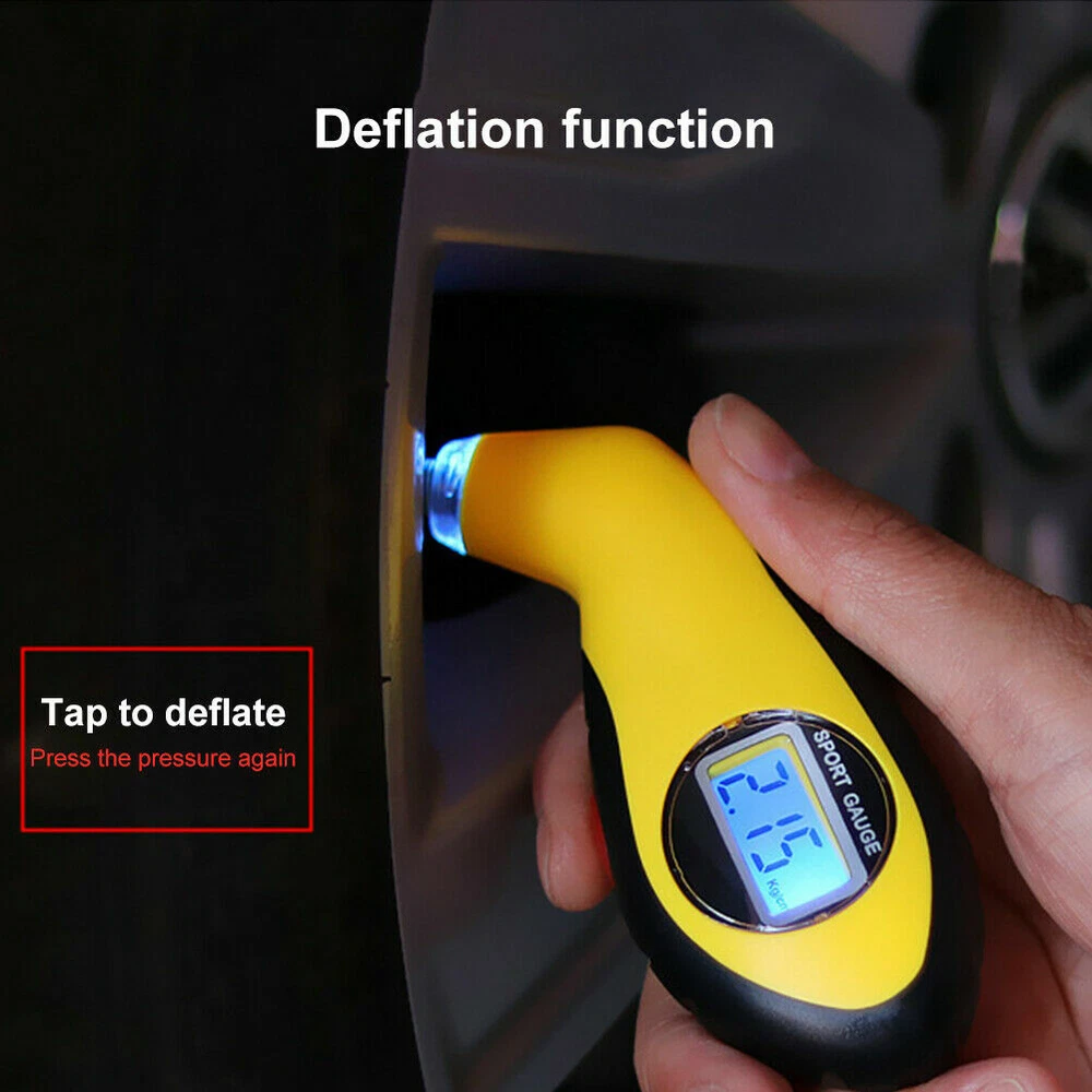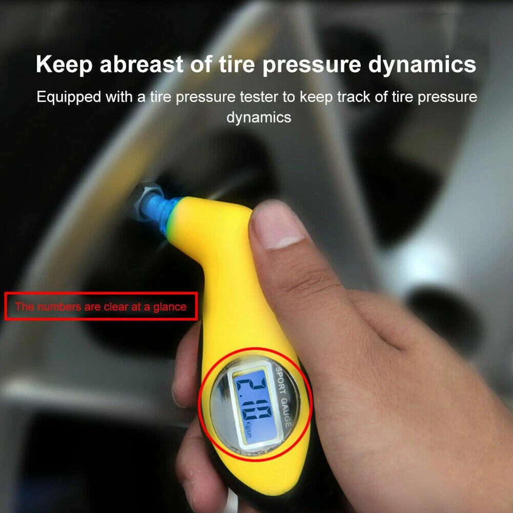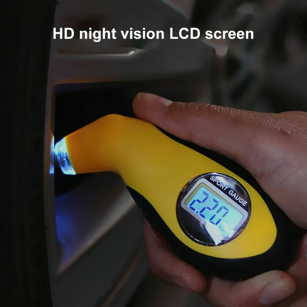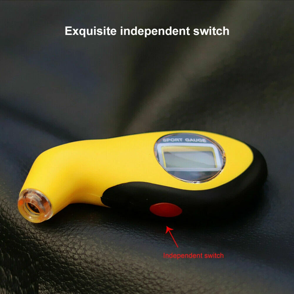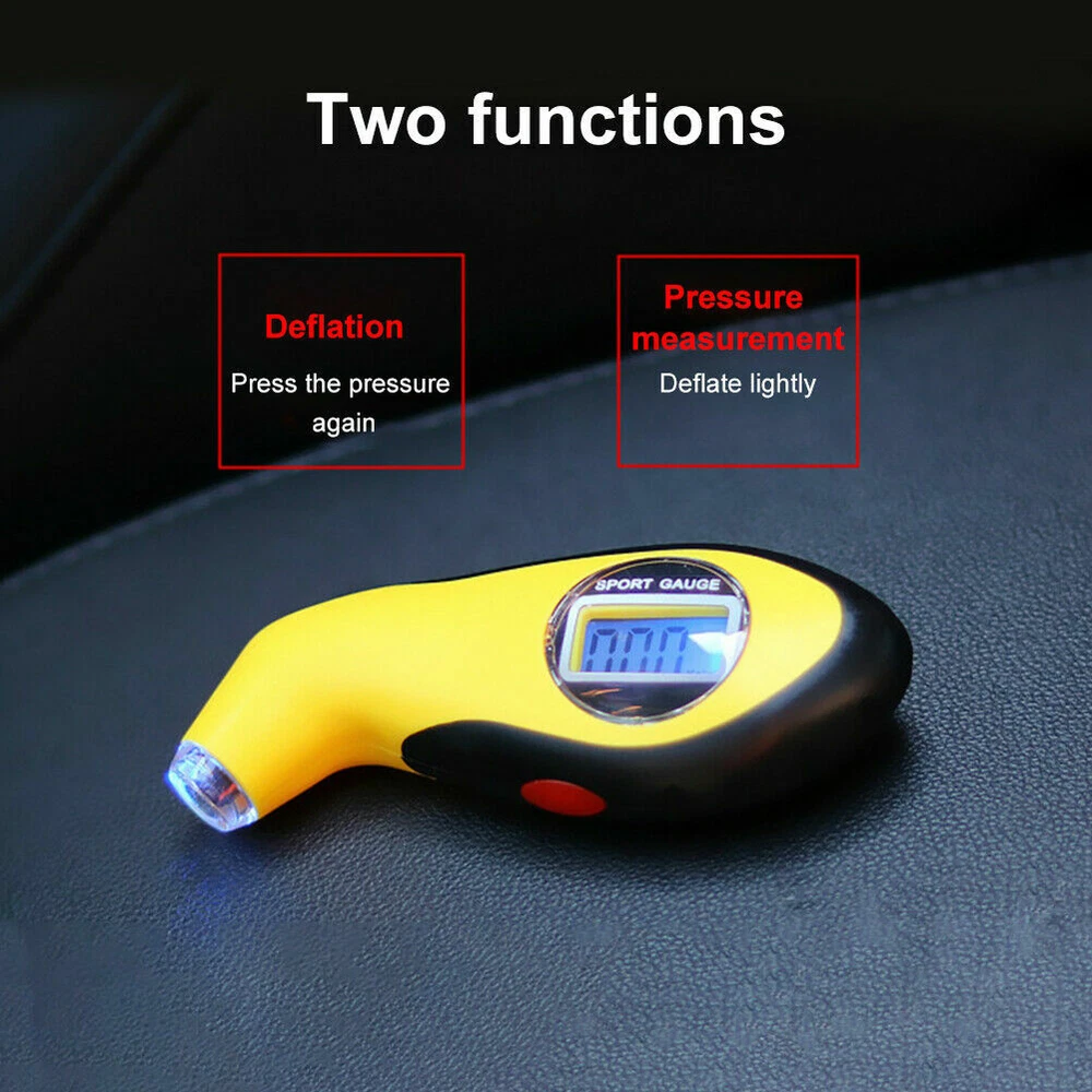 Features: 1.Lighted nozzle and display screen for ultimate visibility in low light or at night. 2.Digital display instantly and clearly shows exact reading, eliminating the guesswork of analog gauges. 3.Three units available: PSI, KPA, BAR. 4.Two Functions:Test tire pressure and air release function(Release tire air by gently pressing). 5.Ergonomic design comfortably fits hand and features a soft, non-slip surface for sure grip. Descriptions: 1.This Mini Tire Pressure Gauge with easy-to-read LCD screen. 2.Used to monitor your tyre pressure, thereby extending tire life, increasing fuel efficiency and ensuring your safety. 3.It is suitable for measuring tire air pressure of cars, motorcycles,etc. Specifications: Measurement range: 0-100PSI; 0.35-7.00BAR Accuracy: ±1PSI Resolution: 0.5PSI Unit: PSI, KPA, BAR Display: 22 x 12mm LCD Backlit color: Blue Battery: 1 x CR2032 for tire gauge, 3 x LR44 for LED (Not included) Material: ABS & rubber Color: Yellow & black Size:110x45mm/4.29x1.76in Package included: 1 x Tire Pressure Gauge Note: 1.Due to lighting effects, monitor's brightness , contrast settings etc, there could be some slight differences in the color tone of the pictures and the actual item. 2.Please allow 1-2mm differs due to manual measurement, thanks.